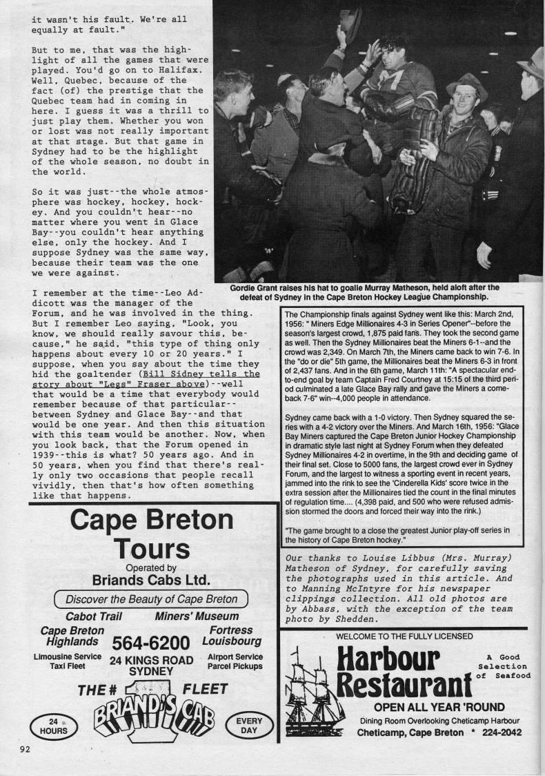 Published by Ronald Caplan on 1989/2/1 (707 reads)it wasn't his fault. We're all equally at fault." But to me, that was the high? light of all the games that were played. You'd go on to Halifax. Well, Quebec, because of the fact (of) the prestige that the Quebec team had in coming in here. I guess it was a thrill to just play them. Whether you won or lost was not really important at that stage. But that game in Sydney had to be the highlight of the whole season, no doubt in the world. So it was just--the whole atmos? phere was hockey, hockey, hock? ey. And you couldn't hear--no matter where you went in Glace Bay--you couldn't hear anything else, only the hockey. And I suppose Sydney was the same way, because their team was the one we were against. I remember at the time--Leo Ad? dicott was the manager of the Forum, and he was involved in the thing. But I remember Leo saying, "Look, you know, we should really savour this, be? cause," he said, "this type of thing only happens about every 10 or 20 years." I suppose, when you say about the time they hid the goaltender (Bill Sidney tells the story about "Legs" Fraser above)--well that would be a time that everybody would remember because of that particular-- between Sydney and Glace Bay--and that would be one year. And then this situation with this team would be another. Now, when you look back, that the Forum opened in 1939--this is what? 50 years ago. And in 50 years, when you find that there's real? ly only two occasions that people recall vividly, then that's how often something like that happens. Gordie Grant raises his hat to goalie Murray Matheson, held aloft after the defeat of Sydney in the Cape Breton Hockey League Championship. Cape Breton Tours operated by Briands Cabs Ltd. 'Discover the Beauty of Cape Breton ) Cabot Trail Miners'Museum Cape Breton Fortress Highlands 564-6200 louisbourg Airport Service Parcel Pickups '??'T/Jm''r'''' 24 KINGS ROAD Taxi Fleet SYDNEY THE* The Championship finals against Sydney went like this: March 2nd, 1956:" Miners Edge Millionaires 4-3 in Series Opener"--before the season's largest crowd, 1,875 paid fans. They took the second game as well. Then the Sydney Millionaires beat the Miners 6-1--and the crowd was 2,349. On March 7th, the Miners came back to win 7-6. In the "do or die" 5th game, the Millionaires beat the Miners 6-3 in front of 2,437 fans. And in the 6th game, March 11th: "A spectacular end- to-end goal by team Captain Fred Courtney at 15:15 of the third peri? od culminated a late Glace Bay rally and gave the Miners a come? back 7-6" win-4,000 people in attendance. Sydney came back with a 1-0 victory. Then Sydney squared the se? ries with a 4-2 victory over the Miners. And March 16th, 1956: "Glace Bay Miners captured the Cape Breton Junior Hockey Championship in dramatic style last night at Sydney Forum when they defeated Sydney Millionaires 4-2 in overtime, in the 9th and deciding game of their final set. Close to 5000 fans, the largest crowd ever in Sydney Forum, and the largest to witness a sporting event in recent years, jammed into the rink to see the 'Cinderella Kids' score twice in the extra session after the Millionaires tied the count in the final minutes of regulation time.... (4,398 paid, and 500 who were refused admis? sion stormed the doors and forced their way into the rink.) 'The game brought to a close the greatest Junior play-off series in the history of Cape Breton hockey." Our thanks to Louise Libbus (Mrs. Murray) Matheson of Sydney, for carefully saving the photographs used in this article. And to Manning Mclntyre for his newspaper clippings collection. All old photos are by Abbass, vith the exception of the team photo by Shedden. WELCOME TO THE FULLY LICENSED Harbour Restaurant A Good Selection of Seafood OPEN ALL YEAR 'ROUND Dining Room Overlooking Cheticamp Harbour Cheticamp, Cape Breton * 224-2042