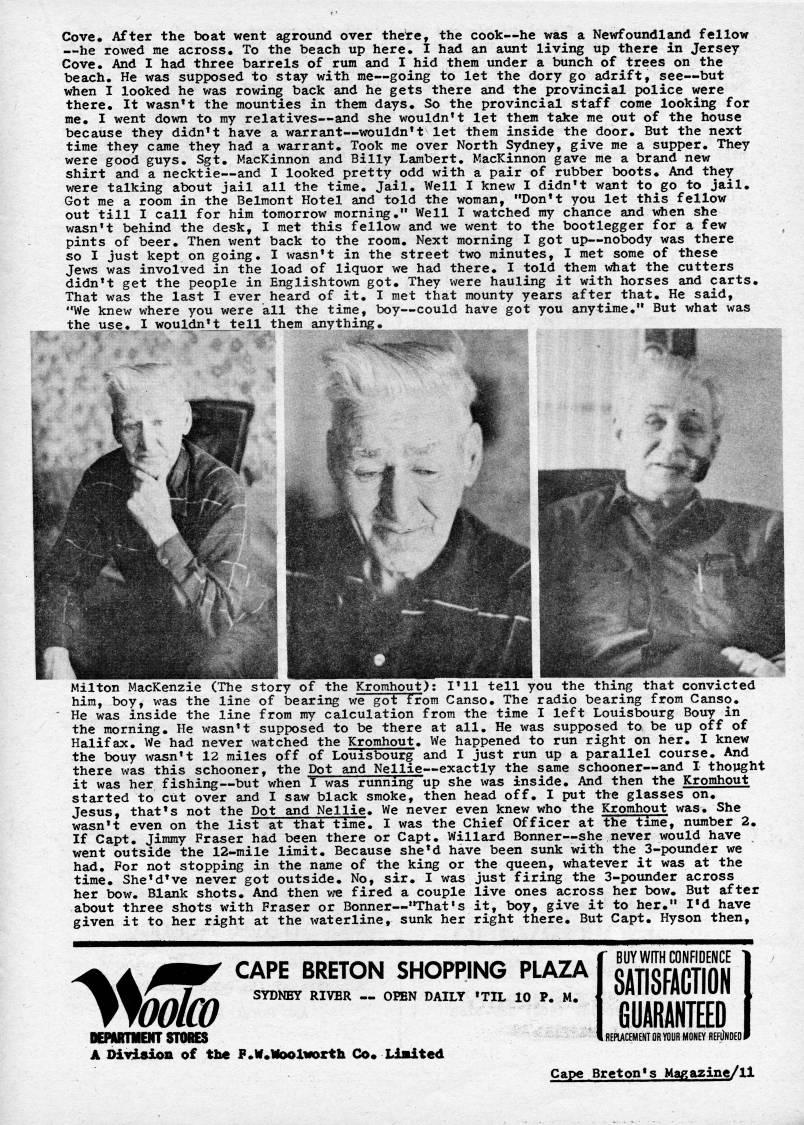 Published by Ronald Caplan on 1975/6/1 (782 reads)Cove. After the boat went aground over there, the cook • he was a Newfoundland fellow • he rowed me across. To the beach up here. I had an aunt living up there in Jersey Cove. And I had three barrels of rura and I hid thera under a bunch of trees on the beach. He was supposed to stay with rae • going to let the dory go adrift, see • but when I looked he was rowing back and he gets there and the provincial police were there. It wasn't the raounties in them days. So the provincial staff corae looking for rae. I went down to my relatives • and she wouldn't let them take rae out of the house because they didn't have a warrant • wouldn't let thera inside the door. But the next tirae they carae they had a warrant. Took rae over North Sydney, give me a supper. They were good guys. Sgt. MacKinnon and Billy Lambert. MacKinnon gave me a brand new shirt and a necktie • and I looked pretty odd with a pair of rubber boots. And they were talking about jail all the time. Jail. Well I knew I didn't want to go to jail. Got rae a roora in the Belmont Hotel and told the woman, "Don't you let this fellow out till I call for him tomorrow morning." Well I watched my chance and when she wasn't behind the desk, I met this fellow and we went to the bootlegger for a few pints of beer. Then went back to the room. Next morning I got up • nobody was there so I just kept on going, I wsisn't in the street two minutes, I met some of these Jews was involved in the load of liquor we had there. I told them what the cutters didn't get the people in Englishtown got. They were hauling it with horses and carts. That was the last I ever heard of it. I met that mounty years after that. He said, "We knew where you were all the time, boy • could have got you anytime." But what was the use, I wouldn't tell them anything. Milton MacKenzie (The story of the Kromhout): I'll tell you the thing that convicted him, boy, was the line of bearing we got from Canso. The radio bearing from Canso. He was inside the line frora my calculation from the time I left Louisbourg Bouy in the morning. He wasn't supposed to be there at all. He was supposed to be up off of Halifax. We had never watched the Kromhout. We happened to run right on her. I knew the bouy wasn't 12 miles off of Louisbourg and I just run up a parallel course. And there was this schooner, the Dot and Nellie • exactly the sarae schooner • and I thought it was her fishing • but when I was running up she was inside. And then the Krorahout started to cut over and I saw black smoke, then head off. I put the glasses on. Jesus, that's not the Dot and Nellie. We never even knew who the Krorahout was. She wasn't even on the list at that tirae. I was the Chief Officer at the tirae, nuraber 2. If Capt. Jiraray Fraser had been there or Capt. Willard Bonner • she never would have went outside the 12-mile limit. Because she'd have been sunk with the 3-pounder we had. For not stopping in the name of the king or the queen, whatever it was at the time. She'd've never got outside. No, sir. I was just firing the 3-poimder across her bow. Blank shots. And then v;e fired a couple live ones across her bow. But after about three shots with Fraser or Bonner • "That?s it, boy, give it to her." I*d have given it to her right at the waterline, sunk her right there. But Capt. Hyson then. CAPE BRETON SHOPPING PLAZA SYDNEY RIVER • OPEN DAILY 'TIL 10 P. M. BEMRTMENT STORES A Oiyisioii of the F.W.Iioolworth Co, LiiUted BUY WfTH CONFIDENCE SATISFACTION GUARANTEED REPIACEMENT OR YOUR MONEY REFIINOEO Cape Breton's Maf'azine/ll