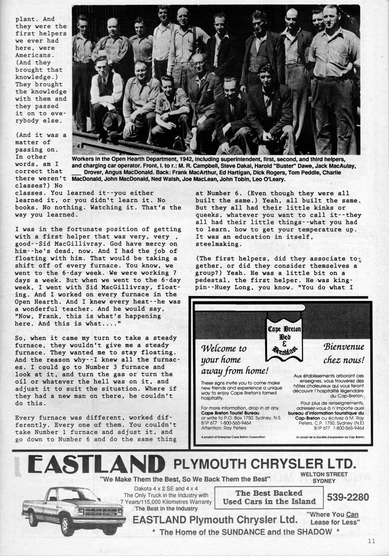 Published by Ronald Caplan on 1989/8/1 (239 reads)plant. And they were the first helpers we ever had here, were Americans. (And they brought that knowledge.) They brought the knowledge with them and they passed it on to eve? rybody else. (And it was a matter of passing on. In other words, am I correct that there weren't classes?) No classes. You learned it--you either learned it, or you didn't learn it. No books. No nothing. Watching it. That's the way you learned. I was in the fortunate position of getting with a first helper that was very, very , good--Sid MacGillivray. God have mercy on him--he's dead, now. And I had the jolj of floating with him. That would be taking a shift off of every furnace. You know, we went to the 6-day week. We were working 7 days a week. But when we went to the 6-day week, I went with Sid MacGillivray, float? ing. And I worked on every furnace in the Open Hearth. And I knew every heat--he was a wonderful teacher. And he would say, "Now, Frank, this is what's happening here. And this is what...." So, when it came my turn to take a steady furnace, they wouldn't give me a steady furnace. They wanted me to stay floating. And the reason why--I knew all the furnac? es . I could go to Number 3 furnace and look at it, and turn the gas or turn the oil or whatever the hell was on it, and adjust it to suit the situation. Where if they had a new man on there, he couldn't do this. Every furnace was different, worked dif? ferently. Every one of them. You couldn't take Number 1 furnace and adjust it, and go down to Number 6 and do the same thing Workers in the Open Hearth Department, 1942, including superintendent, first, second, and third helpers, and charging car operator. Front, I. to r.: M. R. Campbell, Steve Dakai, Harold "Buster" Dawe, Jack MacAulay, Drover, Angus MacDonald. Back: Frank MacArthur, Ed Hartigan, Dick Rogers, Tom Peddle, Charlie MacDonald, John MacDonald, Ned Walsh, Joe MacLean, John Tobin, Leo O'Leary. at Number 6. (Even though they were all built the same.) Yeah, all built the same. But they all had their little kinks or queeks, whatever you want to call it--they all had their little things--what you had to learn, how to get your temperature up. It was an education in itself, steelmaking. (The first helpers, did they associate to' gether, or did they consider themselves a group?) Yeah. He was a little bit on a pedestal, the first helper. He was king? pin- -Huey Long, you know. "You do what I Welcome to your fiomz away from fiotne! These signs invite you to come mal