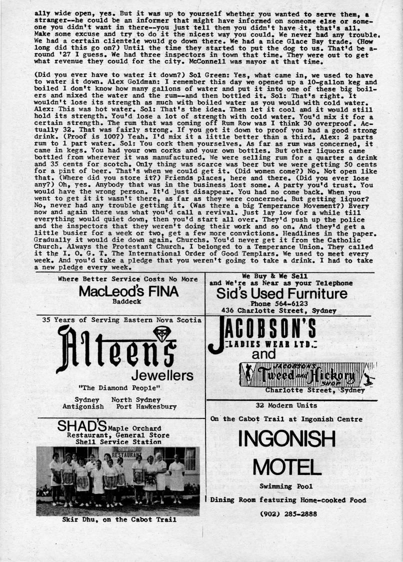 Published by Ronald Caplan on 1975/6/1 (399 reads)ally wide open, yes. But it was up to yourself whether you wanted to serve them, a stranger • he could be an informer that might have informed on soraeone else or some? one you didn't want in there • you just tell thera you didn't have it, that's all. Make some excuse and try to do it the nicest way you could. We never had any trouble. We had a certain clientele would go down there. We had a nice Glace Bay trade. (How long did this go on?) Until the tirae they started to put the dog to us. That'd be a- round '27 I guess. We had three inspectors in town that tirae. They were out to get what revenue they could for the city. McConnell was raayor at that time. (Did you ever have to water it down?) Sol Green: Yes, what came in, we used to have to water it down. Alex Goldman: I reraeraber this day we opened up a 10-gallon keg and boiled I don't know how raany gallons of water and put it into one of these big boil? ers and raixed the water and the rum • and then bottled it. Sol: That's right. It wouldn't lose its strength as ranch with boiled water as you would with cold water. Alex: This was hot water. Sol: That's the idea. Then let it cool and it would still hold its strength. You'd lose a lot of strength with cold water. You'd raix it for a certain strength. The rum that was coraing off Rura Row was I think 30 overproof. Ac? tually 32. That was fairly strong. If you got it down to proof you had a good strong drink. (Proof is 100?) Yeah. I'd raix it a little better than a third. Alex: 2 parts rura to 1 part water. Sol: You cork thera yourselves. As far as rura was concerned, it carae in kegs. You had your own corks and your own bottles. But other liquors carae bottled frora wherever it was raanufactured. We were selling rura for a quarter a drink and 35 cents for scotch. Only thing was scarce was beer but we were getting 50 cents for a pint of beer. That's when we could get it. (Did woraen corae?) No. Not open like that. (Where did you store it?) Friends places, here and there. (Did you ever lose any?) Oh, yes. Anybody that was in the business lost sorae. A party you'd trust. You would have the wrong person. It'd just disappear. You had no corae back. When you went to get it it wasn't there, as far as they were concerned. But getting liquor? No, never had any trouble getting it. (Was there a big Teraperance Movement?) Every now and again there was what you'd call a revival. Just lay low for a while till everything would quiet down, then you'd start all over. They'd push up the police and the inspectors that they weren't doing their work and so on. And they'd get a little busier for a week or two, get a few raore convictions. Headlines in the paper. Gradually it would die down again. Churchs. You'd never get it frora the Catholic Church. Always the Protestant Church. I belonged to a Teraperance Union. They called it the I. O. G. T. The International Order of Good Teraplars. We used to meet every week. And you'd take a pledge that you weren't going to take a drink. I had to take a new pledge every week. Where Better Service Costs No More MacLeod's FINA Baddeck We Buy & We Sell and We're as Near as your Telephone Sid s Used Furniture Phone 564-.6123 436 Charlotte Street, Sydney J 35 Years of Serving Eastern Nova Scotia '' r . ikir r ACOBSON'S LRBIES WEAR ITl.: and Jewellers "The Diamond People" Sydney Antigonish North Sydney Port Hawkesbury SHADS Maple Orchard Restaurant, General Store Shell Service Station Skir Dhtt, on the Cat>ot Trail 32 Modern Units On the Cabot Trail at Ingonish Centre INGONISH MOTEL Swimming Pool Dining Room featuring Home-cooked Pood (902) 285-2888