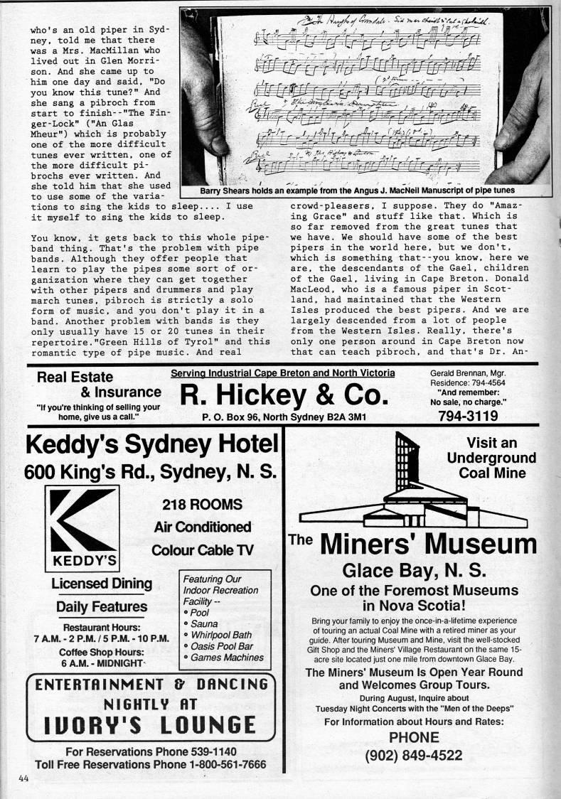 who's an old piper in Syd? ney, told me that there was a Mrs. MacMillan who lived out in Glen Morri? son. And she came up to him one day and said, "Do you know this tune?" And she sang a pibroch from start to finish--"The Fin? ger-Lock" ("An Glas Mheur") which is probably one of the more difficult tunes ever written, one of the more difficult pi- brochs ever written. And she told him that she used to use some of the varia? tions to sing the kids to sleep.... I use it myself to sing the kids to sleep. You know, it gets back to this whole pipe- band thing. That's the problem with pipe bands. Although they offer people that learn to play the pipes some sort of or? ganization where they can get together with other pipers and drummers and play march tunes, pibroch is strictly a solo form of music, and you don't play it in a band. Another problem with bands is they only usually have 15 or 20 tunes in their repertoire."Green Hills of Tyrol" and this romantic type of pipe music. And real fil%ip''%' u'. Barry Shears holds an example from the Angus J. MacNeil Manuscript of pipe tunes crowd-pleasers, I suppose. They do "Amaz? ing Grace" and stuff like that. Which is so far removed from the great tunes that we have. We should have some of the best pipers in the world here, but we don't, which is something that--you know, here we are, the descendants of the Gael, children of the Gael, living in Cape Breton. Donald MacLeod, who is a famous piper in Scot? land, had maintained that the Western Isles produced the best pipers. And we are largely descended from a lot of people from the Western Isles. Really, there's only one person around in Cape Breton now that can teach pibroch, and that's Dr. An- Real Estate & Insurance "If you're thinking of selling your home, give us a call." Serving Industrial Cape Breton and North Victoria R. Hickey & Co. p. O. Box 96, North Sydney B2A 3M1 Gerald Brennan, Mgr. Residence: 794-4564 "And remember: No sale, no charge." 794-3119 Keddy's Sydney Hotel 600 King's Rd., Sydney, N. S. KEDDY'S 218 ROOMS Air Conditioned Colour Cable TV Licensed Dining Daily Features Restaurant Hours: 7 A.M. - 2 P.M. / 5 P.M. -10 P.M. Coffee Shop Hours: 6 A.M.-MIDNIGHT Featuring Our Indoor Recreation Facility - '*Pool ?> Sauna ?? Whirlpool Bath ? Oasis Pool Bar • Games Machines ENTERTAINMENT & DRNCING NIGHTLY RT lUORV'S LOUNGE For Reservations Phone 539-1140 Toll Free Reservations Phone 1-800-561-7666 Visit an Underground Coal Mine ''' Miners' Museum Glace Bay, N. S. One of the Foremost Museums in Nova Scotia! Bring your family to enjoy the once-in-a-lifetime experience of touring an actual Coal Mine with a retired miner as your guide. After touring Museum and Mine, visit the well-stocked Gift Shop and the Miners' Village Restaurant on the same 15- acre site located just one mile from downtown Glace Bay. The Miners' Museum Is Open Year Round and Welcomes Group Tours. During August, Inquire about Tuesday Night Concerts with the "Men of the Deeps" For Information about Hours and Rates: PHONE (902) 849-4522