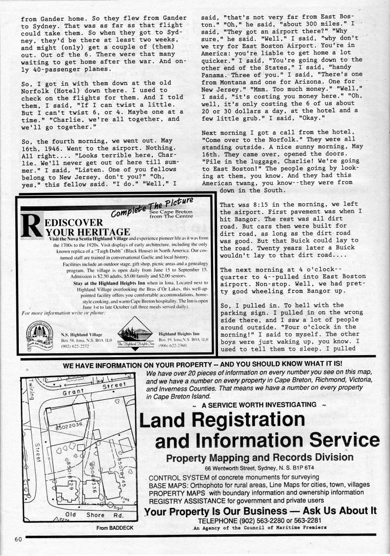 from Gander home. So they flew from Gander to Sydney. That was as far as that flight could take them. So when they got to Syd? ney, they'd be there at least two weeks, and might (only) get a couple of (them) out. Out of the 6. There were that many waiting to get home after the war. And on? ly 40-passenger planes. So, I got in with them down at the old Norfolk (Hotel) down there. I used to check on the flights for them. And I told them, I said, "If I can twist a little. But I can't twist 6, or 4. Maybe one at a time." "Charlie, we're all together, and we'll go together." So, the fourth morning, we went out. May 16th, 1946. Went to the airport. Nothing. All right.... "Looks terrible here, Char? lie. We'll never get out of here till sum? mer." I said, "Listen. One of you fellows belong to New Jersey, don't you?" "Oh, yes," this fellow said. "I do." "Well," I said, "that's not very far from East Bos? ton." "Oh," he said, "about 300 miles." I said, "They got an airport there?" "Why sure," he said. "Well," I said, "why don't we try for East Boston Airport. You're in America: you're liable to get home a lot quicker." I said, "You're going down to the other end of the States," I said, "handy Panama. Three of you." I said, "There's one from Montana and one for Arizona. One for New Jersey." "Mmm. Too much money." "Well," I said, "it's costing you money here." "Oh, well, it's only costing the 6 of us about 20 or 30 dollars a day, at the hotel and a few little grub." I said, "Okay." Next morning I got a call from the hotel, "Come over to the Norfolk." They were all standing outside. A nice sunny morning. May 16th. They came over, opened the doors. "Pile in the luggage, Charlie! We're going to East Boston!" The people going by look? ing at them, you know. And they had this American twang, you know--they were from I down in the South. R Ooi'i EDISCOVER YOUR HERITAGE ''t'i -pjc-pure Cape Breton V isit the Nova Scotia Highland Village and experience pioneer life as it was from the 17()0s to the 1920s. Visit displays of early architecture, including the only known replica of a "Taigh Dubh" (Black House) in North America. Our cos? tumed staff are trained in conversational Gaelic and local history. Facilities include an outdoor stage, gift shop, picnic areas and a genealogy program. The village is open daily from June 15 to September 15. Admission is $2.50 adults. $5.00 family and $2.00 seniors. Stay at the Highland Heights Inn when in lona. Located next to Highland Village overlooking the Bras d'Or Lakes, this well-ap? pointed facility offers you comfortable accommodations, home- style cooking, and warm Cape Breton hospitality. The Inn is open June 1st to late October (all three meals served daily). [formation write or phone: N.S. Highland Village Box .SX. lona. N.S. BOA ILO Highland Heights Inn Box m lona S BOA 1 That was 8:15 in the morning, we left the airport. First pavement was when I hit Bangor. The rest was all dirt road. But cars then were built for dirt road, as long as the dirt road was good. But that Buick could lay to the road. Twenty years later a Buick wouldn't lay to that dirt road.... The next morning at 4 o'clock-- quarter to 4--pulled into East Boston airport. Non-stop. Well, we had pret? ty good wheeling from Bangor up. So, I pulled in. To hell with the parking sign. I pulled in on the wrong side there, and I saw a lot of people around outside. "Four o'clock in the morning!" I said to myself. The other boys were just waking up, you know. I used to tell them to sleep. I pulled WE HAVE INFORMATION ON YOUR PROPERTY - AND YOU SHOULD KNOW WHAT IT IS! We have over 20 pieces of information on every number you see on ttiis map, and we have a number on every property in Cape Breton, Richmond, Victoria, and Inverness Counties. That means we have a number on every property in Cape Breton island. ~ A SERVICE WORTH INVESTIGATING ~ Land Registration and Information Service Property Mapping and Records Division 66 Wentworth Street, Sydney, N. S. B1P 6T4 CONTROL SYSTEM of concrete monuments for surveying BASE MAPS: Orthophoto for rural areas, Line Maps for cities, town, villages PROPERTY MAPS with boundary information and ownership information REGISTRY ASSISTANCE for government and private users Your Property Is Our Business • Ask Us About It TELEPHONE (902) 563-2280 or 563-2281 .An Agency of the Council of Maritime Premiers From BADDECK
