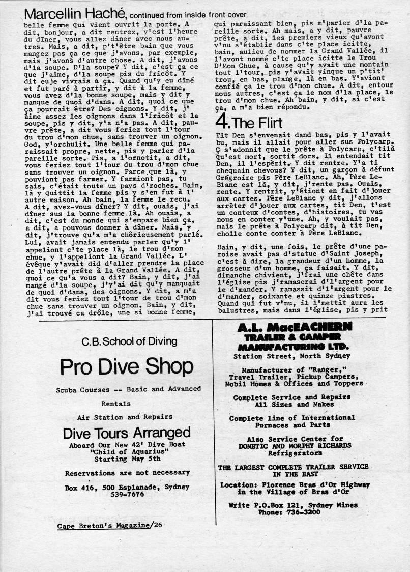 Published by Ronald Caplan on 1975/6/1 (346 reads)Marcellin Hache, continued from inside belle femme qui vient ouvrit la porte. A dit, bonjour, a dit rentrez, y'est I'heure du diner, vous allez diner avec nous au? tres. Mais, a dit, p't'??tre bain que vous mangez pas 5a ce que j'avons, par exemple, mais j'avons d'autre chose. A dit, j'avons d'la soupe. D'la soupe? Y dit, c'est 5a ce que j'aime, d'la soupe pis du fric6t. Y dit euje vivrais a ??a. Quand qu'y eu dine et fut pare a partir, y dit ' la femme, vous avez d'la bonne soupe, mais y dit y raanque de quoi d'dans. A dit, quoi ce que 5a pourrait 6tre? Des oignons. Y dit, j' aime assez les oignons dans 1'fricot et la soupe, pis y dit, y'a n'a pas. A dit, pau? vre prSte, a dit vous feriez tout I'tour du trou d'mon chue, sans trouver un oignon. God, y'orchulit. Une belle femrae qui pa- raissait propre, nette, pis y parler d'la pareille sorte. Pis, a I'ornotit, a dit, vous feriez tout I'tour du trou d'raon chue sans trouver un oignon. Parce.que la, y pouviont pas farmer. Y farraiont pas, tu sais, c'etait toute un pays d'roches. Bain, la y quittit la femrae pis y s'en fut a 1' autre raaison. Ah bain, la femme le recu. A dit, avez-vous diner? Y dit, ouais, j'ai diner sus la bonne ferame la. Ah ouais, a dit, c'est du monde qui s'empare bien 'a, a dit, a pouvous donner a diner. Mais, y dit, j'trouve qu'a ra'a chorieuseraent parle. Lui, avait jamais entendu parler qu'y 1' appeliont c'te place la, le trou d'mon chue, y I'appeliont la Grand Vallee. L' evSque y'avait did d'aller prendre la place de 1'autre pr'te a la Grand Vallee. A ditj quoi ce qu'a vous a dit? Bain, y dit, j'ai mange d'la soupe, j'y'ai dit qu'y manquait de quoi d'dans, des oignons. Y dit, a m'a dit vous feriez tout I'tour de trou d'mon chue sans trouver un oignon. Bain, y dit, j'ai trouve ca drSle, une si bonne femme. front cover qui paraissant bien, pis m'parler d'la pa? reille sorte. Ah mais, a y dit, pauvre prete, a dit, les premiers vieux qu'avont v'nu s''tablir dans c'te place icitte, bain, aulieu de nommer la Grand Vallee, il 1'avont nomme c'te place icitte le Trou D'Mon Chue, a cause qu'y avait une raontain tout I'tour, pis y'avait yinque un p'tit' trou, en bas, plange, la en bas. Y'aviont confi' 9a le trou d'mon chue. A dit, entour nous autres, c'est 9a le nom d'la place, le trou d'mon chue. Ah bain, y dit, si c'est ca, a ra'a bien repondu. 4.The Flirt Tit Den s'envenait dand bas, pis y 1'avait bu, raais il allait pour aller sus Polycarp. 5 s'adonnit que le pr'te ' Polycarp, c'tila qu'est raort, sortit dors. II entendait tit Den, il 1'esperit.-Y dit rentre. Y'a ti chequain chevous? Y dit, un garcon a d'funt Gr'roire pis Pere LeBlanc. Ah, P're Le? Blanc est la, y dit, j*rente pas. Ouais, rente. Y" rentrit, y''tiont en fait d'jouer aux cartes. Pere LeBlanc y dit, j'allons arr'ter d'jouer aux cartes, tit Den, t'est un conteux d'contes, d'histoires, tu vas nous en conter y'une. Ah, y voulait pas, raais le pr'te ' Polycarp dit, a tit Den, cholle conte conter a Pere LeBlanc. Bain, y dit, une fois, le prete d'une pa? roise avait pas d'statue d'Saint Joseph, c'est ' dire, la grandeur d'lm horarae, la grosseur d'un horarae, 5a faisait.'Y d,it, diraanche chivient, j'irai une chete dans 1'eglise pis j'raraaserai d'l'argent pour le d'mander. Y ramassit d'l'argent pour le d'raander, soixante et quinze piastres. Quand qui fut v'nu, il I'raettit aura les balustres, raais dans l'%lise, pis y prit C.B.School Of Diving Pro Dive Shop Scuba Courses • Basic and Advanced Rentals Air Station and Repairs Dive Tours Arranged Aboard Our New 42? Dive Boat "Child of Aquarius" Starting May 5th Reservations are not necessary Box 416, 500 Esplanade, Sydney 539-7676 Cape Breton's Magazine/26 AeLe MacBACmmi niiMUII a CAMHR Station Street, North Sydney Manufacturer of "Ranger," Travel Trailer, Pickup Campers, Mobil Homes & Offices and Toppers Complete. Service and Repairs All Sizes and Makes Complete line of International Pumaces and Parts Alsp Service Center for DOMETIC AND MCKUPHY RICHARDS Ref rigeratoris THB tARGBST COMFLBTB tRAlLBR SBRVICB IN THE BAST Location: Florence Bras d'Or Highway in the Village of Bras d'Or Wtite P.O.Box 121, Sydney Mines Phone: 736-3200