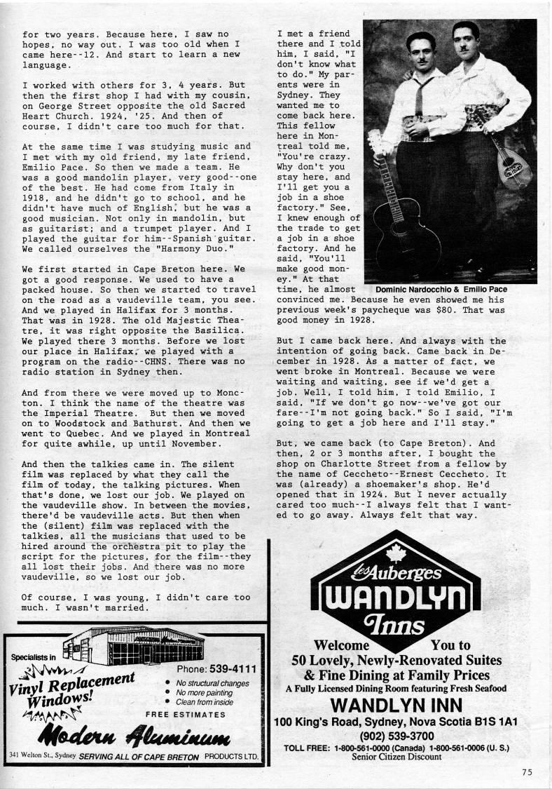 Published by Ronald Caplan on 1990/1/1 (287 reads)for two years. Because here, I saw no hopes, no way out. I was too old when I came here--12. And start to learn a new language. I worked with others for 3, 4 years. But then the first shop I had with my cousin, on George Street opposite the old Sacred Heart Church. 1924, '25. And then of course, I didn't care too much for that. At the same time I was studying music and I met with my old friend, my late friend, Emilio Pace. So then we made a team. He was a good mandolin player, very good--one of the best. He had come from Italy in 1918, and he didn't go to school, and he didn't have much of English,' but he was a good musician. Not only in mandolin, but as guitarist; and a trumpet player. And I played the guitar for him--Spanish guitar. We called ourselves the "Harmony Duo." We first started in Cape Breton here. We got a good response. We used to have a packed house. So then we started to travel on the road as a vaudeville team, you see. And we played in Halifax for 3 months. That was in 1928. The old Majestic Thea? tre, it was right opposite the Basilica. We played there 3 months. Before we lost our place in Halifax, we played with a program on the radio--CHNS. There was no radio station in Sydney then. And from there we were moved up to Monc? ton. I think the name of the theatre was the Imperial Theatre. But then we moved on to Woodstock and Bathurst. And then we went to Quebec. And we played in Montreal for quite awhile, up until November. And then the talkies came in. The silent film was replaced by what they call the film of today, the talking pictures. When that's done, we lost our job. We played on the vaudeville show. In between the movies, there'd be vaudeville acts. But then when the (silent) film was replaced with the talkies, all the musicians that used to be hired around the orchestra pit to play the script for the pictures, for the film--they all lost their jobs. And there was no more vaudeville, so we lost our job. Of course, I was young, I didn't care too much. I wasn't married. Specialists in 341 Welton St., Sydney SERVING ALL OF CAPE BRETON PRODUCTS LTD. Phone:539-4111 • No structural changes • No more painting • Clean from inside FREE ESTIMATES I met a friend there and I told| him, I said, "I don't know what to do." My par? ents were in Sydney. They wanted me to come back here. This fellow here in Mon? treal told me, "You're crazy. Why don't you stay here, and I'11 get you a job in a shoe factory." See, I knew enough of I the trade to get | a job in a shoe factory. And he said, "You'll make good mon? ey ." At that time, he almost Dominic Nardocchio & Emilio Pace convinced me. Because he even showed me his previous week's paycheque was $80, That was good money in 1928. But I came back here. And always with the intention of going back. Came back in De? cember in 1928. As a matter of fact, we went broke in Montreal. Because we were waiting and waiting, see if we'd get a job. Well, I told him, I told Emilio, I said, "If we don't go now--we've got our fare--I'm not going back'." So I said, "I'm going to get a job here and I'll stay." But, we came back (to Cape Breton). And then, 2 or 3 months after, I bought the shop on Charlotte Street from a fellow by the name of Ceccheto--Ernest Ceccheto. It was (already) a shoemaker's shop. He'd opened that in 1924. But i never actually cared too much--I always felt that I want? ed to go away. Always felt that way. Siuberges lUjnnDLvn Inns Welcome'''' You to 50 Lovely, Newly-Renovated Suites & Fine Dining at Family Prices A Fully Licensed Dining Room featuring Fresh Seafood WANDLYN INN 100 King's Road, Sydney, Nova Scotia BIS 1A1 (902) 539-3700 TOLL FREE: 1-800-561-0000 (Canada) 1-800-561-0006 (U. S.) Senior Citizen Discount