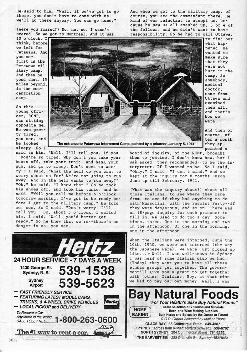 Published by Ronald Caplan on 1990/1/1 (196 reads)He-said to him, "Well, if we've got to go there, you don't have to come with us. We'll go there anyway. You can go home." (Were you scared?) No, no, no, I wasn't scared. So we got to Montreal. And it was 10 o'clock, I think, before we left for Petawawa. And you see, first is the Petawawa mil? itary camp. And then be? yond that, 15 miles beyond, is the con? centration camp. So this young offi? cer, RCMP, was sitting opposite me. He was pret? ty tired, you see, and he looked sleepy. So I said to him, "Well, I'll tell you. If you --you're so tired. Why don't you take your boots off, take your tunic, and hang your gun, and go to sleep. Don't need to wor? ry." I said, "What the hell do you want to worry about us for? We're not going to run away. Who in the hell wants to run away?" "Oh," he said, "I know that." So he took his shoes off, and took his tunic, and he said, "Will you call me before 6 o'clock tomorrow morning. I've got to be ready be? fore I get to the military camp." He told me, see. So I said, "Don't worry, I'll call you." So, about 5 o'clock, I called him. I said, "Well, you'd better get ready." So he knew that we're--there's no danger in us, you see. Hertz 24 HOUR SERVICE - 7 DAYS A WEEK 1430 George St. Sydney, N. S. 539-1538 539-5623 Sydney Airport • FAST FRIENDLY SERVICE • FEATURING LATEST MODEL CARS, TRUCKS, & 4-WHEEL DRIVE VEHICLES f'Bftzi • LOCAL PICKUP and DELIVERY To Reserve a Car 'r'rRsT.l..- -800-263-0600 The #1 way to rent a car. And when we got to the military camp, of course, you see the commandant there. He kind of was reluctant to accept us, be? cause he saw us all smashed up, 3 or 4 of the fellows, and he didn't want to have responsibility. So he had to call Ottawa, to find out what hap? pened. He wanted to make sure that they were not hurt in the camp. So somebody, medical doctdr, came from Ottawa and examined them all. And that's how we were. And then of course, af? ter a month they ap? pointed a board of inquiry, of the RCMP, brought them to justice. I don't know how, but I was asked--they recommended--to be the in? terpreter. If I wanted to be. So I said, "Okay," I said. "I don't mind." And we kept at the inquiry for 8 months. From June up till February, 1941. (What was the inquiry about?) About all those Italians, to see where they came from, to see if they had anything to do with Mussolini, with the Fascist Party--if they were dangerous, and so on. There was an 18-page inquiry for each prisoner to fill in. We used to do two a dayl Some? times, three. One in the morning and two in the afternoon. Or one in the morning, one in the afternoon. When the Italians were interned, June the 10th, 1940, we were not interned (the way the Japanese were). We were just picked up like. ...? Well, I was well-known in Sydney. I was head of some Italian club we had. (Today) they want you to have all these ethnic groups get together. The govern? ment '11 give you a grant to get together with (other) Italians. Boy, at that time we had to pay our own money. Well, I was 80 Natural Foods 'For Your Health's Sake Buy Natural Foods" Great Selection of Vitamins and Minerals Beer- and Wine-Mal