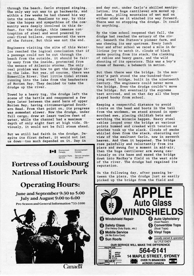 Published by Ronald Caplan on 1990/6/1 (326 reads)through the beach. Carlo stopped singing. The only way out was to go backwards, and within a few weeks he had chewed his way into the ocean. Needless to say, by this time the hopes and sympathies of the com? munity were deeply involved in this de? feat, for the drudge, this immense con? traption of steel and wood powered by coal-fired boilers, represented the wave of the future. But this was not the end. Engineers visiting the site of this Water? loo reached the logical conclusion that if a passage could not be cut through the . beach from the outside, it should be fair? ly easy from the inside, protected from the menace of Atlantic storms. The only real problem was how to get the drudge in? to the lake. But yes, of course, there was Homeville River, that little tidal stream running into the lake from the headwaters of Morien Bay. They decided to take the drudge up the river. Towed by a heavy tug, the drudge left the scene of the battle and reappeared a few days later between the sand bars of upper Morien Bay, having circumnavigated South? ern Head. From that point on, its progress was somewhat slower. Now the drudge, under full cargo, drew at least twelve feet of water, while the channel had a maximum depth of only eight feet at high tide. Ob? viously, it would not be full steam ahead. But we still had faith in the drudge. De? spite its first defeat, it would not let us down--too much depended on it. Day in ?? '??1 Environment Environnement ?? 'B Canada Canada Canadian Parl