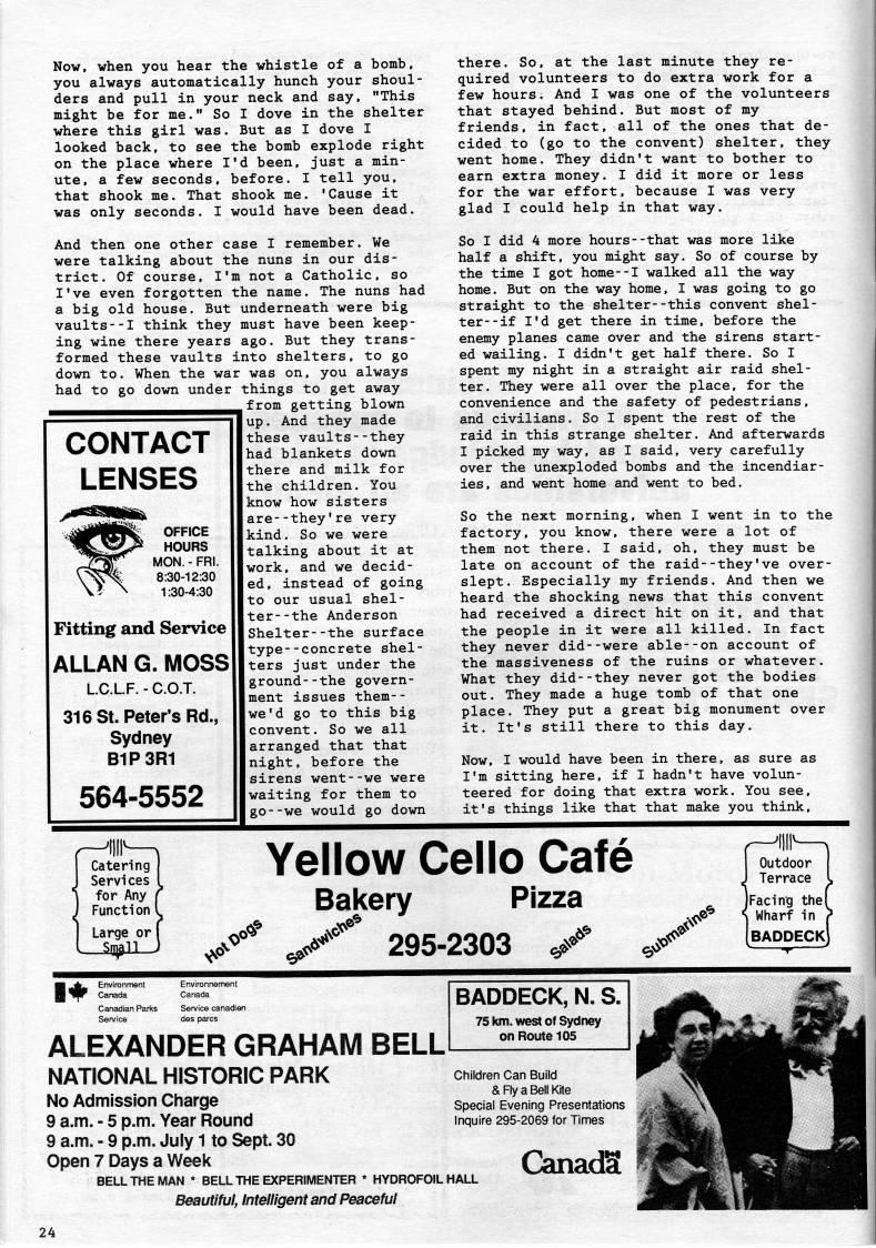 Published by Ronald Caplan on 1990/6/1 (256 reads)Now, when you hear the whistle of a bomb, you always automatically hunch your shoul? ders and pull in your neck and say, "This might be for me." So I dove in the shelter where this girl was. But as I dove I looked back, to see the bomb explode right on the place where I'd been, just a min? ute, a few seconds, before. I tell you, that shook me. That shook me. 'Cause it was only seconds. I would have been dead. And then one other case I remember. We were talking about the nuns in our dis? trict. Of course, I'm not a Catholic, so I've even forgotten the name. The nuns had a big old house. But underneath were big vaults--I think they must have been keep? ing wine there years ago. But they trans? formed these vaults into shelters, to go down to. When the war was on, you always had to go down under things to get away from getting blown up. And they made these vaults- -they had blankets down there and milk for the children. You know how sisters are--they're very kind. So we were talking about it at work, and we decid? ed, instead of going to our usual shel? ter- -the Anderson Shelter--the surface type--concrete shel? ters just under the ground--the govern? ment issues them-- we'd go to this big convent. So we all arranged that that night, before the sirens went--we were waiting for them to go--we would go down CONTACT LENSES Fitting and Service ALLAN G. MOSS LC.LF. - C.O.T. 316 St. Peter's Rd., Sydney B1P3R1 564-5552 there. So, at the last minute they re? quired volunteers to do extra work for a few hours. And I was one of the volunteers that stayed behind. But most of my friends, in fact, all of the ones that de? cided to (go to the convent) shelter, they went home. They didn't want to bother to earn extra money. I did it more or less for the war effort, because I was very glad I could help in that way. So I did 4 more hours--that was more like half a shift, you might say. So of course by the time I got home--I walked all the way home. But on the way home, I was going to go straight to the shelter--this convent shel? ter- -if I'd get there in time, before the enemy planes came over and the sirens start? ed wailing. I didn't get half there. So I spent my night in a straight air raid shel? ter. They were all over the place, for the convenience and the safety of pedestrians, and civilians. So I spent the rest of the raid in this strange shelter. And afterwards I picked my way, as I said, very carefully over the unexploded bombs and the incendiar? ies, and went home and went to bed. So the next morning, when I went in to the factory, you know, there were a lot of them not there. I said, oh, they must be late on account of the raid--they've over? slept. Especially my friends. And then we heard the shocking news that this convent had received a direct hit on it, and that the people in it were all killed. In fact they never did--were able--on account of the massiveness of the ruins or whatever. What they did--they never got the bodies out. They made a huge tomb of that one place. They put a great big monument over it. It's still there to this day. Now, I would have been in there, as sure as I'm sitting here, if I hadn't have volun? teered for doing that extra work. You see, it's things like that that make you think. Yellow Cello Cafe Bakery Pizza 'o'" Cff' <#*' .x-J'' ' 295-2303 cT '' .d'' ?>' (-'W ' Outdoor ) Terrace L Facing thef Wharf in > baddeck] 1' Environment Canada Canadian Parl