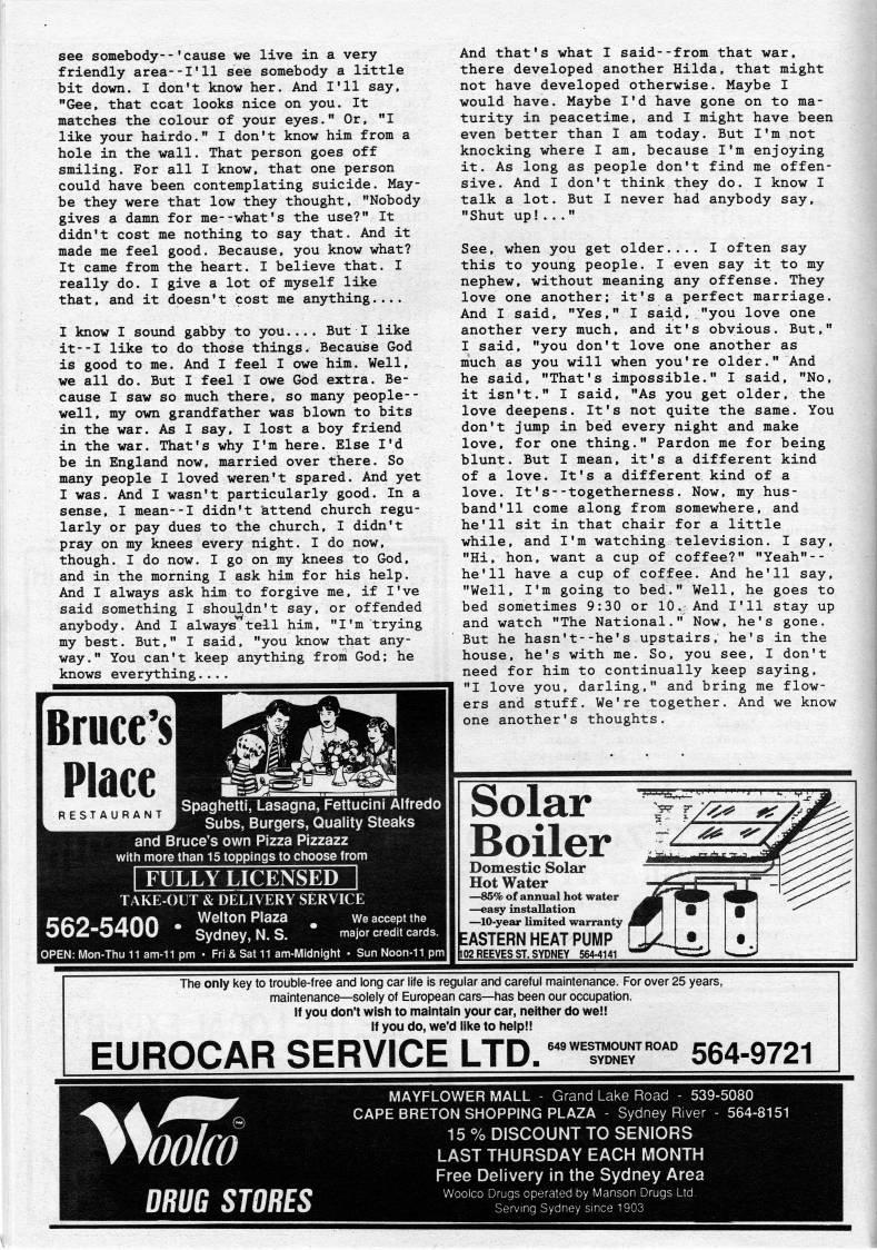 Published by Ronald Caplan on 1990/6/1 (242 reads)see somebody--'cause we live in a very friendly area--I'll see somebody a little bit down. I don't know her. And I'll say, "Gee, that coat looks nice on you. It matches the colour of your eyes." Or, "I like your hairdo." I don't know him from a hole in the wall. That person goes off smiling. For all I know, that one person could have been contemplating suicide. May? be they were that low they thought, "Nobody gives a damn for me--what's the use?" It didn't cost me nothing to say that. And it made me feel good. Because, you know what? It came from the heart. I believe that. I really do. I give a lot of myself like that, and it doesn't cost me anything.... I know I sound gabby to you.... But I like it--I like to do those things. Becauise God is good to me. And I feel I owe him. Well, we all do. But I feel I owe God extra. Be? cause I saw so much there, so many people-- well, my own grandfather was blown to bits in the war. As I say, I lost a boy friend in the war. That's why I'm here. Else I'd be in England now, married over there. So many people I loved weren't spared. And yet I was. And I wasn't particularly good. In a sense, I mean--I didn't 'attend church regu? larly or pay dues to the church, I didn't pray on my knees every night. I do now, though. I do now. I go on my knees to God, and in the morning I ask him for his help. And I always ask him to forgive me, if I've said something I shouldn't say, or offended anybody. And I always tell him, "I'm trying my best. But," I said, "you know that any? way." You can't keep anything from God; he knows everything... And that's what I said--from that war, there developed another Hilda, that might not have developed otherwise. Maybe I would have. Maybe I'd have gone on to ma? turity in peacetime, and I might have been even better than I am today. But I'm not knocking where I am, because I'm enjoying it. As long as people don't find me offen? sive. And I don't think they do. I know I talk a lot. But I never had anybody say, "Shut up!..." See, when you get older.... I often say this to young people. I even say it to my nephew, without meaning any offense. They love one another; it's a perfect marriage. And I said, "Yes," I said,."you love one another very much, and it's obvious. But," I said, "you don't love one another as much as you will when you're older." And he said, "That's impossible." I said, "No, it isn't." I said, "As you get older, the love deepens. It's not quite the same. You don't jump in bed every night and make love, for one thing." Pardon me for being blunt. But I mean, it's a different kind of a love. It's a different kind of a love. It's--togetherness. Now, my hus? band '11 come along from somewhere, and he'll sit in that chair for a little while, and I'm watching television. I say, "Hi, hon, want a cup of coffee?" "Yeah"-- he'll have a cup of coffee. And he'll say, "Well, I'm going to bed." Well, he goes to bed sometimes 9:30 or 10. And I'll stay up and watch "The National." Now, he's gone. But he hasn't--he's upstairs, he's in the house, he's with me. So, you see, I don't need for him to continually keep saying, "I love you, darling," and bring me flow? ers and stuff. We're together. And we know one another's thoughts. Solar Boiler Domestic Solar Hot Water • 85% of annual hot water • easy installation • 10-year limited warranty ASTERN HEAT PUMP 102 REEVES ST. SYDNEY 564-4141 The only key to trouble-free and long car life is regular and careful maintenance. For over 25 years, maintenance • solely of European cars • has been our occupation. If you don't wish to maintain your car, neither do we!! If you do, we'd like to help!! EUROCAR SERVICE LTD. 649 WESTMOUNT ROAD SYDNEY 564-9721 MAYFLOWER MALL - Grand L CAPE BRETON SHOPPING PLAZA 539-5080 iver - 564-8151 DRUG STORES 15 % DISCOUNT TO SENIORS LAST THURSDAY EACH MONTH Free Delivery in the Sydney Area