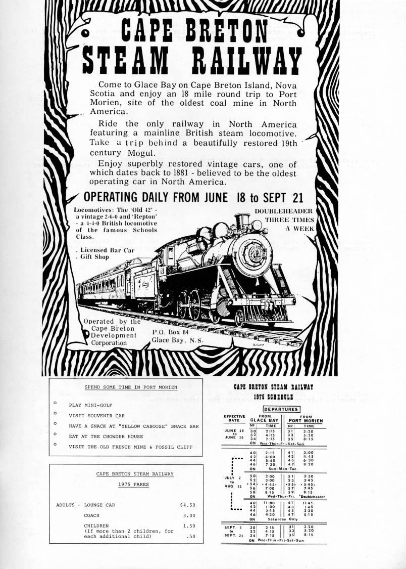 STEAM RAILWAY Come to Glace Bay on Cape Breton Island, Nova Scotia and enjoy an 18 mile round trip to Port Morien, site of the oldest coal mine in North .. America. Ride the only railway in North America featuring a mainline British steam locomotive. Take a trip behind a beautifully restored 19th century Mogul. Enjoy superbly restored vintage cars, one of which dates back to 1881 - believed to be the oldest operating car in North America. OPERATING DAILY FROM JUNE 18 to SEPT 21 Locomotives: Tiie Old 42' - a vintage 2-(i-0 and 'Kepton' - a l-t-0 British locomotive of the famous Schools Class. . Licensed Bar Car . Gift Shop DOUBLEHEAUEK THREE TIMES j A week! 'Operated by the Cape Breton 'Development , Corporation P.O. Box 84 .Glace Bay, N.S. SPEND SOME TIME IN PORT MORIEN PLAY MINI-GOLF VISIT SOUVENIR CAR HAVE A SNACK AT "YELLOW CABOOSE" SNACK BAR EAT AT THE CHOWDER HOUSE VISIT THE OLD FRENCH MINE & FOSSIL CLIFF ADULTS CAPE BRETON STEAM RAILWAY 1975 FARES - LOUNGE CAR ~ COACH CHILDREN (If more than 2 children, for each additional child) $4.50 3.00 1.50 .50 CAPE BRETON STEAM RAILW&T; 197? SCHEDULE EFFECTIVE DATE JUNE 18 to JUNE 30 Idepar FROM GLACE BAY N? 1 TIME 30 2:15 3 2; 4.15 34! 7:15 rURES[ FROM PORT MORIEN NO TIME 31 33 35 3:20 5:20 8:1 5 Wed-Thur-Fri-Sat-Sur AUG 31 SEPT. 21 50 52 • 54 56 58 ON 40 42 44 46 ON 3 2 34 ON 200 300 . *4:45?? 7 00 8 15 ''1 53! '" 59I Wed-Thur-Fri. n 00 1 41| 1 00 2 45 4 30 1 4 3 4 5 4 7l Saturday Only 7 15 1 311 33 35 Wed-Thur-Fri-Sat-S 330 3 • 5 7 9 45 45?? 45 'Doubleheader 11 45 145 3 30 515 3 20 520