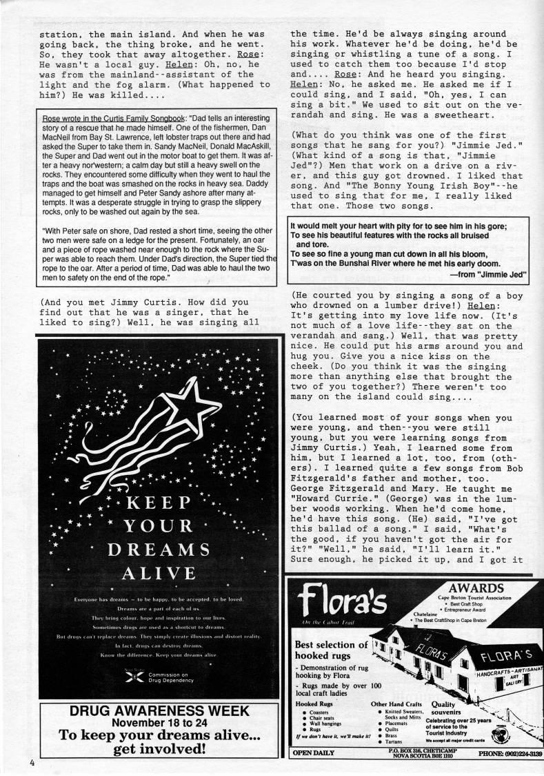 station, the main island. And when he was going back, the thing broke, and he went. So, they took that away altogether. Rose: He wasn't a local guy. Helen: Oh, no, he was from the mainland--assistant of the light and the fog alarm. (What happened to him?) He was killed.... Rose wrote in the Curtis Family Songbook: "Dad tells an interesting story of a rescue that he made himself. One of the fishermen, Dan MacNeil from Bay St. Lawrence, left lobster traps out there and had asked the Super to take them in. Sandy MacNeil, Donald MacAskill, the Super and Dad went out in the motor boat to get them. It was af? ter a heavy nor'western; a calm day but still a heavy swell on the rocks. They encountered some difficulty when they went to haul the traps and the boat was smashed on the rocks in heavy sea. Daddy managed to get himself and Peter Sandy ashore after many at? tempts. It was a desperate struggle in trying to grasp the slippery rocks, only to be washed out again by the sea. "With Peter safe on shore. Dad rested a short time, seeing the other two men were safe on a ledge for the present. Fortunately, an oar and a piece of rope washed near enough to the rock where the Su? per was able to reach them. Under Dad's direction, the Super tied the rope to the oar. After a period of time, Dad was able to haul the two men to safety on the end of the rope." (And you met Jimmy Curtis. How did you find out that he was a singer, that he liked to sing?) Well, he was singing all ,r KEEP • .; • ? * YOUR * DREAMS ALIVE the time. He'd be always singing around his work. Whatever he'd be doing, he'd be singing or whistling a tune of a song. I used to catch them too because I'd stop and.... Rose: And he heard you singing. Helen: No, he asked me. He asked me if I could sing, and I said, "Oh, yes, I can sing a bit." We used to sit out on the ve? randah and sing. He was a sweetheart. (What do you think was one of the first songs that he sang for you?) "Jimmie Jed." (What kind of a song is that, "Jimmie Jed"?) Men that work on a drive on a riv? er, and this guy got drowned. I liked that song. And "The Bonny Young Irish Boy"--he used to sing that for me, I really liked that one. Those two songs. It would melt your heart with pity for to see him in his gore; To see his beautiful features with the rocks all bruised and tore. To see so fine a young man cut down in all his bloom, T'was on the Bunshai River where he met his early doom. • from "Jimmie Jed" (He courted you by singing a song of a boy who drowned on a lumber drive!) Helen: It's getting into my love life now. (It's not much of a love life--they sat on the verandah and sang.) Well, that was pretty nice. He could put his arms around you and hug you. Give you a nice kiss on the cheek. (Do you think it was the singing more than anything else that brought the two of you together?) There weren't too many on the island could sing.... (You learned most of your songs when you were young, and then--you were still young, but you were learning songs from Jimmy Curtis.) Yeah, I learned some from him, but I learned a lot, too, from (oth? ers) . I learned quite a few songs from Bob Fitzgerald's father and mother, too. George Fitzgerald and Mary. He taught me "Howard Currie." (George) was in the lum? ber woods working. When he'd come home, he'd have this song. (He) said, "I've got this ballad of a song." I said, "What's the good, if you haven't got the air for it?" "Well," he said, "I'll learn it." Sure enough, he picked it up, and I got it fbrafe AWARDS Cape Breton Tourist Associalioi • Best Craft Shop _ • Entrepreneur Award ' Chatelaine • The Best CraftShop in Cape Breton DRUG AWARENESS WEEK November 18 to 24 To keep your dreams alive., get involved! Best selection of p| j'' , I hooked rugs '*'H=>[i'' - Demonstration of rug hooking by Flora - Rugs made by over 100 local craft ladies Hooked Rugs • Coasters • Chair seats • Vall hangings // wr don't have it, we'll make, w v_'v.'' ' Other Hand Crafts Qi • Knitted Sweaters, soUVenirS ~' >*- .PulTtr"" Ce,ebra.ingov?r25years • Q""?? of service to the ' • Brass Tounst Industry g • Tartans We ice OPEN DAILY