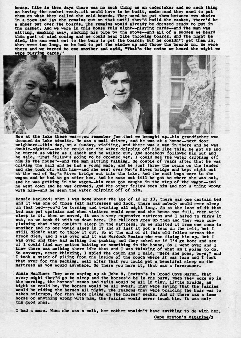 Published by Ronald Caplan on 1975/12/1 (353 reads)house. Like in them days there was no such thing as an undertaker and no such thing as having the casket ready • it would have to be built, made • and they used to put them on what they called the cold boards. They used to put them between two chairs in a room and lay the remains out on that until they'd build the casket. There'd be a sheet put over the boards. The remains would already be dressed ready to put in the casket* And we were in this house this night • playing cards • and the man was sitting, smoking away, smoking his pipe by the stove • and all of a sudden we heard this gust of wind coming and we could hear like throwing boards* And the night he died, the son went out to the bam to get the boards; but he couldn't get them in, they were too long, so he had to put the window up and throw the boards in* We were there and we turned to o&e; another and said, "That*8 the noise we heard the night we were playing cards." " ' #' ?? ''??'??"""~ Now at the lake there was • you remember Joe that we brought up • his grandfather was drowned in Lake Ainslie* He was a mail driver, and he was at a house • next door neighbors • this day, on a Sunday, visiting, and there was a man in there and he was double-sighted • and he could see the water dripping off him like this* He got up and he turned as white as a sheet and he walked out* And somebody followed him out and he said, "That fellow's going to be drowned yet* I could see the water dripping off hira in the house" • and the man sitting talking* So couple of years after that he was driving the mail and he had a young mare, and he just threw the reins on the fender and she took off with him • and she went over Hay's River bridge and kept right out at the end of Hay's River bridge out into the lake* And the mail bags were in the wagon and he had to go after her* And he swam out till he got to where she was out, and he was getting in the wagon • his coat got caught in the step of the wagon • and he went down and he was drowned* And the other fellow seen him and not a thing wrong with him • and he seen the water dripping off of him* Bessie MacLeod: When I was home about the age of 12 or 13, there was one certain bed and it was one of those felt mattresses and look, there was nobody could ever sleep in that bed • you'd be turning and twisting all night long* So at the last of it that bed was put upstairs and when visitors would corae and the house was full, then we'd sleep in it* When we moved, it was a very expensive mattress and I hated to throw it out, so we took it with us down here* The children grew up then and they were com? plaining that they couldn't sleep in the mattress* So we shifted it frora one room to another and no one would sleep in it and at last it got a tear in the felt, but I still didn't want to throw it out* So at the end of it this old fellow across the brook died, and I was over and it was Murdock Beaton who was fixing him up* But I was over and they had nothing for packing and they asked rae if I'd go home and see if I could find any cotton batting or something in the house* So I went over and I knew there was nothing there like that and I was thinking of what am I going to do. So anyways, never thinking, I spied the couch and I said, "Here she goes, boys," and I took a stack of piling from the inside of the couch where it was torn and I took that over for the packing* Well after that you could get a beautiful sleep on the mattress as you would anywhere. So there you have it, that was a forerunner* Annie MacPhee: They were saying up at John R. Beaton's in Broad Cove Marsh, that every night they'd go to sleep and the horses'd be in the barn* When they woke up in the morning, the horses' manes and tails would be all in tiny, little braids, as tight as could be. The horses would be all sweat* They were saying that the tairies would be riding the horses all night. The reasons they were braiding the hair was to raakes stirrups, for they were riding on the horses' necks. And if there was a larae horse or anything wrong with him, the fairies would never touch him* It was only the good ones* I had a mare* When she was a colt. her mother wouldn't have anything to do with her. Cape Breton's Magazine/3