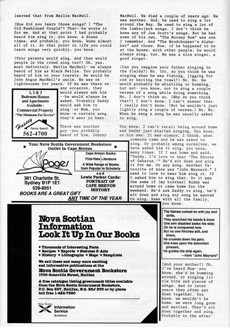 learned that from Neilie MacNeil. (How did you learn those songs? ) "The Old-Fashioned Couple"? That--he wrote it for me. And at that point I had probably heard him sing it, you know, a dozen times, and probably, you know, knew almost all of it. At that point in life you could learn songs very quickly, you know. (Your parents would sing. And then would people in the crowd sing too?) Oh, yes, most definitely. Neilie MacNeil--we always heard of him as Black Neilie. You probably heard of him on your travels. He would be John Angus MacNeil's uncle. He was on lighthouses for years. If he was there on any occasion, they would always ask him --he would always be asked. Probably Daddy would ask him to sing--or Mom, you know--a certain song they'd want to hear. 1,2 & 3 Bedroom Houses and Apartments Available - Commercial Property "The Minimum Fee Service" f?? ' Rental Search 562-4700 There was another guy--you probably heard of him. Johnny Your Nova Scotia Govemment Bookstore Outlet in Cape Breton Cape Breton Books First-Rate Literature A Wide Range of Books from Popular to Scholarly 361 Charlotte St. '"'Xl''TJ SS'*'** Sydney B1P1 El ' • JSSSr'' KQQQCCI CAPEBRETON Ojy-0001 HISTORY BOOKS ARE A GREA T GIFT ANY TIME OF THE YEAR MacNeil. He died a couple of years ago. He was another. God, he used to sing a lot around the Bay. He used to sing a lot of the lumberjack songs. I don't think he knew any of Joe Scott's songs. But he had some of his own. "The Norway Bum" was one I remember. And "The Woodchopper's Alpha? bet" and those. Now, if he happened to be at the house, with other people, he would always sing, too. He was a nice singer, a good singer. (Can you imagine your father singing in the fields?) No. (Or, do you think he was singing when he was fishing, jigging for cod or baiting the trawl?) No. No. He would probably be whistling or humming, but not--you know, not to sing a couple verses of a song while doing something. No, I don't think so. (Why do you think that?) I don't know. I can't answer that. I really don't know. (But he wouldn't just lightly sing a couple of verses.) No. No. When he sang a song he was usually asked to sing. You know, I can't recall being around home and Daddy just started singing. You know, on his own. It was always, I think, when someone came and he was asked to sing. Or probably among ourselves, we have asked him to sing, you know, many times. If I was home and said, "Daddy, I'd love to hear 'The Shores of Gabarus.'" He'd sit down and sing it for me. Or any song. Another fa? vourite of mine was "John Maynard." I used to love to hear him sing it. If I asked him to sing that. Or it was the same if (my brother) Buddy was around home or came home for the weekend. He'd ask Daddy to sing, he'd sit down and sing any song he wanted to sing. Same with all the family, you know. Nbva Scotian Information Look It Up In Our Books • Thousands of Interesting Facts • Becipes • Baports • Statutes & Acts • History • Lithographs • M19S • Panq'hlets We sell these and many more exciting and informative publications at the Nova Scotia Crovemmexit Bookstore 1700 Granville Street, Halifax A free catalogue listing govemment titles available from the Nova Scotia Govemment Bookstore, P.O. Box 637, Halifax, NJS. B3 J ZT3 or by phone toU free 1-424-7880 Nova Scotia Information Service The flames rushed on with joy and strife, They scorched his hands & brow One arm disabled seeks his side; Oh he is conquered now. But no one flinches still, and brave, He crushes down his pain; One knee upon the stanchion He guides the ship again. • from "John Maynard" (And your mother?) Oh, I've heard Mum--you know, she'd be humming around, or singing lit? tle bits and pieces of songs. And in later years they often sat down together. You know, we wouldn't be home, we were long gone and married. They'd sit down together and sing. Probably in the after-