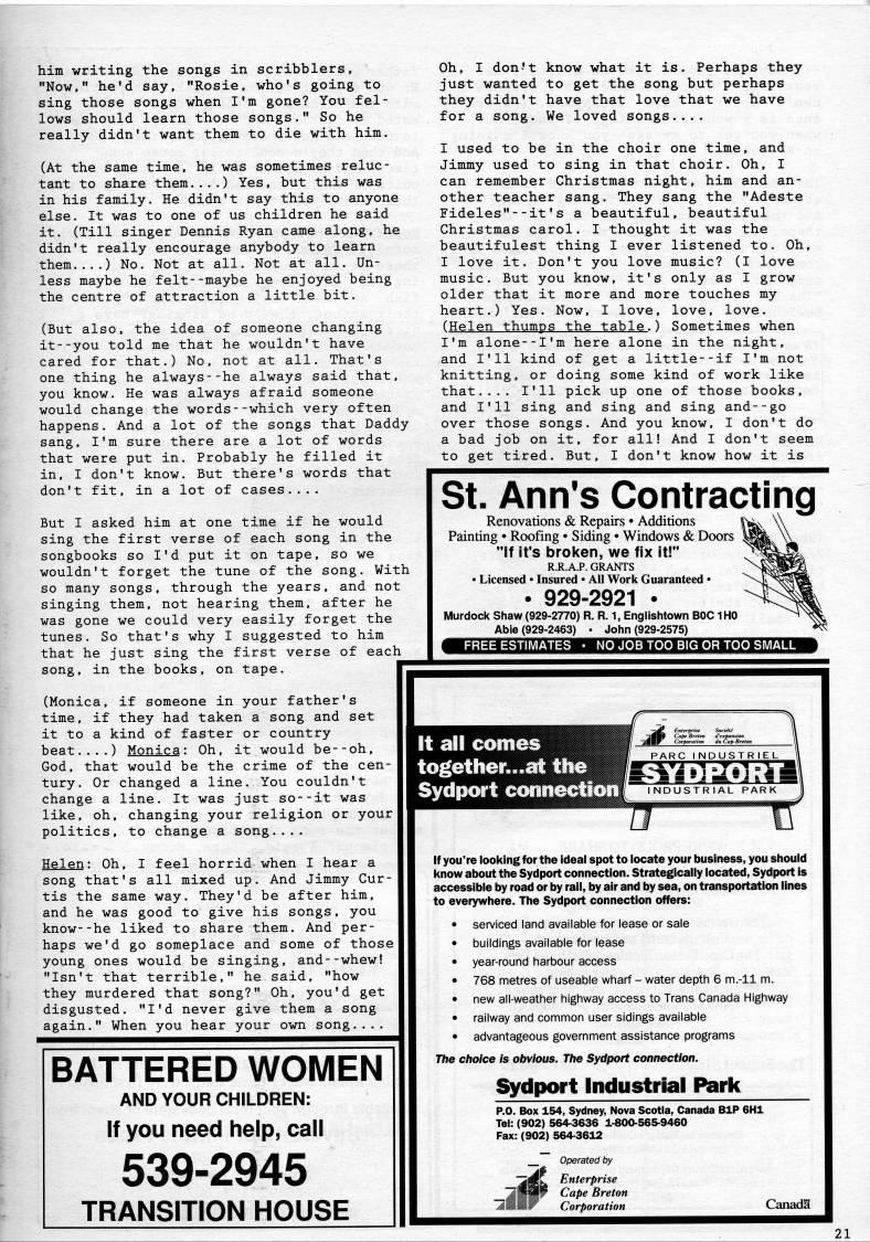 him writing the songs in scribblers, "Now," he'd say, "Rosie, who's going to sing those songs when I'm gone? You fel? lows should learn those songs." So he really didn't want them to die with him. (At the same time, he was sometimes reluc? tant to share them....) Yes, but this was in his family. He didn't say this to anyone else. It was to one of us children he said it. (Till singer Dennis Ryan came along, he didn't really encourage anybody to learn them ) No. Not at all. Not at all. Un? less maybe he felt--maybe he enjoyed being the centre of attraction a little bit. (But also, the idea of someone changing it--you told me that he wouldn't have cared for that.) No, not at all. That's one thing he always--he always said that, you know. He was always afraid someone would change the words--which very often happens. And a lot of the songs that Daddy sang, I'm sure there are a lot of words that were put in. Probably he filled it in. I don't know. But there's words that don't fit, in a lot of cases.... But I asked him at one time if he would sing the first verse of each song in the songbooks so I'd put it on tape, so we wouldn't forget the tune of the song. With so many songs, through the years, and not singing them, not hearing them, after he was gone we could very easily forget the tunes. So that's why I suggested to him that he just sing the first verse of each_ song, in the books, on tape. Oh, I don't know what it is. Perhaps they just wanted to get the song but perhaps they didn't have that love that we have for a song. We loved songs.... I used to be in the choir one time, and Jimmy used to sing in that choir. Oh, I can remember Christmas night, him and an? other teacher sang. They sang the "Adeste Fideles"--it's a beautiful, beautiful Christmas carol. I thought it was the beautifulest thing I ever listened to. Oh, I love it. Don't you love music? (I love music. But you know, it's only as I grow older that it more and more touches my heart.) Yes. Now, I love, love, love. (Helen thumps the table.) Sometimes when I'm alone--I'm here alone in the night, and I'll kind of get a little--if I'm not knitting, or doing some kind of work like that.... I'll pick up one of those books, and I'll sing and sing and sing and--go over those songs. And you know, I don't do a bad job on it, for all! And I don't seem to get tired. But, I don't know how it is (Monica, if someone in your father's time, if they had taken a song and set it to a kind of faster or country beat....) Monica: Oh, it would be--oh, God, that would be the crime of the cen? tury. Or changed a line. You couldn't change a line. It was just so--it was like, oh, changing your religion or your politics, to change a song.... Helen: Oh, I feel horrid when I hear a song that's all mixed up. And Jimmy Cur? tis the same way. They'd be after him, and he was good to give his songs, you know--he liked to share them. And per? haps we'd go someplace and some of those young ones would be singing, and--whew! "Isn't that terrible," he said, "how they murdered that song?" Oh, you'd get disgusted. "I'd never give them a song again." When you hear your own song.... St. Ann's Contracting Renovations & Repairs • Additions "' "'' Painting • Roofing • Siding • Windows & Doors "If it's broken, we fix It!" R.R.A.P. GRANTS • Licensed • Insured • AU Work Guaranteed • • 929-2921 • Murdock Shaw (929-2770) R. R. 1, Englishtown BOC 1 HO Abie (929-2463) • John (929-2575) FREE ESTIMATES • NO JOB TOO BIG OR TOO SIVIALL It all comes togethei'-.at tiiiH'''''''''' Sydport coiiiifii||| PARC I NDUSTRlEL INDUSTRIAL PARK BATTERED WOMEN AND YOUR CHILDREN: If you need help, call 539-2945 TRANSITION HOUSE If you're looking for the Ideal spot to locate your business, you should know about the Sydport connection. Strategically iocated, Sydport Is accessible by road or by rail, by air and by sea, on transportation lines to everywhere. The Sydport connection offers: • serviced land available for lease or sale • buildings available for lease • year-round harbour access • 768 metres of useable wharf - water depth 6 m.-ll m. • new all-weather highway access to Trans Canada Highway • railway and common user sidings available • advantageous government assistance programs The choice is obvious. The Sydport connection. Sydport Industrial Park P.O. Box 154, Sydney, Nova Scotia, Canada BIP 6H1 Tei: (902) 564-3636 1-800-565-9460 Fax: (902) 564'612 Operated by im ir Enterprise Cape Breton Corporation