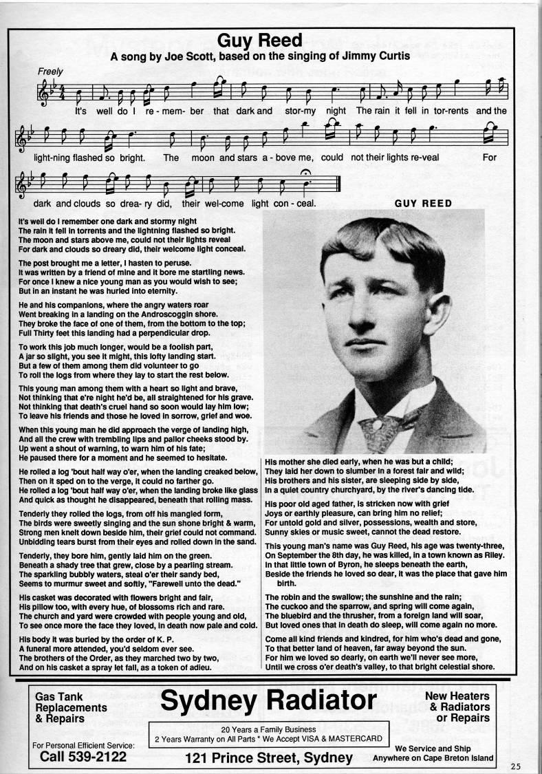 Guy Reed A song by Joe Scott, based on the singing of Jimmy Curtis Freely It's well do I re - mem- ber that dark and stor-my night The rain it fell in tor-rents and the light-ning flashed so bright. The moon and stars a - bove me, could not their lights re-veal For dark and clouds so drea- ry did, their wel-come light con - ceal. it's well do i remember one dark and stormy night The rain It fell In torrents and the lightning flashed so bright. The moon and stars above me, could not their lights reveal For dark and clouds so dreary did, their welcome light conceal. The post brought me a letter, I hasten to peruse. It was written by a friend of mine and It bore me startling news. For once I knew a nice young man as you would wish to see; But In an Instant he was hurled Into eternity. He and his companions, where the angry waters roar Went breaking In a landing on the Androscoggin shore. They broke the face of one of them, from the bottom to the top; Full Thirty feet this landing had a perpendicular drop. To work this job much longer, would be a foolish part, A jar so slight, you see it might, this lofty landing start. But a few of them among them did volunteer to go To roll the logs from where they lay to start the rest below. This young man among them with a heart so light and brave, Not thinking that e're night he'd be, all straightened for his grave. Not thinking that death's cruel hand so soon would lay him low; To leave his friends and those he loved in sorrow, grief and woe. When this young man he did approach the verge of landing high. And all the crew with trembling lips and pallor cheeks stood by. ' Up went a shout of warning, to warn him of his fate; He paused there for a moment and he seemed to hesitate. GUY REED He rolled a log 'bout half way o'er, when the landing creaked below, Then on it sped on to the verge, it could no farther go. He rolled a log 'bout half way o'er, when the landing broke like glass And quick as thought he disappeared, beneath that roiling mass. Tenderly they rolled the logs, from off his mangled form, The birds were sweetly singing and the sun shone bright & warm. Strong men knelt down beside him, their grief could not command. Unbidding tears burst from their eyes and rolled down in the sand. Tenderly, they bore him, gently laid him on the green. Beneath a shady tree that grew, close by a pearling stream. The sparkling bubbly waters, steal o'er their sandy bed. Seems to murmur sweet and softly, "Farewell unto the dead." His casket was decorated with flowers bright and fair, His pillow too, with every hue, of blossoms rich and rare. The church and yard were crowded with people young and old. To see once more the face they loved, in death now pale and cold. His body It was buried by the order of K. P. A funeral more attended, you'd seldom ever see. The brothers of the Order, as they marched two by two. And on his casket a spray let fall, as a token of adieu. His mother she died early, when he was but a child; They laid her down to slumber in a forest fair and wild; His brothers and his sister, are sleeping side by side, in a quiet country churchyard, by the river's dancing tide. His poor old aged father, Is stricken now with grief Joys or earthly pleasure, can bring him no relief; For untold gold and silver, possessions, wealth and store, Sunny skies or music sweet, cannot the dead restore. This young man's name was Guy Reed, his age was twenty-three. On September the 8th day, he was killed, in a town known as Riley. In that little town of Byron, he sleeps beneath the earth, Beside the friends he loved so dear, it was the place that gave him birth. The robin and the swaik)w; the sunshine and the rain; The cuckoo and the sparrow, and spring will come again, The bluebird and the thrusher, from a foreign land will soar. But loved ones that in death do sleep, will come again no more. Come all kind friends and kindred, for him who's dead and gone. To that better land of heaven, far away beyond the sun. For him we loved so dearly, on earth we'll never see more. Until we cross o'er death's valley, to that bright celestial shore. Gas Tank Replacements & Repairs For Personal Efficient Service: Call 539-2122 Sydney Radiator 20 Years a Family Business 2 Years Warranty on All Parts * We Accept VISA & MASTERCARD New Heaters & Radiators or Repairs We Service and Ship 121 Prince Street, Sydney Anywhere on cape Breton island 25
