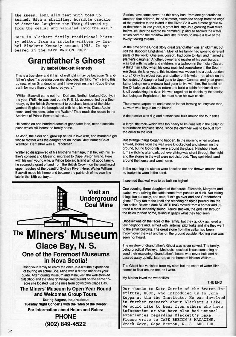 Published by Ronald Caplan on 1990/8/1 (2324 reads)the knees, long slim feet with toes up? turned. With a shrilling, horrible crackle of demoniac laughter the Thing floated up from the cellar and vanished into the air." Here is Blackett family traditional histo? ry edited from an article written by Isa? bel Blackett Kennedy around 1958. It ap? peared in the CAPE BRETON POST: Grandfather's Ghost By Isabel Blackett Kennedy This is a true story and if it is not well told it may be because "Grand? father's ghost" is peering over my shoulder, thinking: "Why bring this up now, when Grandmother and I have been resting in Cape Breton earth for more than one hundred years." "William Blackett came out from Durham, Northumberland County, in the year 1785. He was sent out (to P. E. I.), accompanied by a Sec? retary, by the British Government to purchase lumber of the ship? yards of England. He brought out with him, his wife, Diana Apple- cross, and two sons, John and Walter." Thus reads the record in the Archives of Prince Edward Island.... He settled on one hundred acres of good farm land, near a seaside place which still bears the family name. As John, the elder son, grew up he fell in love with, and married a girl whose mother was the daughter of an Indian Chief named Chief Wambolt. Her father was a Frenchman. Walter so disapproved of his brother's marriage, that he, with his fa? ther's consent and blessing, migrated to Cape Breton Island. Here with his own young wife, a Prince Edward Island girl of good family, he secured a grant of land from the British Crown, on the southward upper reaches of the beautiful Sydney River. Here, Walter William Blackett made his home and became the patriarch of his own line late in the 18th century... Visit an Underground Coal IVIine '''tTW ''' Miners' Museum Glace Bay, N. S. One of the Foremost l/luseums in Nova Scotia! Bring your family to enjoy the once-in-a-lifetime experience of touring an actual Coal Mine with a retired miner as your guide. After touring Museum and Mine, visit the well-stocked Gift Shop and the Miners' Village Restaurant on the same 15- acre site located just one mile from downtown Glace Bay. The Miners' Museum Is Open Year Round and Welcomes Group Tours. During August, Inquire about Tuesday Night Concerts with the "IVIen of the Deeps" For Information about Hours and Rates: (902) PHONE 849-4522 Stories have come down-as this story has-from one generation to another, that children, in the summer, swam the sheep from the edge of the meadow to the Island in the River. So it was a more gentle riv? er that when, in late years, a great Industry-in a growing town miles below-caused the river to be dammed up and so backed the water which covered the meadow and little islands, to make a lake of the lovely flowing stream.... At the time of the Ghost Story great grandfather was an old man; but still the stubt)orn Englishman. Most of his family had gone to different parts of the world. One son, Joseph, had gone to Haiti and married a planter's daughter. Another, owner and master of his own barque, was lost with his wife and children, in a typhoon in the Indian Ocean. A third man killed when his crew mutinied somewhere in the South? ern Seas. (In later years, this incident was woven into a Jack London story.) Only his eldest son, grandfather of this writer, remained on the homestead. A daughter had gone to Upper Canada; and great grand? father being now a widower had gone to live with her. But he did not like Ontario; so decided to return and build a cabin for himself on a knoll overlooking the river. He was urged not to do this by the family; but, being an Englishman, he must have his own castle. There were carpenters and masons in that farming countryside then, so work was begun on the house. A deep cellar was dug and a stone wall built around the four sides. A large, flat rock-which was too heavy to lift-was left in the cellar for a foundation fireplace stone, since the chimney was to be built from the cellar to the roof. But strange things began to happen. In the morning when workers arrived, stones from the wall were knocked out and strewn on the ground, but no foot-prints were around the place. Neighbors took turns watching after dark, but everything was silent through the night and the stones in the wall were not disturbed. They sprinkled sand around the house and went home. In the morning the stones were knocked out and thrown around, but no footprints were in the sand. It seemed that wall was to be built no higher! One evening, three daughters of the house, Elizabeth, Margaret and Isabel, were driving the cattle home from pasture at dusk. Not taking things too seriously, one said, "Let's go over and see Grandfather's ghost." They ran to the knoll and standing on tiptoe peered into the dim cellar. Below a dark SOMETHING moved from a corner and ut? tered a most unearthly sound! Terror-stricken, the girls ran through the fields to their home, telling in gasps what they had seen. Unbelief was on the faces of the family, but they quickly gathered a few neighbors and, armed with lanterns, pitchforks and rifle they went to the small building. The great stone from the cellar had been thrown over the wall and lay on the ground outside. Nothing else was seen nor heard. The mystery of Grandfather's Ghost was never solved. The family, being practical Wesleyan Methodist, decided it was something be? yond their reasoning. Grandfather's house was never built and he passed away quietly, later on, at the home of his son William.... The Ghost has vanished from my side; but the scent of water lilies seems to float around me, as I write. My Mother loved the water lilies. THE END Our thanks to Kate Currie of the Beaton In? stitute, UCCB, who introduced us to John Reppa at the the Institute. He was involved in further research about Blackett's Lake. We would like to hear from others who have information or who have also had unusual experiences regarding Blackett's La