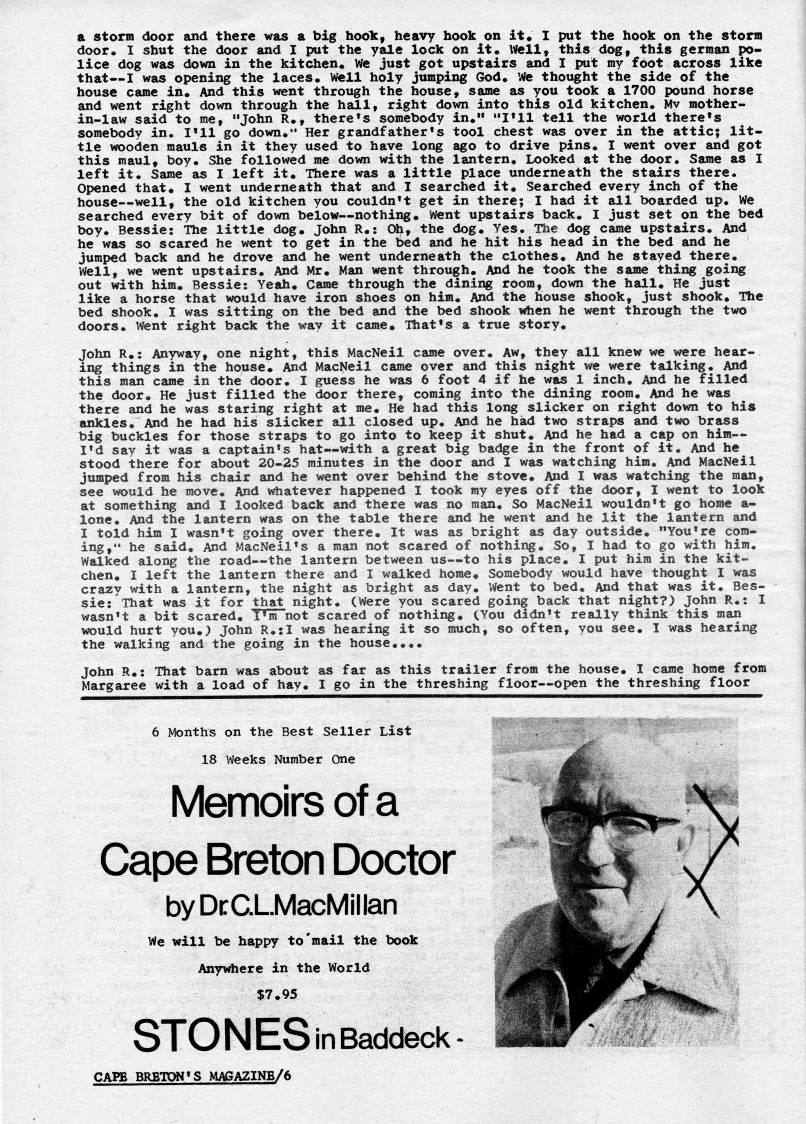 a storm door and there was a big hook, heavy hook on it. I put the hook on the storm door. I shut the door and I put the yale lock on it. well, this dog, this german po? lice dog was down in the kitchen. We just got upstairs and I put my foot across like that • I was opening the laces* well holy jumping God* We thought the side of the house came in* And this went through the house, same as you took a 1700 pound horse and went right down through the hall, right down into this old kitchen. Mv mother- in-law said to me, "John R., there's somebody in." "I'll tell the world there's somebody in. I'll go down." Her grandfather's tool chest was over in the attic; lit? tle wooden mauls in it they used to have long ago to drive pins* I went over and got this maul, boy. She followed me down with the lantern. Looked at the door. Same as I left it. Same as I left it* There was a little place underneath the stairs there. Opened that* I went underneath that and I searched it* Searched every inch of the house • well, the old kitchen you couldn't get in there; I had it all boarded up. We searched every bit of down below • nothing. Went upstairs back. I just set on the bed boy. Bessie: The little dog* John R*: Oh, the dog* Yes. The dog came upstairs. And he was so scared he went to get in the bed and he hit his head in the bed and he jumped back and he drove and he went underneath the clothes. And he stayed there. Well, we went upstairs. And Mr* Man went through* And he took the same thing goii% out with him* Bessie: Yeah* Came through the dining room, down the hall* He just like a horse that would have iron shoes on hira* And the house shook, just shook* The bed shook. I was sitting on the bed and the bed shook ?Aien he went through the two doors. Went right back the way it came. That's a true story. John R,; Anyway, one night, this MacNeil came over. Aw, they all knew we were hear? ing things in the house. And MacNeil came over and this night we were talking. And this man came in the door. I guess he was 6 foot 4 if he was 1 inch. And he filled the door. He just filled the door there, coming into the dining room* And he was there and he was staring right at me* He had this long slicker on right down to his ankles* And he had his slicker all closed up* And he had two straps and two brass big buckles for those straps to go into to keep it shut* And he had a cap on him • I'd say it was a captain's hat • with a great big badge in the front of it. And he stood there for about 20-25 minutes in the door and I was watching him. And MacNeil jumped from his chair and he went over behind the stove* And I was watching the man, see would he move. And whatever happened I took my eyes off the door, I went to look at something and I looked back and there was no man. So MacNeil wouldn't go horae a- lone. And the lantern was on the table there and he went and he lit the lantern and I told him I wasn't going over there* It was as bright as day outside* "You're com? ing," he said* And MacNeil's a man not scared of nothing* So, I had to go with him. Walked along the road • the lantern between us • to his place. I put him in the kit? chen* I left the lantern there and I walked home. Somebody would have thought I was crazy with a lantern, the night as bright as day* Went to bed. And that was it. Bes? sie: That was it for that night. (Were you scared going back that night?) John R.: I wasn't a bit scared* I'm not scared of nothing* (You didn't really think this man would hurt you*) John R*:I was hearing it so much, so often, you see, I was hearing the walking and the going in the house.*** John R*: That barn was about as far as this trailer from the house* I came home from Margaree with a load of hay* I go in the threshing floor • open the threshing floor 6 Months on the Best Seller List 18 Weeks Number One Memoirs of a Cape Breton Doctor byDcCLMacMillan We will be happy to'mail the book Anywhere in the World $7*95 STONES in Baddeck- CAPE BRBTC??<*S MAGA2INE/6