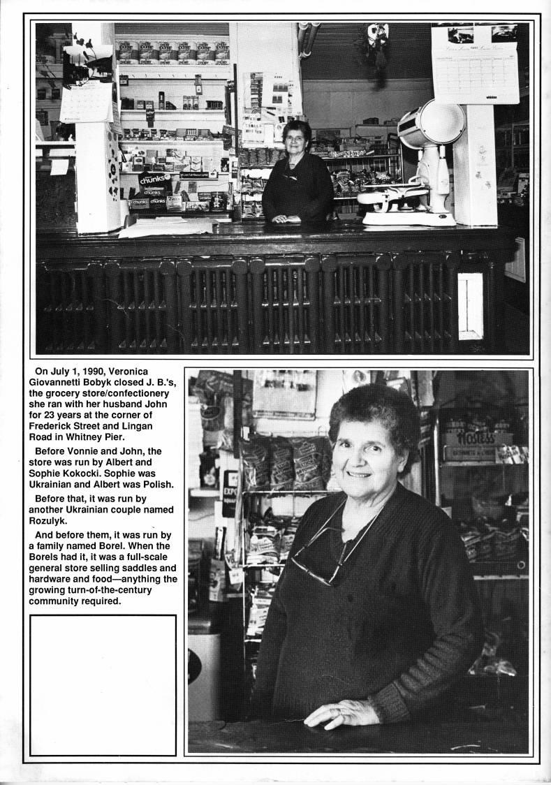 Published by Ronald Caplan on 1990/8/1 (199 reads)On July 1,1990, Veronica Giovannetti Bobyk closed J. B.'s, the grocery store/confectionery she ran with her husband John for 23 years at the corner of Frederick Street and Lingan Road in Whitney Pier. Before Vonnie and John, the store was run by Albert and Sophie Kokocki. Sophie was Ukrainian and Albert was Polish. Before that, it was run by another Ukrainian couple named Rozulyk. And before them, it was run by a family named Borel. When the Borels had it, it was a full-scale general store selling saddles and hardware and food • anything the growing tum-of-the-century community required.