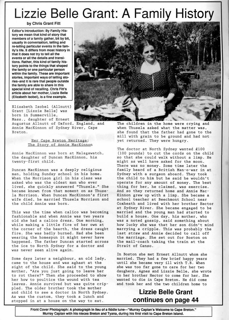 Published by Ronald Caplan on 1991/1/1 (479 reads)Lizzie Belle Grant: A Family History by Chris Grant FItt Editor's Introduction: By Family His? tory we mean that kind of story that members of a family gather, bit by bit, usually in conversation, telling and re-telling particular events in the fam? ily's life. It differs from most history in that it does not try to tell all the events or all the details and transi? tions. Rather, this kind of family his? tory points to the things that shaped the family or one particular person within the family. These are important stories, important ways of telling sto- ries-and it is rare that people outside the family are able to share in this special kind of recalling. Chris Fitt's article about her mother, Lizzie Belle (Elizabeth Isobei), is a fine example. Elizabeth Isobei (Allnutt) Grant [Lizzie Belle] was born in Summerville, Mass., daughter of Ernest Augustus Allnutt of Oxford, England, and Annie MacKinnon of Sydney River, Cape Breton. Her Cape Breton Heritage: The Story of Annie MacKinnon Annie MacKinnon was born at Malagawatch, the daughter of Duncan MacKinnon, his twenty-first child. Duncan MacKinnon was a deeply religious man, holding Sunday school in his home. When the Morrison girl in his class was asked who was the oldest man who ever lived, she quickly answered "Thusela." She became known from that moment on as Thuse? la Morrison. When Duncan MacKinnon's first wife died, he married Thusela Morrison and the child Annie was born. This was the time when calico was becoming fashionable and when Annie was two years old she had a calico dress. One morning, while making a little fire of her own at the corner of the hearth, the dress caught fire. She was badly burned. Had she been wearing the homespun it might never have happened. The father Duncan started across the ice to North Sydney for a doctor and was never seen alive again. Some days later a neighbour, an old lady, came to the house and was aghast at the sight of the child. She said to the young mother, "Are you just going to leave her to rot there?" Then she proceeded to show her how to poultice the wound with tea leaves. Annie survived but was quite crip? pled. The older brother took the mother and child to see a doctor in North Sydney. As was the custom, they took a lunch and stopped in at a house on the way to eat. The children in the home were crying and when Thusela asked what the matter was, she found that the father had gone to the mill with grain to be ground and had not yet returned. They were hungry. The doctor at North Sydney wanted ??100 (100 pounds) to cut the cords on the child so that she could walk without a limp. He might as well have asked for the moon. There was no money. Some time later the family heard of a British Man-o-war in at Sydney with a surgeon aboard. They took the child to him but he said he wouldn't operate for any amount of money. The best thing for her, he claimed, was exercise. And so they returned home and Annie Mac? Kinnon grew up with a limp. She became a school teacher at Beechmont School near Coxheath and lived with her brother Hector at Sydney River. She became engaged to be married and the young man had started to build a house. One day, his mother, who was a noted gossip, said something about how lucky she was that her son didn't mind marrying a cripple. This was probably the last straw and Annie decided to call off the marriage. She set out for Boston on the mail-coach taking the train at the Strait of Canso. In Boston she met Ernest Allnutt whom she married. They had a few brief happy years until she became very ill with T.B. When she was too far gone to care for her two daughers, Agnes and Lizzie Belle, she wrote to her brother Hector to come for her. She wanted to die in Cape Breton. He did come and took her and the two children home to Lizzie Belle Grant continues on page 44 Front Cover Photograph: A photograph In lieu of a fiddle tune • "IVIurray Caplan's Welcome to Cape Breton." Murray Caplan with his nieces Breton and Tyana, during his first visit to Cape Breton Island.