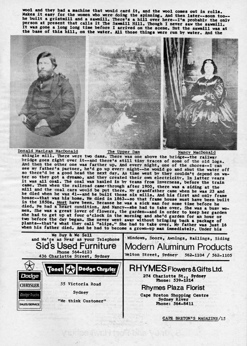 Published by Ronald Caplan on 1975/12/1 (440 reads)wool and they had a machine that would card it, and the wool comes out in rolls* Makes it easy for the women who were' doing the spinning* And then later • soon too • he built a gristmill and a sawmill* There's a hill over here • I'm probably the only person at present that calls it The Sawmill Hill* Though I never saw the sawmill* It was gone a long long time before I arrived on the scene* But the sawmill was at the base of this hill, on the water* All those things were run by water. And the ..4p' i* Donald MacLean MacDonald The Upper Dam Nancy MacDonald shingle mill* There were two dams* There was one above the bridge • the railway bridge goes right over it • and there's still tiny traces of some of the old logs. And then the other one was farther up. And every night, one of the chores • I can see my father's partner, he'd go up every night • he would go and shut the water off so there'd be a good head the next day. As time went by they couldn't depend on wa? ter so they got a dynamo, and they created their own electricity. In latter years it was all coal. The coal was hauled in by teams frora Inverness, before the train carae. Then when the railroad came*through after 1900, there was a siding at the mill and the coal cars would be put there* My grandfather carae %dien he was 23 and he died v*en he was 41 • and he built those six mills* And his first and only frame house • that was his home* He died in 1863 • so that frame house must have been built in the 1850s* Must have been* Because he was a sick man for some time before he died* He had a heart condition* And Nancy • she had to take over* She was a busy wo? men* She was a great lover of flowers, the garden • and in order to keep her garden she had to get up at four o'clock in the morning and she'd garden for an hour or two before the day began* She never went away without bringing back a package of plants • that's vrtiat they call "slips*" She had to take over* My father was just 16 when his father died* And he had to become a grown-up man immediately* Under his We Buy & We Sell and We're as Near as your Telephone Sid s Used Furniture Phone 564-6123 436 Charlotte Street, Sydney Windows, Doors, Awnings, Railings, Siding Modern Aluminum Products welton Street, Sydner 562-1104 / 562-1105 I CHRYSLER SAL??S/SERViCE ''GSBEIS''''''/ 55 Victoria Road Sydney "We think Custoraer" R H YMES Flowers &Gifts; Ltd 274 Charlotte St*, Sydney Phone: 539-1214 Rhymes Plaza Florist Cape Breton Shopping Centre Sydney River Phone: 564-8411 CAPE BRETON'S MAGAZINE/15