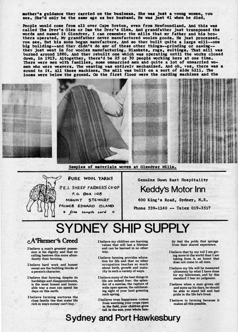 Published by Ronald Caplan on 1975/12/1 (445 reads)mother's guidance they carried on the business* She was just a young women, you see. She'd only be the same age as her husband. He was just 41 when he died. People would come from all over Cape Breton, even from Newfoundland. And this was called The Dyer's Glen or Dan the Dyer's Glen. And grandfather just transposed the %?ords and named it Glendyer* I can remeraber the raills that ray father and his bro? thers operated* My grandfather never manufactured woolen goods* He just processed* you see* But his sons began manufacture. And so they built quite a large mill • one big building • and they didn't do any of these other things • grinding or sawing • they just went in for woolen manufacturing* Blankets, rugs, suitings* That mill was burned around 1880* And they rebuilt one which was operating until the works closed down, in 1913* Altogether, there'd be 25 or 30 people working here at one tirae. There were men with families, sorae unmarried men and quite a lot of unmarried wo? men who were weavers* The weaving was entirely mechanized* And oh, ves, there was a sound to it. All those machines. The mill was built on a sort of side hill* The looms were below the ground* On the first floor were the carding machines and the : III I : P! ?? lU I m :?? lit I Pi: I ill im I ': He f Is.: ??. lift 131 ' m II: * ill I i I II; M!lliiii;n lin ' III ? PI I m I IV? * ' :. '' III I lU f III I III I Samples of materials woven at Glendyer Mills* PURE WOOL VARKfS PEJ. SHEEP FARMERS'CO-OP P.O. 8cx I08 MOUNT S re WART PAINCE EDWARD ISLAND Genuine Down East Hospitality Keddy's Motor Inn 600 King's Road, Sy'taey, N.S. Phone 539-1140 • Telex 019-3517 SYDNEY SHIP SUPPLY cATf'tftner's Creed I believe a man's greatest posses? sion is his dignity and that no calling bestows this more abun? dantly than farming. I believe hard work and honest sweat are the building blocks of a person's character. I believe that farming, despite its hardships and disappointments, is the most honest and honor? able way a man can spend his days on this earth. I believe farming nurtures the close family ties that make life rich in ways money can't buy. • I believe my children are learning values that will last a lifetime and can be learned, in no other way. I believe farming provides educa? tion for life and that no other occupation teaches so much about birth, growth and matu? rity in such a variety of ways. I believe many of the best things in life are indeed free: the splen? dor of a sunrise, the rapture of wide open spaces, the exhilarat? ing sight of your land greening each spring. I believe true happiness comes from watching your crops ripen in the fields your children grow tall in the sun, your whole fam? ily feel the pride that springs from their shared experience. I believe that by my toil I am giv? ing more to the world than I am taking from it, an honor that does not come to all men. I believe my life will be measured ultimately by what I have done for my fellowman, and by this standard I fear no judgment. I believe when a man grows old and sums up his days, he should be able to stand tall and feel pride in the life he's lived. I believe in farming because it makes all this possible. Sydney and Port Hawkesbury