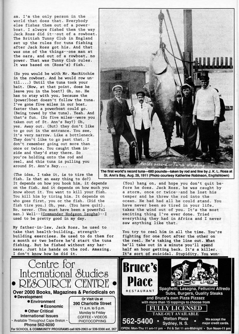 Published by Ronald Caplan on 1991/1/1 (404 reads)am. I'm the only person in the world that does that. Everybody else fishes them out of a power? boat. I always fished them the way Jack Ross did it--out of a rowboat. The British Tunny Club in England set up the rules for tuna fishing after Jack Ross got his. And that was one of the things--one man at the oars, and out of a rowboat, no power. That was Tunny Club rules. It was based on (Ross's) fish. (So you would be with Mr. MacRitchie in the rowboat. And he would row un? til ) Until the tuna took your bait. (Now, at that point, does he leave you in the boat?) Oh, no. He has to stay with you, because the (power)boat doesn't follow the tuna; I've gone five miles in our boat, faster than a powerboat could go. (Being towed by the tuna). Yeah. And that's fun. (So five miles--were you taken out of St. Ann's Bay?) Oh, yes. Away out. (But) they don't like to go out in the entrance. You see, it's very narrow. Like a bottleneck. They don't like to go past that. I don't remember going out more than once or twice. You caught them in? side and they'd stay there. So you're holding onto the rod and reel, and this tuna is pulling you around St. Ann's Bay.... (The idea, I take it, is to tire the fish. Is that an easy thing to do?) It depends on how you hook him, it depends on the fish. And it depends on how much you know about it. You want to kill your fish. You kill him by tiring him. It depends on who goes first, you or the fish. (Did the fish tire you.) Oh, yes. (You have quit). No, never. (You must have been a powerful man.) Well--(Commander Hodgson laughs)--I used to be pretty good in my day. My father-in-law. Jack Ross, he used to take that health-building, strength- building exercises. He used to do them for a month or two before he'd start the tuna fishing. But he fished without any har? ness. Just his hands on the rod. Amazing. I don't know how he did it. The first world's record tuna • 680 pounds-'aken by rod and line by J. K. L. Ross at St. Ann's Bay, Aug. 28,1911 (Photo courtesy Katherine Robinson, Englishtown) (You) hang on, and hope you don't quit be? fore he does. Jack Ross, he was caught by a storm, once or twice--and he lost his temper and he threw the rod into the ocean. He had had all he could stand. You have never been so tired in your life, takes the wind out of you. It's the most exciting thing I've ever done. Tried everything they had in Africa and I never saw anything like that. You try to reel him in all the time. You're fighting for one foot after the other on the reel. He's taking the line out. What he'll take out in a minute you'll sp'nd half an hour getting back. It's a killer. It's sort of suicidal. Stupidity. You von- Centre for International Studies • DE60UDCE CENTDE • Over 2000 Books, Magazines & Periodicals on • Development • Environment • Economic • Other Critical International Issues - Available Througtiout Gape Breton ~ Phone 562-6090 For SCHOOL & COMMUNITY PROGRAMS call 929-2063 or 539-5300 ext. 267 HE Or Visit Us at 390 Charlotte Street 11 a.m. to 5 p.m. Monday to Friday COFFEE • VIDEOS PHOTOCOPYING Brucc'sl Place 562-5400 Spaghetti, Lasagna, Fettucini Alfredo Subs, Burgers, Quality Steaks and Bruce's own Pizza Pizzazz with more than 15 toppings to choose from I FULLY LICENSED | TAKE-OUT AVAILABLE r/inn • Welton Plaza weacceptthe JHXJXJ Sydney, N.S. major credit cards. Thu 11 am-11 pm • Fri & Sat 11 am-Midnight • Sun Noon-11 pm