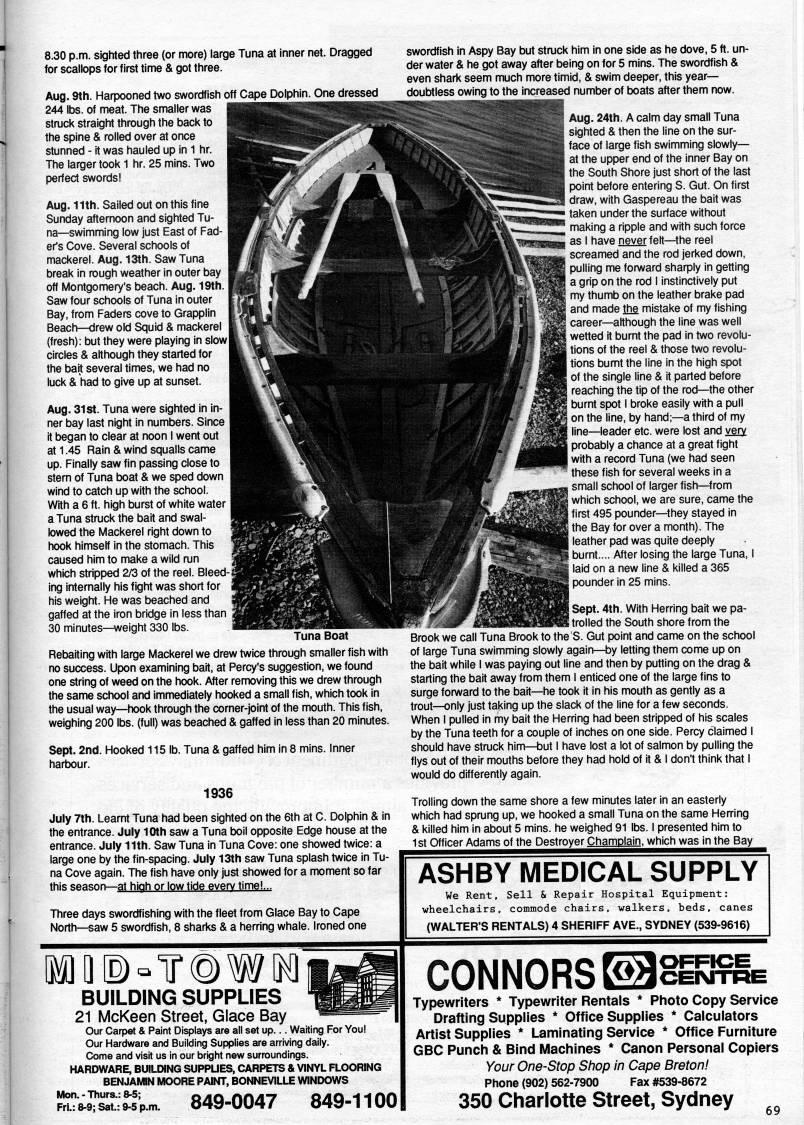 Published by Ronald Caplan on 1991/1/1 (225 reads)8.30 p.m. sighted three (or more) large Tuna at inner net. Dragged for scallops for first time & got three. Aug. 9th. Harpooned two swordfish off Cape Dolphin. One dressed 244 lbs. of meat. The smaller was stmck straight through the back to the spine & rolled over at once stunned - it was hauled up in 1 hr. The larger took 1 hr. 25 mins. Two perfect swords! Aug. 11th. Sailed out on this fine Sunday afternoon and sighted Tu? na • swimming low just East of Fad? er's Cove. Several schools of mackerel. Aug. 13th. Saw Tuna break in rough weather in outer bay off Montgomery's beach. Aug. 19th. Saw four schools of Tuna in outer Bay, from Faders cove to Grapplin Beach • drew old Squid & mackerel (fresh): but they were playing in slow circles & although they started for , the bait several times, we had no luck & had to give up at sunset. i Aug. 31 St. Tuna were sighted in in- I ner bay last night in numbers. Since j it began to clear at noon I went out at 1.45 Rain & wind squalls came I up. Finally saw fin passing close to ; stern of Tuna boat & we sped down wind to catch up with the school. l With a 6 ft. high burst of white water a Tuna struck the bait and swai- ' lowed the Mackerel right down to hook himself in the stomach. This caused him to make a wild mn which stripped 2/3 of the reel. Bleed? ing internally his fight was short for his weight. He was beached and gaffed at the iron bridge in less than 30 minutes • weight 330 lbs. Tuna Boat Rebaiting with large Mackerel we drew twice through smaller fish with no success. Upon examining bait, at Percy's suggestion, we found one string of weed on the hook. After removing this we drew through the same school and immediately hooked a small fish, which took in the usual way • hook through the corner-joint of the mouth. This fish, weighing 200 lbs. (full) was beached & gaffed in less than 20 minutes. Sept. 2nd. Hooked 115 lb. Tuna & gaffed him in 8 mins. Inner hartx)ur. 1936 July 7th. Learnt Tuna had been sighted on the 6th at C. Dolphin & in the entrance. July 10th saw a Tuna boil opposite Edge house at the entrance. July 11th. Saw Tuna in Tuna Cove: one showed twice: a large one by the fin-spacing. July 13th saw Tuna splash twice in Tu na Cove again. The fish have only just showed for a moment so far this season • at hioh or low tide everv time!... Three days swordfishing with the fleet from Glace Bay to Cape North • saw 5 swordfish, 8 sharks & a herring whale. Ironed one swordfish in Aspy Bay but stmck him in one side as he dove, 5 ft. un? der water & he got away after being on for 5 mins. The swordfish & even shark seem much more timid, & swim deeper, this year • doubtless owing to the increased number of boats after them now. Aug. 24th. A calm day small Tuna sighted & then the line on the sur? face of large fish swimming slowly • at the upper end of the inner Bay on the South Shore just short of the last point before entering S. Gut. On first draw, with Gaspereau the bait was taken under the surface without making a ripple and with such force as I have never felt • the reel screamed and the rod jeri