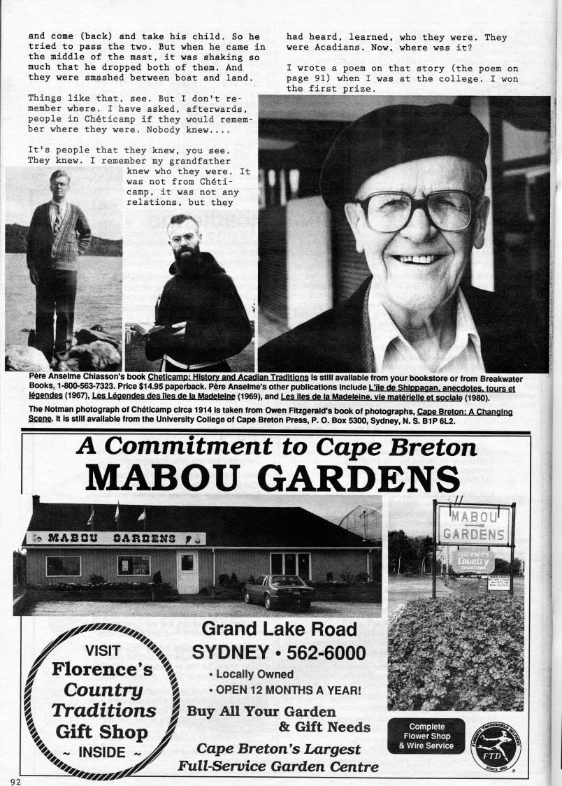 and come (back) and take his child. So he tried to pass the two. But when he came in the middle of the mast, it was shaking so much that he dropped both of them. And they were smashed between boat and land. Things like that, see. But I don't re? member where. I have asked, afterwards, people in Cheticamp if they would remem? ber where they were. Nobody knew.... It's people that they knew, you see. They knew. I remember my grandfather knew who they were. It was not from Cheti? camp, it was not any relations, but they had heard, learned, who they were, were Acadians. Now, where was it? They I wrote a poem on that story (the poem on page 91) when I was at the college. I won the first prize. P6re Anselme Chiasson's book Cheticamp: History and Acadian Traditions is still available from your bookstore or from Breakwater Books, 1-800-563-7323. Price $14.95 paperback. P6re Anselme's other publications Include L'lie de Shippaoan. anecdotes, tours et ''qgntfgS (1967), Les L6aendes des Ties de la IVIadeleine (1969), and Les lies de la Madeleine, vie mat6rielle et socialA (1980). The Notman photograph of Ch6ticamp circa 1914 is taken from Owen Fitzgerald's book of photographs, Cape Breton: A Changing Scene, it is stlll available from the University College of Cape Breton Press, P. O. Box 5300, Sydney, N. S. BIP 6L2. A Commitment to Cape Breton MABOU GARDENS jf' VISIT '- Grand Lake Road SYDNEY. 562-6000 Locally Owned OPEN 12 MONTHS A YEAR! Buy All Your Garden / & Gift Needs Cape Breton*s Largest Full-Service Garden Centre Complete Flower Shop " Wire Service
