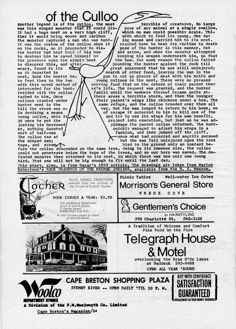 Published by Ronald Caplan on 1975/12/1 (397 reads)of the Culloo it Another legend is of the culloo, the most was this winged raonster that it could dis It had a huge nest on a very high cliff, ther it would bring moose and caribou the monster captured a man who was hunt- It was the custom of the culloo when on the rocks, so it proceeded to dis- the hunter had kept hold of his bow to destroy him he saved himself by the pressure upon him simply bent to discover this, and softer weary, found to its so it departed in nest. Soon the hunter be' to feed them to the two with this novel method of interceded for the hunt resided with the culloo tached to him. Once culloos crawled under hunter went to the till the storm was o- in devising a means young cullos, skin itj At once he put the justing his borrowed er, nothing daunted sort of half-was The culloo saw at the winged man; tops, and scram?'''''. terrible of creatures. So large pose of any animal at a single swallow* which no raan could possibly scale. Thi- with which to feed its ypung. One day ing moose and carried him to its nest, reached home to beat its victims to death pose of the hunter in this manner. But and arrow, and when the monster attempted keeping his weapon underneath him, so that the bow. For some reason the culloo failed pounding the hunter against the rock till great amazement that he was still uninjured; search of other food, leaving the man in the gan to cut up pieces of meat with his knife and young culloos in the nest. These were so pleased serving food that on the return of tneir parent they er's life. The request was granted, and the hunter family until the members thereof became quite at- there arose a terrible storm, and then the younger their parent's wings like chickens under a hen. The same refuge, and the culloo brooded over them all ver. But the man longed to return to his home, so of escape it occurred to him to kill one of the and try to use its wings for his own benefit, project into execution, but just as he was ad- plumage the parent culloo returned. The hunt- quickly managed to adjust his wings in a fashion, and then jumped off the cliff, once what had occurred and angrily pursued but the man fell uninjured upon the tree bled to the ground only an instant be? fore the culloo'de'scended on the same tree. Owing to its immense size, the culloo could not penetrate below the tops of the trees, and so our hero was saved. The de? feated monster then returned to its nest, in which there was now only one young bird. That one will not be big enough to fly until the last day* This story, also, is from Hagar's 1895 article* The drawings are taken from Marion Robertson's ROCK DRAWINGS OF THE MICMAC INDIANS, available from the N. S. MuseuraT" TALES, SONGS, TRADITIONS selected from the archives of the School of Scottish Studies. FOUR ISSUES A YEAR: $3.50 THE JOURNALS SECRETARY, School of Scottish Studies, 2.7 George Square, EDINBURGH EH8 9LD. Picnic Tables Well-water Ice Cubes Morrison's General Store WRECK COVE Gentlemen's Choice in HAIRSTYLING 390 Charlotte St. 562-3336 A Tradition of Welcome and Comfort Fine Food by the Fire Telegraph House & Motel overlooking the Bras D'Or Lakes at Baddeck 295-9988 OPEN ALL YEAR 'ROUND OEfwrmr STORES CAPE BRETON SHOPPING PLAZA SYDNEY RIVER • OPEN DAILY 'TIL 10 P* M* BUY WITH CONFIDENCE " SATISFACTION , GUARANTEED bmACEMENTOR YOUfl MONEY Rm)NOEDi A DiTisioA of tbe F*W??ltooXiiocth Co. Liidted Cape Breton's Magazine/24