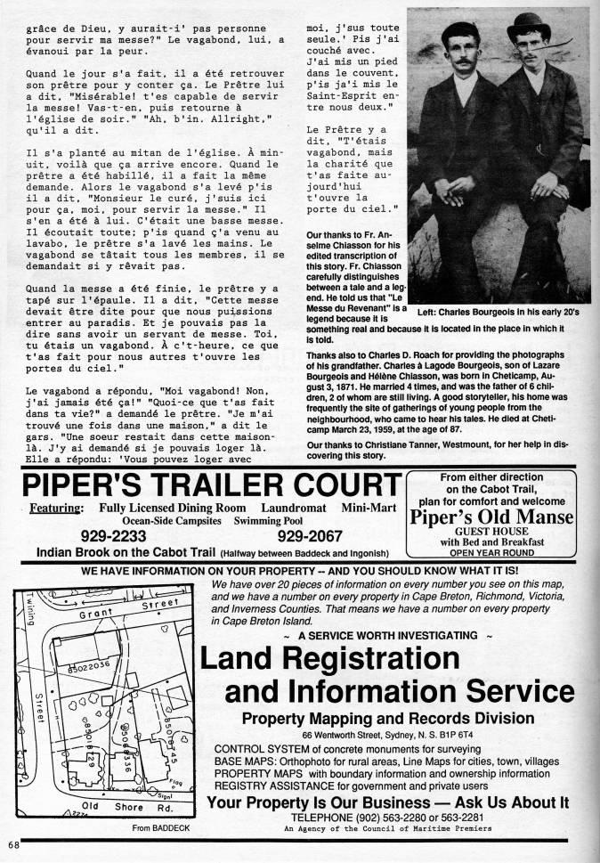 Published by Ronald Caplan on 1991/6/1 (216 reads)grace de Dieu. y aurait-i' pas personne pour servir ma messe?" Le vagabond, lui. a evanoui par la peur. Quand le jour s'a fait, il a ete retrouver son pretre pour y center ga. Le Pretre lui a dit, "Miserable! t'es capable de servir la messe! Vas-t-en, puis retourne k I'eglise de soir." "Ah, b'in. Allright." qu'il a dit. Il s'a plante au mitan de I'eglise. A min? uit, voil' que qa arrive encore. Quand le pretre a ete habilie, il a fait la meme demande. Alors le vagabond s'a leve p'is il a dit, "Monsieur le cure, j'suis ici pour ga, moi, pour servir la messe." Il s'en a ete k lui. Cetait une basse messe. II ecoutait toute; p'is quand g'a venu au lavabo, le pretre s'a lave les mains. Le vagabond se tatait tous les membres, il se demandait si y revait pas. Quand la messe a ete finie, le pretre y a tape sur I'epaule. II a dit. "Cette messe devait etre dite pour que nous puissions entrer au paradis. Et je pouvais pas la dire sans avoir un servant de messe. Toi, tu etais un vagabond. A c't-heure, ce que t'as fait pour nous autres t'ouvre les portes du ciel." Le vagabond a repondu. "Moi vagabond! Non, j'ai jamais ete ga!" "Quoi-ce que t'as fait dans ta vie?" a demande le pretre. "Je m'ai trouve une fois dans une maison." a dit le gars. "Une soeur restait dans cette maison- 1'. J'y ai demande si je pouvais loger 1'. Elle a repondu: 'Vous pouvez loger avec moi. j'sus toute seule.' Pis j'ai couche avec. J'ai mis un pied dans le couvent. p'is ja'i mis le Saint-Esprit en? tre nous deux." Le Pretre y a dit. "T'etais vagabond, mais la charite que t'as faite au- jourd'hui t'ouvre la porte du ciel." ff?' Left: Charles Bourgeois In his early 20's Our thanks to Fr. An? selme Chiasson for his edited transcription of this story. Fr. Chiasson carefully distinguishes between a tale and a ieg| end. He told us that "Le Messe du Revenant" is a legend because it is something real and because it is located in the place in which it is told. Thanks also to Charles D. Roach for providing the photographs of his grandfather. Charies d Lagode Bourgeois, son of Lazare Bourgeois and Hdl'ne Chiasson, was born in Cheticamp, Au? gust 3,1871. He married 4 times, and was the father of 6 chil? dren, 2 of whom are still living. A good storyteller, his home was frequently the site of gatherings of young people from the neighbourhood, who came to hear his tales. He died at Cheti? camp March 23,1959, at the age of 87. Our thanks to Christiane Tanner, Westmount, for her help in dis? covering this story. From either direction on the Cabot Trail, plan for comfort and welcome Piper's Old Manse GUEST HOUSE with Bed and Brealcfast , OPEN YEAR ROUND , PIPER'S TRAILER COURT Featuring: Fully Licensed Dining Room Laundromat Mini-Mart Ocean-Side Campsites Swimming Pool 929-2233 929-2067 Indian Brook on the Cabot Trail (Halfway between Baddeck and Ingonish) WE HAVE INFORMATION ON YOUR PROPERTY - AND YOU SHOULD KNOW WHAT IT IS! We iiave over 20 pieces of information on every number you see on tliis map, and we liave a number on every property in Cape Breton, Ricfimond, Victoria, and Inverness Counties. Tiiat means we have a number on every property in Cape Breton island. -' A SERVICE WORTH INVESTIGATING -- Land Registration and Information Service Property Mapping and Records Division 66 Wentworth Street, Sydney, N. S. Bl P 6T4 CONTROL SYSTEM of concrete monuments for surveying BASE MAPS: Orthophoto for rural areas. Line Maps for cities, town, villages PROPERTY MAPS with boundary information and ownership information REGISTRY ASSISTANCE for government and private users Your Property Is Our Business • Asl< Us About It TELEPHONE (902) 563-2280 or 563-2281 An Agency of the Council of Maritime Premiers From BADDECK 68