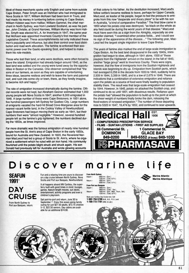 Most of these merchants spoke only English and came from outside Cape Breton. Peter Smyth was an Irishman who had immigrated to Nova Scotia in 1817; William McKeen had been bom in Truro, and had made his money in lumbering before coming to Cape Breton; William Kidston was from Halifax; William Gammel, the chief mer? chant in North Sydney, was from Lowland Scotland, as was his part? ner, John Christie; at Grand Narrows, William Murray was from Hali? fax. Smyth was elected M.L.A. for Inverness in 1847, the same year that McKeen was appointed Inverness County's first member of the Legislative Council. These accomplishments not only indicated these men's popularity and influence, but also their control over food distri? bution and road worit allocation. The famine re-enforced their eco? nomic power over the Gaelic-speaking Scot, and helped to make them his role-models. Those who lost their land, or who were destitute, were often forced to leave the island. Emigration had already begun around 1840, as the best land was settled and the young were lured away by the opportu? nities in Boston or the Canadas. One obsen/er complained that Ihe sons of our farmers, as soon as they are capable of entertaining three ideas, become restless and wish to leave the farm and paternal roof, and msh into some city or town, there, as they fondly imagine, to become rich and happy." The rate of emigration increased dramatically during the famine. Offi? cial records were not kept, but Abraham Gesner estimated that 1,000 young people left Nova Scotia in 1847; another 8,000 emigrated in 1848. A large number of these were Cape Bretoners; in 1851 alone, five hundred passengers left Sydney for Quebec City. Large numbers of emigrants vacated the hard-hit Broad Cove-Margaree area for the nearest vacant fertile land, in the Codroy Valley of Newfoundland. Cape Bretoners had begun moving there as early as 1841, but their numbers then were "almost negligible." However, several hundred people left as the famine's grip tightened; the numbers declined dur? ing the 1850s, as times improved. Far more dramatic was the famous emigration of nearly nine hundred people from the St. Ann's area of Cape Breton in the eariy 1850s, bound for Australia and New Zealand. In 1820, the Reverend Nor? man MacLeod had led a group of Scots to St. Ann's, where he orga? nized a settlement which he ruled with an iron hand. His community flourished until the potato blight stmck and stnjck again. His son Donald had previously left tor Australia and wrote glowing accounts of that colony to his father. As the destitution increased, MacLeod's fellow settlers became restless to leave, perhaps for Upper Canada. MacLeod, as leader of his people, began to feel the pressure to emi? grate from this now "desperate and dreary place" to be with his son in Australia, "a kind of comparative Paradise." The final blow came in 1850 when his potato crop was destroyed, "as black on the whole as any field could be during the worst years of that disease." MacLeod must have seen this as a sign from the Almighty, especially as one traveller claimed, "I examined other potatoe fields... and I could see no sign of the appearance of the disease...." The following year, Mac? Leod led the largest single migration to leave Cape Breton. The years of famine also marked the end of large-scale immigration to Cape Breton. As the best land disappeared in the early 1840s, immi? gration had begun to slow, although in 1841 alone, 1500 of "these paupers from the Highlands" arrived on the island; in the fall of 1843, another "large group" went to Inverness County. There were signs, however, that the flow of immigrants from the Scottish Highlands and islands was beginning to dry up. Emigration from Scottish ports, which had averaged 6,258 in the decade from 1833 to 1843, suddenly fell to 2,939 in 1844,3,399 in 1845, and to a low of 2,679 in 1846. There are indications that a combination of extensive emigration and reliance upon the potato as a source of food were finally leading to population stability there. The result was that large-scale emigration had ceased by 1844. However, in 1845, potato rot attacked the Scottish crop, and continued to do so until 1851, with disastrous results. Reliance upon the potato had "allowed the population to build up to the point at which the sheer weight of numbers finally broke the dam, releasing the flood-waters of renewed emigration." The number of those departing rose to 5320 in 1847,19,474 by 1852, and continued to soar upwards. Medical Hall EST. 1906 • COMPUTERIZED PRESCRIPTION SERVICE . FILMS • SUNTAN LOTIONS • FIRST AID SUPPLIES _ 66 Commercial St. i 1 Commercial St. DOMINION GLACE BAY 849-0200 I 849-6552 (if busy) 849-1030 PHARMASAVE Discover SEAFUN 1991' DAY CRUISE From North Sydney to Port aux Basques, return. Fun and a relaxing time are yours to discover on a day cruise between North Sydney, Nova Scotia and Port aux Basques, Newfoundland. It all happens aboard MV Caribou, the super- ferry built with good times in mind; lounges, games, feature-length movies, sun decl