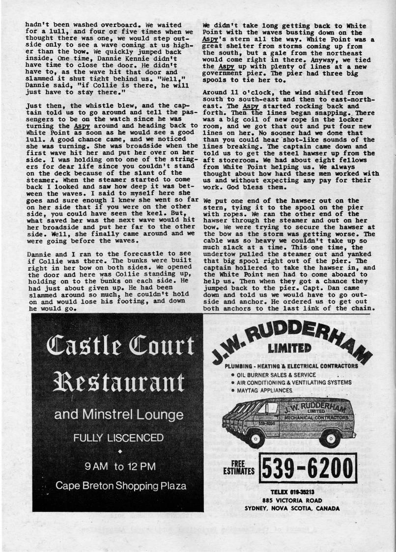 hadn't been washed overboard. We waited for a lull, and four or five times when we thought there was one, we would step out? side only to see a wave coming at us high? er than the bow. We quickly jumped back inside. One time, Dannie Kennie didn't have time to close the door. He didn't have to, as the wave hit that door and slammed it shut tight behind us. "Well," Dannie said, "if Collie is there, he will just have to stay there." Just then, the whistle blew, and the cap? tain told us to go around and tell the pas? sengers to be on the watch since he was turning the Aspy around and heading back to White Point as soon as he would see a good lull. A good chance came, and we noticed she was turning. She was broadside when the first wave hit her and put her over on her side. I was holding onto one of the string? ers for dear life since you couldn't stand on the deck because of the slant of the steamer. When the steamer started to come back I looked and saw how deep it was bet? ween the waves. I said to myself here she goes and sure enough I knew she went so far on her side that if you were on the other side, you could have seen the keel. But, what saved her was the next wave would hit her broadside and put her far to the other side. Well, she finally came around and we were going before the waves. Dannie and I ran to the forecastle to see if Collie was there. The bunks were built right in her bow on both sides. Wfe opened the door and here vfas Collie standing up, holding on to the bunks on each side. He had just about given up. He had been slammed around so much, he couldn't hold on and would lose his footing, and down he would go. Cai'tlt Court 2'E??!taurant and Minstrel Lounge FULLY LISCENCED 9AM to 12 PM Cape Breton Shopping Plaza We didn't take long getting back to White Point with the waves busting down on the Aspv's stem all the way. White Point was a great shelter from storms coming up from the south, but a gale from the northeast would come right in there. Anyway, we tied the Aspy up with plenty of lines at a new government pier. The pier had three big spools to tie her to. Around 11 o'clock, the wind shifted from south to south-east and then to east-north? east. The Aspy started rocking back and forth. Then the lines began snapping. There was a big coil of new rope in the locker room, and we got that out and put four new lines on her. No sooner had we done that than you could hear shot-like pounds of the lines breaking. Ihe captain came down and told us to get the steel hawser up from the aft storeroom. We had about eight fellows from White Point helping us. We always thought about how hard these men worked with us and without expecting any pay for their work. God bless them. We put one end of the hawser out on the stern, tying it to the spool on the pier with ropes. We ran the other end of the hawser through the steamer and out on her bow. We were tryii' to secure the hawser at the bow as the storm was getting worse. The cable was so heavy we couldn't take up so much slack at a time. This one time, the undertow pulled the steamer out and yanked that big spool right out of the pier. The captain hollered to take the hawser in, and the White Point men had to come aboard to help us. Then when they got a chance they jumped back to the pier. Capt. Dan came down and told us we would have to go out? side and anchor. He ordered us to get out both anchors to the last link of the chain. ' UMmo ''' ' PLUMBING. HEATINfi It ELECTRICAL CONTRACTORS ' • OIL BURNER SALES & SERVICE • AIR CONDITIONING & VENTIUTING SYSTEMS • MAYTAG APPLIANCES FREE ESTIMATES 539-6200 ??' TELEX 019'9213 885 ViaORIA ROAD SYDNEY, NOVA SCOTIA, CANADA
