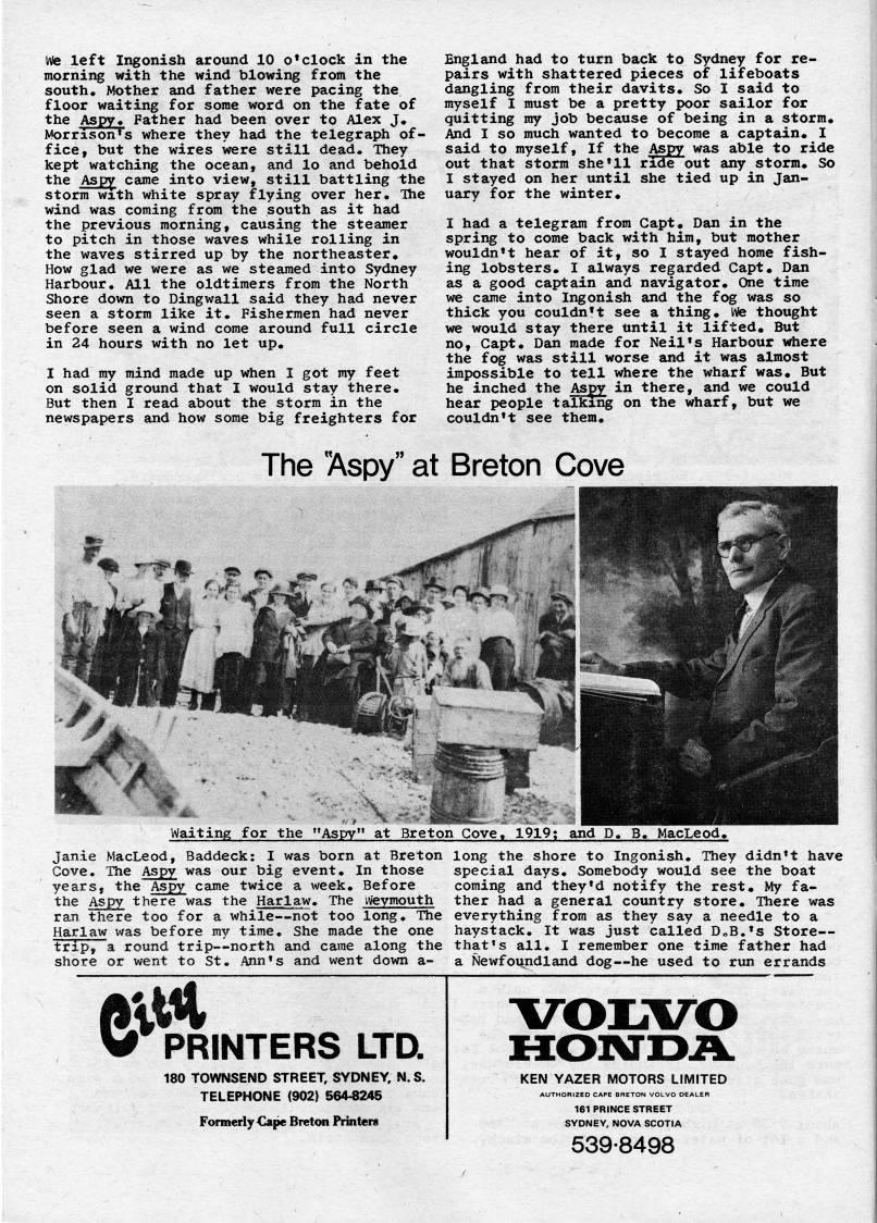 Published by Ronald Caplan on 1976/6/1 (451 reads)we left Ingonish around 10 o'clock in the morning with the wind blowing from the south. Mother and father were pacing the floor waiting for some word on the fate of the Aspy. Father had been over to Alex J. Morrison's where they had the telegraph of? fice, but the wires were still dead. They kept watching the ocean, and lo and behold the Aspy came into view, still battling the storm with white spray flying over her. The wind was coming from the south as it had the previous morning, causing the steamer to pitch in those waves while rolling in the waves stirred up by the northeaster. How glad we were as we steamed into Sydney Harbour. All the oldtimers from the North Shore down to Dingwall said they had never seen a storm like it. Fishermen had never before seen a wind come around full circle in 24 hours with no let up. I had my mind made up when I got my feet on solid ground that I would stay there. But then I read about the storm in the newspapers and how some big freighters for England had to turn back to Sydney for re? pairs with shattered pieces of lifeboats dangling from their davits. So I said to myself I must be a pretty poor sailor for quitting my job because of being in a storm. And I so much wanted to become a captain. I said to myself. If the Aspy was able to ride out that storm she'll ride out any storm. So I stayed on her until she tied up in Jan? uary for the winter. I had a telegram from Capt. Dan in the spring to come back with him, but mother wouldn't hear of it, so I stayed home fish? ing lobsters. I always regarded Capt. Dan as a good captain and navigator. One time we came into Ingonish and the fog was so thick you couldn't see a thing, m thought we would stay there until it lifted. But no, Capt. Dan made for Neil's Harbour where the fog was still worse and it was almost impossible to tell where the wharf was. But he inched the Aspy in there, and we could hear people talking on the wharf, but we couldn't see them. The Aspy" at Breton Cove Waiting for the "Aspy" at Breton Cove. 1919; and D. B. MacLeod. Janie MacLeod, Baddeck; I was born at Breton long the shore to Ingonish. They didn't have Cove, The Aspy was our big event. In those special days. Somebody would see the boat years, the Aspy came twice a week. Before coming and they'd notify the rest. My fa- the Aspy there was the Harlaw. The Weymouth ther had a general country store. There was ran there too for a while • not too long. The everything from as they say a needle to a Harlaw was before my time. She made the one haystack. It was just called D • B.'s Store-- trip, a round trip • north and came along the that's all. I remember one time father had shore or went to St, Ann's and went down a- a Newfoundland dog • he used to run errands e'p PRINTERS LTD. 180 TOWNSEND STREET. SYDNEY, N. S. TELEPHONE (902) 564'245 Formerly Cape Bret