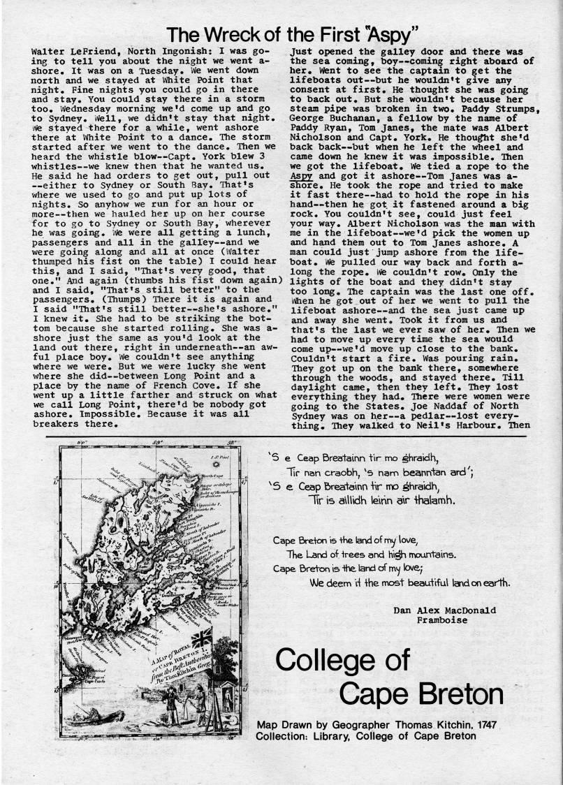 Published by Ronald Caplan on 1976/6/1 (367 reads)Walter LePriend, North Ingonish; T was go? ing to tell you about the night we went a- shore. It was on a Tuesday. We went down north and we stayed at White Point that night. Fine nights you could go in there and stay. You could stay there in a storm too. Wednesday morning we'd come up and go to Sydney. Well, we didn't stay that night. We stayed there for a while, went ashore there at White Point to a dance. The storm started after we went to the dance. Then we heard the whistle blow • Capt. York blew 3 whistles • we knew then that he wanted us. He said he had orders to get out, pull out • either to Sydney or South Bay. That's where we used to go and put up lots of nights. So anyhow we run for an hour or more • then we hauled her up on her course for to go to Sydney or South Bay, wherever he was going, iite were all getting a lunch, passengers and all in the galley • and we were going along and all at once (Walter thumped his fist on the table) I could hear this, and I said, "That's very good, that one." And again (thumbs his fist down again) and I said, "That's still better" to the passengers. (Thumps) There it is again and I said "That's still better • she's ashore." I knew it. She had to be striking the bot? tom because she started rolling. She was a- shore just the same as you'd look at the land out there, right in underneath • an aw? ful place boy. We couldn't see anything where we were. But we were lucky she went where she did • between Long Point and a place by the name of French Cove. If she went up a little farther and struck on what we call Long Point, there'd be nobody got ashore. Impossible. Because it was all breakers there. The Wreck of the First "Aspy" Just opened the galley door and there was the sea coming, boy • coming right aboard of her. Went to see the captain to get the lifeboats out • but he wouldn't give any consent at first. He thought she was going to back out. But she wouldn't because her steam pipe was broken in two. Paddy Strumps, George Buchanan, a fellow by the name of Paddy Ryan, Tom Janes, the mate was Albert Nicholson and Capt. York. He thou't she'd back back • but when he left the wheel and came down he knew it was impossible. Then we got the lifeboat. We tied a rope to the Aspy and got it ashore • Tom Janes was a- shore. He took the rope and tried to make it fast there • had to hold the rope in his hand • then he got it fastened around a big rock. You couldn't see, could just feel your way. Albert Nicholson was the man with me in the lifeboat • we'd pick the women up and hand them out to Tom Janes ashore. A man could just jump ashore from the life? boat. We pulled our way back and forth a- long the rope. We couldn't row. Only the lights of the boat and they didn't stay too long. Ihe captain was the last one off. When he got out of her we went to pull the lifeboat ashore • and the sea just came up and away she went. Took it from us and that's the last we ever saw of her. Then we had to move up every time the sea would come up • we'd move up close to the bank. Couldn't start a fire. Was pouring rain. Ihey got up on the bank there, somewhere through the woods, and stayed there. Till daylight came, then they left. They lost everything they had. There were women were going to the States. Joe Naddaf of North Sydney was on her • a pedlar • lost every? thing. They walked to Neil's Harbour. Then '5 e Ceap Breatalnn tir mo ghra'idh, "Hr nan craobh, '5 nam beainn"tan ard') '5 e Ceap breateinn Wr mo ghraidh' lir is a Uiclh leir n 6 r ihatemh. Cape Breton b +he land of my love' The Land of irees and h'l' mountains. Cape Breton is "the land of m' love; We deem li +he most beautiful landonearlK. Dan Alex MacDonald Framboise College of Cape Breton Map Drawn by Geographer Thomas Kitchin, 1747 Collection: Library, College of Cape Breton