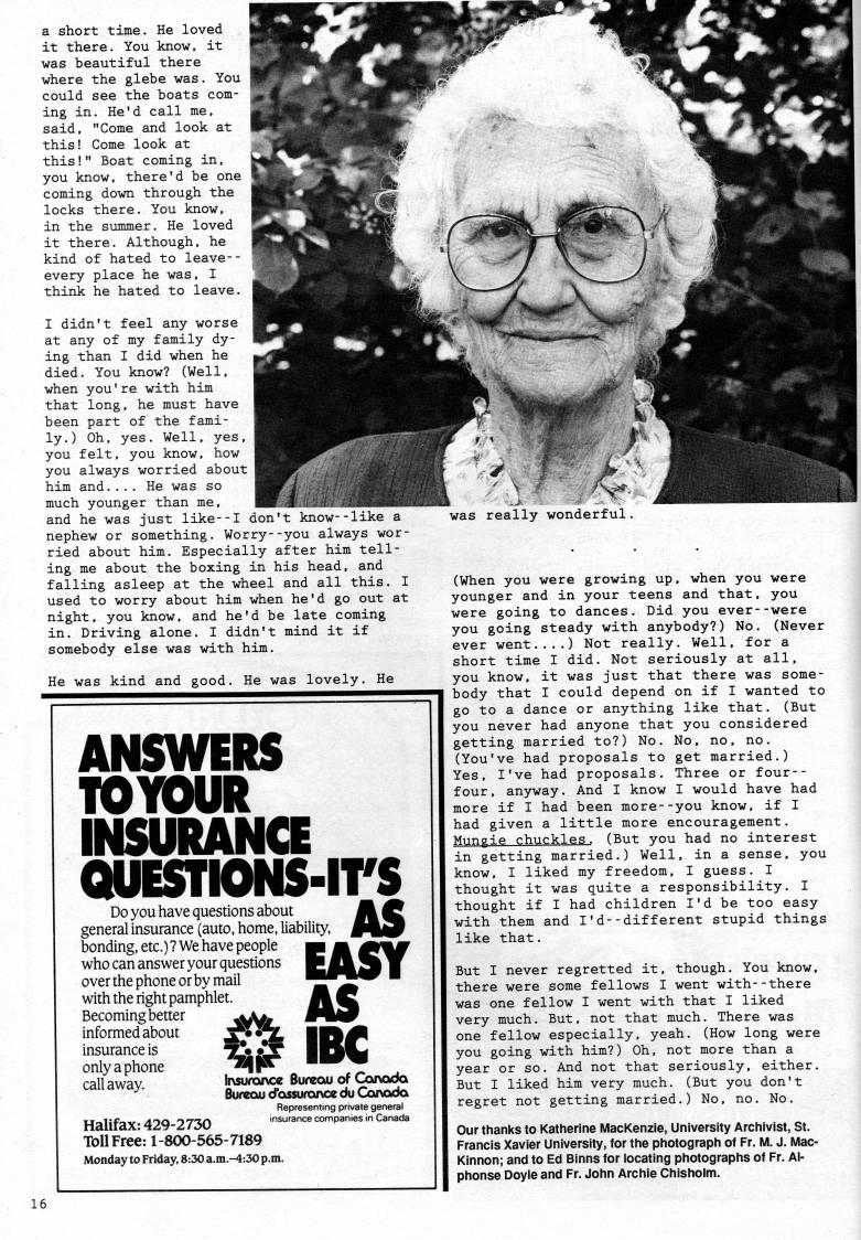 Published by Ronald Caplan on 1992/1/1 (385 reads)a short time. He loved it there. You know, it was beautiful there where the glebe was. You could see the boats com? ing in. He'd call me. said. "Come and look at this! Come look at this!" Boat coming in. you know, there'd be one coming down through the locks there. You know, in the summer. He loved it there. Although, he kind of hated to leave-- every place he was, I think he hated to leave. I didn't feel any worse at any of my family dy? ing than I did when he died. You know? (Well, when you're with him that long, he must have been part of the fami? ly.) Oh. yes. Well. yes. you felt, you know, how you always worried about him and.... He was so much younger than me, and he was just like--I don't know--like a nephew or something. Worry--you always wor? ried about him. Especially after him tell? ing me about the boxing in his head, and falling asleep at the wheel and all this. I used to worry about him when he'd go out at night, you know, and he'd be late coming in. Driving alone. I didn't mind it if somebody else was with him. He was kind and good. He was lovely. He ANSWERS fOYOUR QUEsnoNS-irs Do you have questions about JkC general insurance (auto, home, liability, iMi9 bonding, etc.) ? We have people h M 'f'M who can answer your questions E Am S jm over the phone or by mail mt''' with the right pamphlet. 'L k Becoming better 'J' M'%9 informed about insurance is only a phone Callaway. Halifax: 429-2730 Toll Free: 1-800-565-7189 Monday to Friday, 8:30 a.m.-4:30 p.m. irxsuronce Bureau of G'noda Bureau cfas$urar>ce du Canada Representing private general insurance companies in Canada was really wonderful. (When you were growing up, when you were younger and in your teens and that. you were going to dances. Did you ever--were you going steady with anybody?) No. (Never ever went....) Not really. Well, for a short time I did. Not seriously at all, you know, it was just that there was some? body that I could depend on if I wanted to go to a dance or anything like that. (But you never had anyone that you considered getting married to?) No. No. no. no. (You've had proposals to get married.) Yes. I've had proposals. Three or four-- four. anyway. And I know I would have had more if I had been more--you know, if I had given a little more encouragement. Mungie chuckles. (But you had no interest in getting married.) Well, in a sense, you know, I liked my freedom. I guess. I thought it was quite a responsibility. I thought if I had children I'd be too easy with them and I'd--different stupid things like that. But I never regretted it. though. You know, there were some fellows I went with--there was one fellow I went with that I liked very much. But. not that much. There was one fellow especially, yeah. (How long were you going with him?) Oh, not more than a year or so. And not that seriously, either. But I liked him very much. (But you don't regret not getting married.) No, no. No. Our thanks to Katherine MacKenzie, University Archivist, St. Francis Xavier University, for the photograph of Fr. M. J. l/lac- Kinnon; and to Ed Binns for locating photographs of Fr. Al? phonse Doyle and Fr. John Archie Chisholm.
