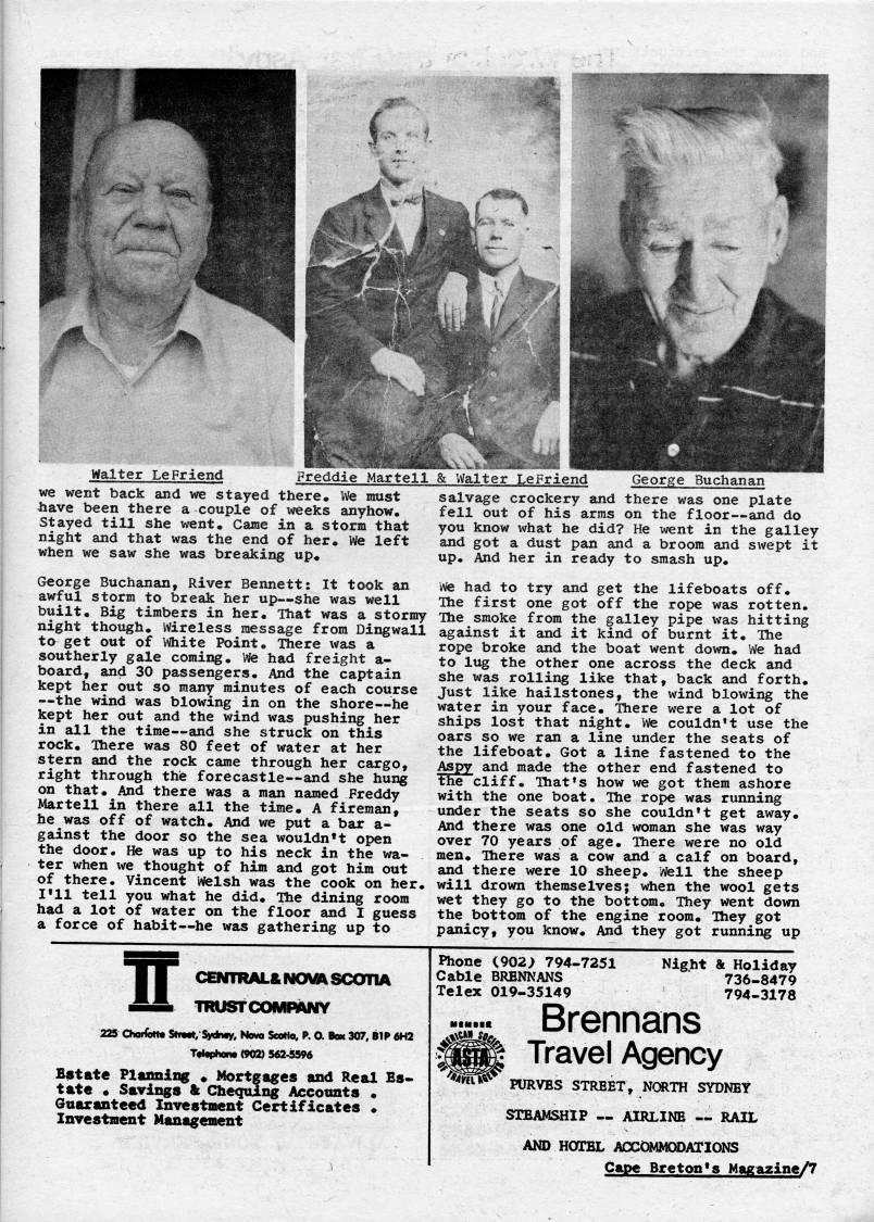 Published by Ronald Caplan on 1976/6/1 (426 reads)Walter LePriend Freddie Martell & Walter LeFriend George Buchanan we went back and we stayed there. We must have been there a couple of weeks anyhow. Stayed till she went. Came in a storm that night and that was the end of her. We left when we saw she was breaking up. George Buchanan, River Bennett: It took an awful storm to break her up • she was well built. Big timbers in her. That was a stormy night though. Wireless message from Dingwall to get out of White Point. There was a southerly gale coming. We had freight a- board, and 30 passengers. And the captain kept her out so man-' minutes of each course • the wind was blowing in on the shore • he kept her out and the wind was pushing her in all the time • and she struck on this rock. There was 80 feet of water at her stern and the rock came through her cargo, right through this forecastle • and she hung on that. And there was a man named Freddy Martell in there all the time. A fireman, he was off of watch. And we put a bar a- gainst the door so the sea wouldn't open the door. He was up to his neck in the wa? ter when we thought of him and got him out of there. Vincent Welsh was the cook on her. I'll tell you what he did. The dining room had a lot of water on the floor and I guess a force of habit • he was gathering up to salvage crockery and there was one plate fell out of his arms on the floor • and do you know what he did? He i-vent in the galley and got a dust pan and a broom and swept it up. And her in ready to smash up. we had to try and get the lifeboats off. The first one got off the rope was rotten. The smoke from the galley pipe was hitting against it and it kind of burnt it. The rope broke and the boat went down. We had to lug the other one across the deck and she was rolling like that, back and forth. Just like hailstones, the wind blowing the water in your face. There were a lot of ships lost that night. We couldn't use the oars so we ran a line under the seats of the lifeboat. Got a line fastened to the Aspy and made the other end fastened to the cliff. That's how we got them ashore with the one boat. The rope was running under the seats so she couldn't get away. And there was one old woman she was way over 70 years of age. There were no old men. There was a cow and a calf on board, and there were 10 sheep. Well the sheep will drown themselves; when the wool gets wet they go to the bottom. They went down the bottom of the engine room. They got panicy, you know. And they got running up CENTRAL& NOVA SCOTIA TRUStCOMmMY 225 Chorlott* Stiwt/Sydnty, Novo ScoHa, P. O. Box 307, BIP 6H2 TfMwm (902) 562-5596 Bstate Plaxming • Mortgages and Real Es? tate • Savings & Chequing Accounts • Guaranteed Investment Certificates • Inyestnent Management Phone C902> 794-7251 Cable BRENNANS Telex 019-35149 Night & Holiday 736-8479 794-3178 Brennans Travel Agency '*mn!' PURVES STREET, NORTH SYDNEY STEAMSHIP • AIRLINE • RAIL AND HOTEL ACCOMMODATIONS Cape Breton's Magazine/7