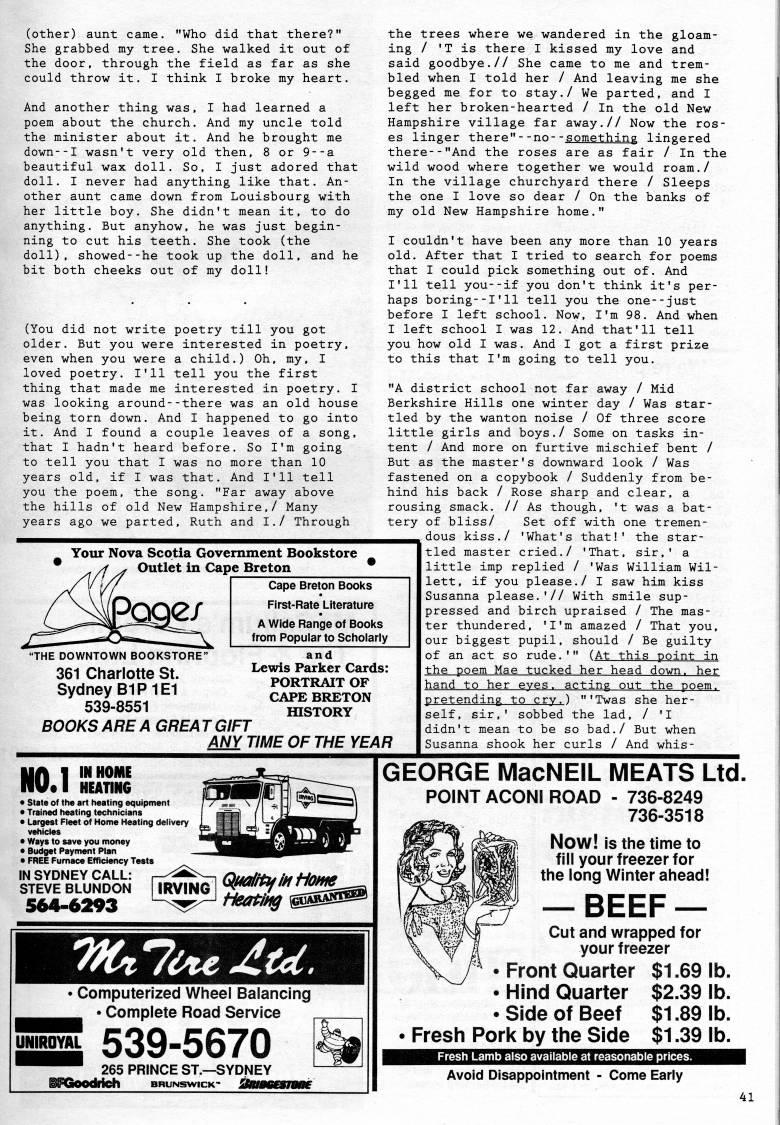 Published by Ronald Caplan on 1992/1/1 (384 reads)(other) aunt came. "Who did that there?" She grabbed my tree. She walked it out of the door, through the field as far as she could throw it. I think I broke my heart. And another thing was, I had learned a poem about the church. And my uncle told the minister about it. And he brought me down--I wasn't very old then, 8 or 9--a beautiful wax doll. So, I just adored that doll. I never had anything like that. An? other aunt came down from Louisbourg with her little boy. She didn't mean it, to do anything. But anyhow, he was just begin? ning to cut his teeth. She took (the doll), showed--he took up the doll, and he bit both cheeks out of my doll! (You did not write poetry till you got older. But you were interested in poetry, even when you were a child.) Oh, my, I loved poetry. I'll tell you the first thing that made me interested in poetry. I was looking around--there was an old house being torn down. And I happened to go into it. And I found a couple leaves of a song, that I hadn't heard before. So I'm going to tell you that I was no more than 10 years old, if I was that. And I'll tell you the poem, the song. "Far away above the hills of old New Hampshire,/ Many years ago we parted, Ruth and I./ Through Your Nova Scotia Government Bookstore Outlet in Cape Breton Cape Breton Books First-Rate Literature A Wide Range of Bool<:s from Popular to Scholarly "THE DOWNTOWN BOOKSTORE" 361 Charlotte St. Sydney B1P1E1 539-8551 and Lewis Parker Cards: PORTRAIT OF CAPE BRETON HISTORY the trees where we wandered in the gloam? ing / 'T is there I kissed my love and said goodbye.// She came to me and trem? bled when I told her / And leaving me she begged me for to stay./ We parted, and I left her broken-hearted / In the old New Hampshire village far away.// Now the ros? es linger there"--no-- something lingered there--"And the roses are as fair / In the wild wood where together we would roam./ In the village churchyard there / Sleeps the one I love so dear / On the banks of my old New Hampshire home." I couldn't have been any more than 10 years old. After that I tried to search for poems that I could pick something out of. And I'll tell you--if you don't think it's per? haps boring--I'11 tell you the one--just before I left school. Now, I'm 98. And when I left school I was 12. And that'll tell you how old I was. And I got a first prize to this that I'm going to tell you. "A district school not far away / Mid Berkshire Hills one winter day / Was star? tled by the wanton noise / Of three score little girls and boys./ Some on tasks in? tent / And more on furtive mischief bent / But as the master's downward look / Was fastened on a copybook / Suddenly from be? hind his back / Rose sharp and clear, a rousing smack. //As though, 't was a bat? tery of bliss/ Set off with one tremen- ''1''' dous kiss./ 'What's that!' the star? tled master cried./ 'That, sir,' a little imp replied / 'Was William Wil- lett, if you please./ I saw him kiss Susanna please.'// With smile sup? pressed and birch upraised / The mas? ter thundered, 'I'm amazed / That you, our biggest pupil, should / Be guilty of an act so rude.'" (At this point in the poem Mae tucked her head down, her BOOKS ARE A GREA T GIFT ANY TIME OF THE YEAR hand to her eyes, acting out the poem. pretending to cry.) Twas she her? self, sir,' sobbed the lad. / 'I didn't mean to be so bad./ But when Susanna shook her curls / And whis- im I IN HOME nv?l HEATING • State of the art heating equipment • Trained heating technicians • Largest Fleet of Home Heating delivery vehicles • Ways to save you money • Budget Payment Plan • FREE Furnace Efficiency Tests IN SYDNEY CALL: STEVE BLUNDON I IRVING 564-6293 '' IfUlixeJLtd. • Computerized Wheel Balancing '''' • Complete Road Service IJBi 539-5670 '''' 265 PRINCE ST. • SYDNEY @IFQeodrich brunswick- QmasesmK GEORGE MacNEIL MEATS Ltd. POINT ACONI ROAD - 736-8249 736-3518 Now! is the time to fill your freezer for the long Winter ahead! • BEEF • Cut and wrapped for your freezer Front Quarter $1.69 lb. Hind Quarter $2.39 lb. • Side of Beef $1.89 lb. Fresh Pork by the Side $1.39 lb. Fresh Lamb also available at reasonable prices. Avoid Disappointment - Come Early
