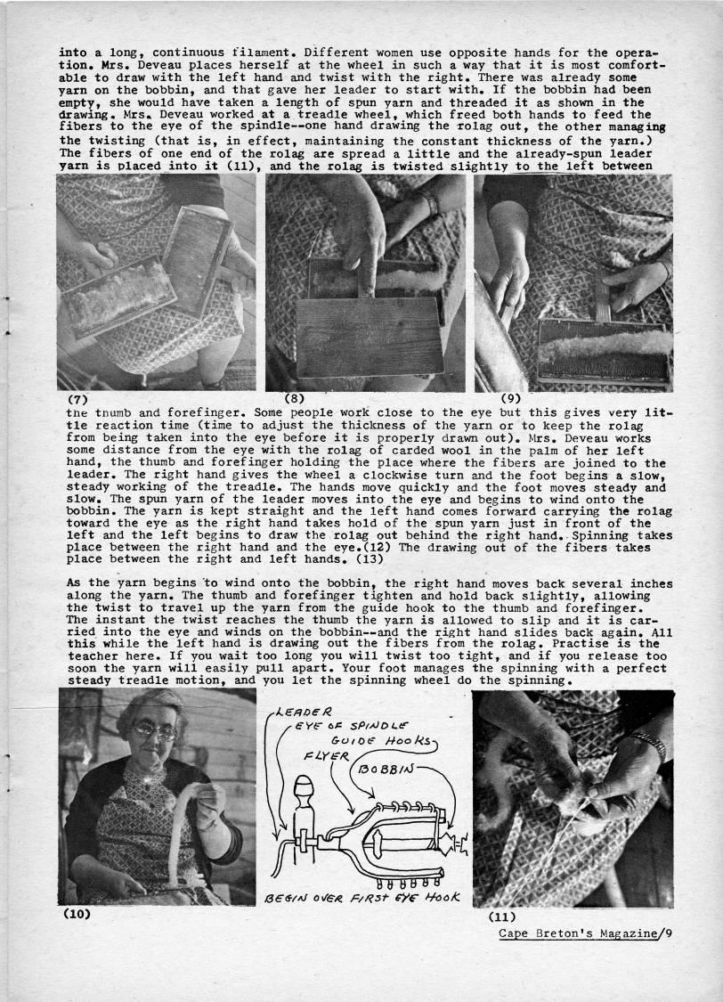 Published by Ronald Caplan on 1973/1/1 (974 reads)into a long, continuous filament. Different women use opposite hands for the opera? tion. Mrs. Deveau places herself at the wheel in such a way that it is most comfort? able to draw with the left hand and twist with the right. There was already some yarn on the bobbin, and that gave her leader to start with. If the bobbin had been empty, she would have taken a length of spun yarn and threaded it as shown in the drawing. Mrs* Deveau worked at a treadle wheel, which freed both hands to feed the fibers to the eye of the spindle • one hand drawing the rolag out, the other managing the twisting (that is, in effect, maintaining the constant thickness of the yarn.) The fibers of one end of the rolag are spread a little and the already-spun leader yarn is placed into it (11), and the rolag is twisted slightly to the left between the tnumb and forefinger. Some people work close to the eye but this gives very lit? tle reaction time (time to adjust the thickness of the yarn or to keep the rolag from being taken into the eye before it is properly drawn out). Mrs. Deveau works some distance from the eye with the rolag of carded wool in the palm of her left hand, the thumb and forefinger holding the place where the fibers are joined to the leader. The right hand gives the wheel a clockwise turn and the foot begins a slow, steady working of the treadle. The hands move quickly and the foot moves steady and slow. The spun yarn of the leader moves into the eye and begins to wind onto the bobbin. The yarn is kept straight and the left hand comes forward carrying the rolag toward the eye as the right hand takes hold of the spun yarn just in front of the left and the left begins to draw the rolag out behind the right hand.- Spinning takes place between the right hand and the eye.(12) The drawing out of the fibers takes place between the right and left hands. (13) As the yarn begins to wind onto the bobbin, the right hand moves back several inches along the yarn. The thumb and forefinger tighten and hold back slightly, allowing the twist to travel up the yarn from the guide hook to the thumb and forefinger. The instant the twist reaches the thumb the yarn is allowed to slip and it is car? ried into the eye and winds on the bobbin • and the right hand slides back again. All this while the left hand is drawing out the fibers from the rolag. Practise is the teacher here. If you wait too long you will twist too tight, and if you release too soon the yarn will easily pull apart. Your foot manages the spinning with a perfect steady treadle motion, and you let the spinning wheel do the spinning. 3 • -(S-/aj o /e/z /v/?5A 'e H'cK (10) (11) Cape Breton's Magazine/9