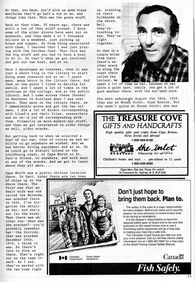 Published by Ronald Caplan on 1992/1/1 (218 reads)So then, you know, you'd pick up some brass manifolds that'd go half a ton or so. and things like this. This was the gravy stuff. Back at that time, 30 years ago, there was still a lot of that stuff around. I know some of the older divers here went out on weekends, and they made 4 or 5 thousand dollars on a weekend, just picking up brass and copper. So from being associated with them, I learned that I was just play? ing with the chicken feed. That this was the big stuff and you had to have a boat to do it. So that's when we got involved and got our own boat, and so on. Once I developed an interest, then it was just a short trip to the library to start doing some research and so on. I spent many, many hours in the library there. And then at one point I lived in Halifax for awhile, and I spent a lot of times in the archives at the college, and at the public library. And I came across these (books) in Aberdeen in Scotland when I was over there. They were in the library there, so I immediately wrote and got the two vol? umes. I did a lot of direct corresponding with Lloyd's and their files, researchers and so on--a lot of corresponding with them. Primarily on more modern-day stuff, and then we got interested in older things as well, older wrecks. But getting back to when we acquired a boat of our own, then of course we had mo? bility to go anywhere we wished. And we had better diving equipment and so on. So we could go to Scatari Island or the Louisbourg coast, or Cape North or St. Paul's Island, or anywhere, and work away at any of the wrecks. And we got to learn where they all were.... Cape North was a pretty obvious location there. In fact, today there are two bows of ships up on the shore there. The first one that we dealt with was one called the Noranda, was wrecked there in 1935. I've for? gotten the detail on her, and she's not (in the book). Then there was an? other one--when was she wrecked?--you'd probably remember her--the Corrida, that was wrecked December 20th, 1976, I think it was. So there's lots to dive on there. That's right out on the cape it? self. As I say, they're marked with the two bows right up, standing on their bulkheads on the shore. Well, they're touching to? day. They're right together. 'm H' W' So then in a couple miles from there there's an? other wreck in along the coast there called the Lovland. We spent a lot of time on her, because it was quite a quiet spot, really, you get a lot of good weather there, with the nor'west wind. She went ashore:.'n August the 18th. 1939. they say at Money Point, Cape Breton. But she wasn't quite at Money Point; she was THE TREASURE COVE GIFTS AND HANDCRAFTS High quality gifts and crafts from Cape Breton, Nova Scotia and abroad 1-902-564-8158 Children's books and toys - pre-school to 12 years 1-902-539-3035 Open Mon.-Sat. 9-6, Thurs.-Fri. until 9 74 Townsend St., Sydney, N. S. 81P 5C8 Don't just hope to bring them back. Plan to. The safety of the crew is a major responsibility for every skipper. Before you head out to sea this season, be sure everyone on board knows what to do during an emergency. It is the skipper's responsibility to have the required safety gear on board and to be sure that everyone on the vessel knows how to use it. Promoting safety awareness will go a long way to making your next trip a safe one. The Canadian Coast Guard can help you and your crew prepare. Call our toll-free marine safety information line at 1-800-267-6687 for a free copy of the Small Fishing Vessel Safety Manual. Canada Fish Safely.
