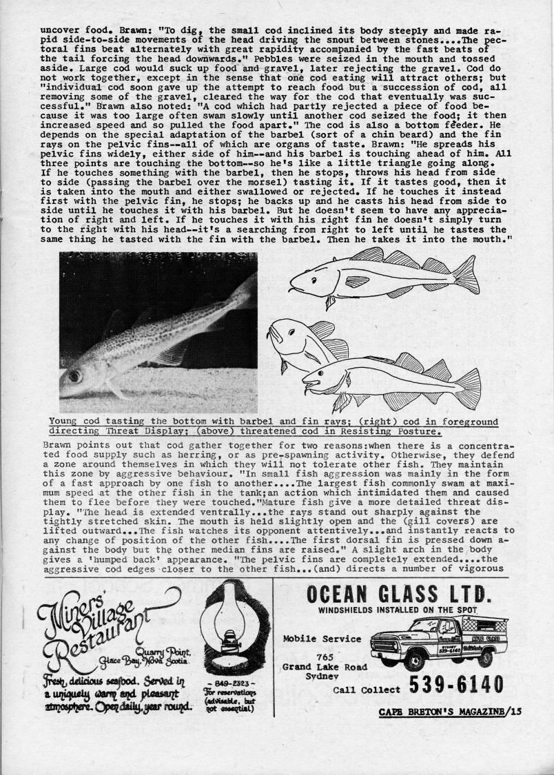 Published by Ronald Caplan on 1976/6/1 (299 reads)uncover food* Brawn: "To dig, the small cod inclined its body steeply and made ra? pid side-to-side movements of the head driving the snout between stones....The pec? toral fins beat alternately with great rapidity accompanied by the fast beats of the tail forcing the head downwards." Pebbles were seized in the mouth and tossed aside. Large cod would suck up food and gravel, later rejecting the gravel. Cod do not work together, except in the sense that one cod eating will attract others; but "individual cod soon gave up the attempt to reach food but a succession of cod, all removing some of the gravel, cleared the way for the cod that eventually was suc? cessful." Brawn also noted: "A cod which had partly rejected a piece of food be? cause it was too large often swam slowly until another cod seized the food; it then increased speed and so pulled the food apart." The cod is also a bottom feeder. He depends on the special adaptation of the barbel (sort of a chin beard) and the fin rays on the pelvic fins • all of which are organs of taste. Brawn; "He spreads his pelvic fins widely, either side of him • and his barbel is touching ahead of him. All three points are touching the bottom • so he's like a little triangle going along. If he touches something with the barbel, then he stops, throws his head from side to side (passing the barbel over the morsel) tasting it. If it tastes good, then it is taken into the mouth and either swallowed or rejected. If he touches it instead first with the pelvic fin, he stops; he backs up and he casts his head from side to side until he touches it with his barbel. But he doesn't seem to have any apprecia? tion of right and left. If he touches it with his right fin he doesn't simply turn to the right with his head • it's a searching from right to left until he tastes the same thing he tasted with the fin with the barbel. Then he takes it into the mouth." Young cod tasting the bottom with barbel and fin rays; (right) cod in foreground directing Threat Display; (above) threatened cod in Resisting Posture. Brawn points out that cod gather together for two reasons:when there is a concentra? ted food supply such as herring, or as pre-spawning activity. Otherwise, they defend a zone around themselves in which they will not tolerate other fish. They maintain this zone by aggressive behaviour. "In small fish aggression was mainly in the form of a fast approach by one fish to another....The largest fish commonly swam at maxi? mum speed at the other fish in the tank;an action which intimidated them and caused them to flee before they were touched."Mature fish give a more detailed threat dis? play. "Ihe head is extended ventrally...the rays stand out sharply against the tightly stretched skin. The mouth is held slightly open and the (gill covers) are lifted outward...Ihe fish watches its opponent attentively...and instantly reacts to any change of position of the other fish....The first dorsal fin is pressed down a- gainst the body but th' other median fins are raised." A slight arch in the body gives a 'humped back' appearance. "The pelvic fins are completely extended....the aggressive cod edges closer to the other fish...(and) directs a number of vigorous ',. OCEAN GLASS LTD. WINDSHIELDS INSTM.LED ON THE SPOT Mobile Service 765 Grand Lake Road Sydnev 539-6140 Call Collect CAPS BRETON'S MAGAZIWB/15
