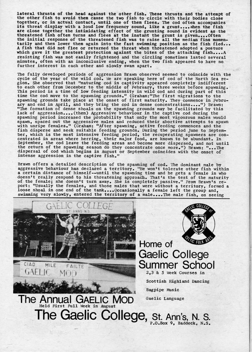 Published by Ronald Caplan on 1976/6/1 (294 reads)lateral thrusts of the head against the other fish. These thrusts and the attempt of the other fish to avoid thera cause the two fish to circle with their bodies close together, or in actual contact, until one of them flees. The cod often accompanies its threat display with a loud low frequency sound, like a grunt....When the fish are close together the intimidating effect of the grunting sound is evident as the threatened fish often turns and flees at the instant the grunt is given....Often the initial response of the threatened fish was to raise all the median fins momen? tarily and then lower them again into the fast swimming position as the fish fled... A fish that did not flee or returned the threat when threatened adopted a posture which gave it the greatest protection against the bites of the attacking fish....A resisting fish was not easily frightened and the circling sometimes lasted several minutes, often with an inconclusive ending, when the two fish appeared to have no. further interest in each other and slowly swam apart. The fully developed periods of aggression Braivn observed seemed to coincide with the cycle of the year of the wild cod. We are speaking here of cod of the North Sea re? gion. She observed that "maturing cod in captivity appeared completely indifferent to each other from December to the middle of February, three weeks before spawning. This period is a tirae of low feeding intensity in wild cod and during part of this time the cod move to the spawning grounds." (Graham;"The first migrations to the spawning grounds take place at the onset of first maturity. They commence in Febru? ary and end in April, and they bring the cod in dense concentrations....") Bravm; "The formation of dense shoals on the spawning grounds may be facilitated by this lack of aggression....(then) Aggressive behaviour in the captive cod during the spawning period increased the probability that only the most vigourous males would spawn, spaced out the aggressive males and reduced their abortive attempts to spawn with unripe females." (Graham; "After spawning, active feeding commences and the fish disperse and seek suitable feeding grounds. During the period June to Septem? ber, which is the most intensive feeding period, the recuperating spawners are con? centrated in areas where herring, their major food, are known to be abundant. In September, the cod leave the feeding areas and become more dispersed, and not until the return of the spawning season do they concentrate once more.") Brawn; "...The dispersal of cod which begins in August or September coincides with the onset of intense aggression in the captive fish." Brawn offers a detailed description of the spawning of cod. The dominant male by aggressive behaviour has declared a territory. "He won't tolerate other fish within a certain distance of himself • until the spawning time and he gets a female in who doesn't really respond to his threatening approach. That's the test of the maturity of the female; she doesn't turn away. She is completely passive." From Brawn's re? port; "Usually the females, and those males that were without a territory, formed a loose shoal in one end of the tank....Occasionally a female left the group and, swimming very slowly, entered the territory of a male....The male fish, on seeing The Annual Gaelic Mod Held First Pull Week in August Home of Gaelic College Summer School 2,3 & 5 Week Courses in Scottish Highljuid Dancing Bagpipe Music Gaelic Language The Gaelic College, st. Anns, n. s. P.O.Box 9, Baddeck, N.S.
