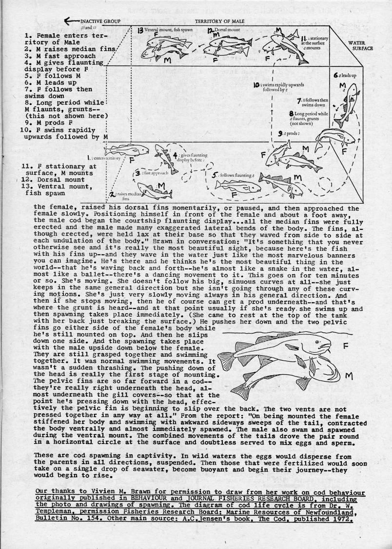 ' ??' • ?INACTIVE GROUP TERRITORY OF MALE 1. Female enters ter? ritory of Male 2. M raises median fins/ 3. M fast approach 4. M gives flaunting, display before F 5. F follows M 6. M leads up 7. P follows then swims down 8. Long period while M flaunts, grunts • (this not shown here) 9. M prods F 10. F swims rapidly upwards followed by 11. F stationary at surface, M mounts 12. Dorsal mount 13. Ventral mount, fish spawn the female, raised his dorsal fins momentarily, or paused, and then approached the female slowly. Positioning himself in front of the female and about a foot away, the male cod began the courtship flaunting display...all the median fins were fully erected and the male made many exaggerated lateral bends of the body. The fins, al? though erected, were held lax at their base so that they waved from side to side at each undulation of the body." Brawn in conversation; "It's something that you never otherwise see and it's really the most beautiful sight, because here's the fish with his fins up • and they wave in the water just like the most marvelous banners you can imagine. He's there and he thinks he's the most beautiful thing in the world • that he's waving back and forth • he's alraost like a snake in the water, al? most like a ballet • there's a dancing moveraent to it. This goes on for ten minutes or so. She's moving. She doesn't follow his big, sinuous curves at all • she just keeps in the same general direction but she isn't going through any of these curv? ing motions. She's just very slowly moving always in his general direction. And then if she stops moving, then he of course can get a prod underneath • and that's where the grunt is heard • and at that point usually if she's ready, she swims up and then spawning takes place immediately. (She came to rest at the top of the tank with her back just breaking the surface.) He pushes her down and the two pelvic fins go either side of the female's body while he's still mounted on top. And then he slips down one side. And the spawning takes place with the male upside down below the female. They are still grasped together and swimming together. It was normal swimming movements. It ' wasn't a sudden thrashing. The pushing down of the head is really the first stage of mounting. '''.'sf''' """rs'J' ""I') ' The pelvic fins are so far forward in a cod • ' " "' they're really right underneath the head, al? most underneath the gill covers • so that at the point he's pressing down with the head, effec? tively the pelvic fin is beginning to slip over the back. Ihe two vents are not pressed together in any way at all." From the report: "On being mounted the female stiffened her body and swimming with awkward sideways sweeps of the tail, contracted the body ventrally and almost immediately spawned. The male also swam and spawned during the ventral mount. The combined movements of the tails drove the pair round in a horizontal circle at the surface and doubtless served to mix eggs and sperm. These are cod spawning in captivity. In wild waters the eggs would disperse from the parents in all directions, suspended. Then those that were fertilized would soon take on a single drop of seawater, become buoyant and begin their journey • they would begin to rise. Our thanks to Vivien M. Brawn for permission to draw from her work on cod behaviour originally published in BEHAVIOUR and JOURNAL.FISHERIES RESEARCH BOARD, including the photo and drawings of spawning. The diagram of cod life cycle is from Dr. W. Templeman. permission Fisheries Research Board: Marine Resources of Newfoundland. Bulletin No. 154. Other main source; A.C.Jensen's book. The Cod, published 1972.