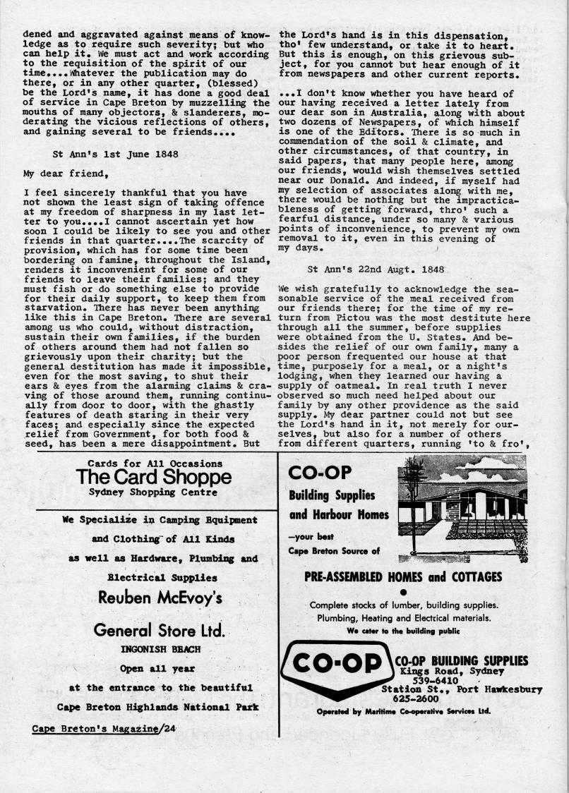 Published by Ronald Caplan on 1976/6/1 (335 reads)dened and aggravated against means of know? ledge as to require such severity; but who can help it. We must act and work according to the requisition of the spirit of our time....Whatever the publication may do there, or in any other quarter, (blessed) be the Lord's name, it has done a good deal of service in Cape Breton by muzzelling the mouths of many objectors, & slanderers, mo? derating the vicious reflections of others, and gaining several to be friends.... St Ann's 1st June 1848 My dear friend, I feel sincerely thankful that you have not shown the least sign of taking offence at my freedom of sharpness in my last let? ter to you..,.I cannot ascertain yet how soon I could be likely to see you and other friends in that quarter....Ihe scarcity of provision, which has for some time been bordering on famine, throughout the Island, renders it inconvenient for some of our friends to leave their families; and they must fish or do something else to provide for their daily support, to keep them from starvation. There has never been anything like this in Cape Breton. There are several among us who could, without distraction, sustain their own families, if the burden of others around them had not fallen so grievously upon their charity; but the general destitution has made it impossible, even for the most saving, to shut their ears & eyes from the alarming claims & cra? ving of those around them, running continu? ally from door to door, with the ghastly features of death staring in their very faces; and especially since the expected relief from Government, for both food & seed, has been a mere disappointment. But the Lord's hand is in this dispensation, tho' few understand, or take it to heart. But this is enough, on this grievous sub? ject, for you cannot but hear enough of it from newspapers and other current reports. ...I don't know whether you have heard of our having received a letter lately from our dear son in Australia, along with about two dozens of Newspapers, of which himself is one of the Editors. There is so much in commendation of the soil & climate, and other circumstances, of that country, in said papers, that many people here, among our friends, would wish themselves settled near our Donald. And indeed, if myself had my selection of associates along with me, there would be nothing but the impractica- bleness of getting forward, thro' such a fearful distance, under so many & various points of inconvenience, to prevent ray own removal to it, even in this evening of my days. St Ann's 22nd Augt. 1848 We wish gratefully to acknowledge the sea? sonable service of the meal received from our friends there; for the time of my re? turn from Pictou was the most destitute here through all the summer, before supplies were obtained from the U. States. And be? sides the relief of our own family, many a poor person frequented our house at that time, purposely for a meal, or a night's lodging, when they learned our having a supply of oatmeal. In real truth I never observed so much need helped about our family by any other providence as the said supply. My dear partner could not but see the Lord's hand in it, not merely for our? selves, but also for a number of others from different quarters, running 'to & fro'. Cards for All Occasions The Card Shoppe Sydney Shopping Centre We Specialize i' Camping Equipment and Clothing of All Kinds as well as Hardware, Plumbing and Blectrical Supplies Reuben McEvoy's General Store Ltd. IMGONISH BBACH Open all year at the entrance to the beautiful Cape Breton Highlands National Park Cape Breton's Magazine/24 CO-OP Building Supplies and Harbour Homes • your best Cape Breton Source of PRE-ASSEMBLED HOMES and COHAGES • Complete stocks of lumber, building supplies. Plumbing, Heating and Electrical materials. We cater to the building public 'CO-OD C00P BUILDING SUPPLIES '' '' '' ' Kings Road, Sydney 539-6410 Station St?, Port Hai'esbury 625-2600 Operated by Maritime Ce-eperative Services Ltd.