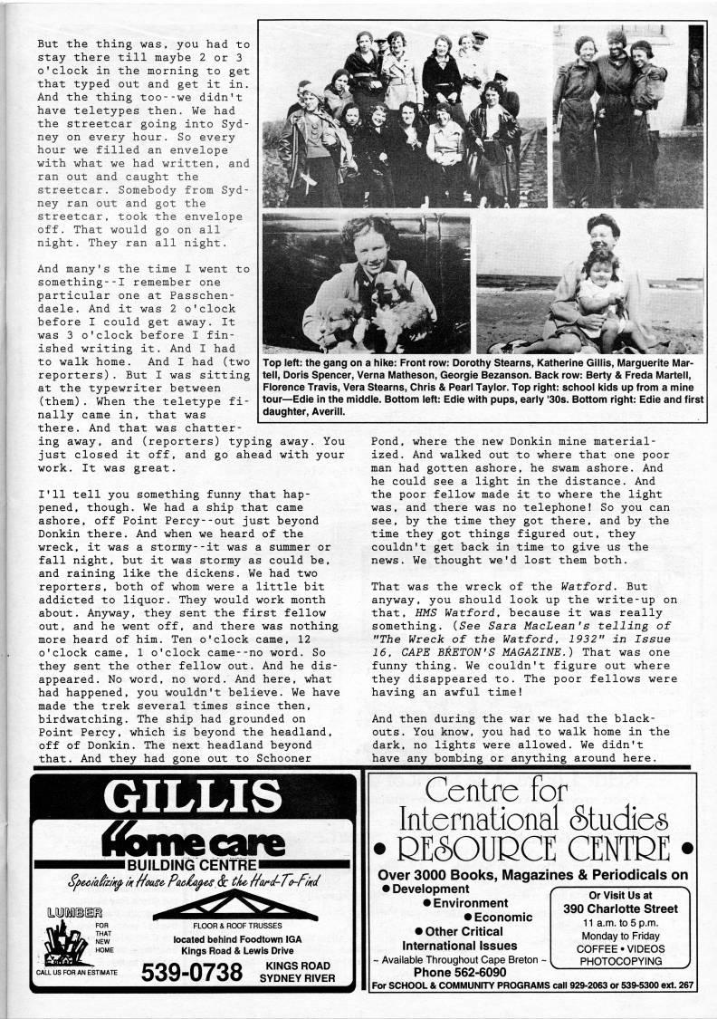 Published by Ronald Caplan on 1992/8/1 (424 reads)But the thing was, you had to stay there till maybe 2 or 3 o'clock in the morning to get that typed out and get it in. And the thing too--we didn't have teletypes then. We had the streetcar going into Syd? ney on every hour. So every hour we filled an envelope with what we had written, and ran out and caught the streetcar. Somebody from Syd? ney ran out and got the streetcar, took the envelope off. That would go on all night. They ran all night. And many's the time I went to something--! remember one particular one at Passchen? daele. And it was 2 o'clock before I could get away. It was 3 o'clock before I fin? ished writing it. And I had to walk home. And I had (two reporters). But I was sitting at the typewriter between (them). When the teletype fi? nally came in, that was there. And that was chatter? ing away, and (reporters) typing away just closed it off, and go ahead with work. It was great. Top left: the gang on a hike: Front row: Dorothy Stearns, Katherine Gillis, Marguerite Mar- tell, Doris Spencer, Verna Matheson, Georgie Bezanson. Bacl< row: Berty & Freda Martell, Florence Travis, Vera Stearns, Chris & Pearl Taylor. Top right: school Itids up from a mine tour • Edie in the middle. Bottom left: Edie with pups, early '30s. Bottom right: Edie and first daughter, Averill. You your I'll tell you something funny that hap? pened, though. We had a ship that came ashore, off Point Percy--out just beyond Donkin there. And when we heard of the wreck, it was a stormy--it was a summer or fall night, but it was stormy as could be, and raining like the dickens. We had two reporters, both of whom were a little bit addicted to liquor. They would work month about. Anyway, they sent the first fellow out, and he went off, and there was nothing more heard of him. Ten o'clock came, 12 o'clock came, 1 o'clock came--no word. So they sent the other fellow out. And he dis? appeared. No word, no word. And here, what had happened, you wouldn't believe. We have made the trek several times since then, birdwatching. The ship had grounded on Point Percy, which is beyond the headland, off of Donkin. The next headland beyond that. And they had gone out to Schooner Pond, where the new Donkin mine material? ized. And walked out to where that one poor man had gotten ashore, he swam ashore. And he could see a light in the distance. And the poor fellow made it to where the light was, and there was no telephone! So you can see, by the time they got there, and by the time they got things figured out, they couldn't get back in time to give us the news. We thought we'd lost them both. That was the wreck of the Watford. But anyway, you should look up the write-up on that, HMS Watford, because it was really something, ('ee Sara MacLean's telling of "The Wreck of the Watford, 1932" in Issue 16. CAPE BRETON'S MAGAZINE.) That was one funny thing. We couldn't figure out where they disappeared to. The poor fellows were having an awful time! And then during the war we had the black? outs. You know, you had to walk home in the dark, no lights were allowed. We didn't have any bombing or anything around here. GILLIS iibmecare ??HBUILDING CENTREHHl wm''i THAT NEW HOME CALL US FOR AN ESTIMATE FLOOR a ROOF TRUSSES located behind Foodtown IGA Kings Road & Lewis Drive KINGS ROAD SYDNEY RIVER 539-0738 Centre for International studies • DE(SOUDCE CENTRE • Over 3000 Books, Magazines & Periodicals on • Development • Environment • Economic • Other Critical International Issues ~ Available Throughout Cape Breton ~ Phone 562-6090 Or Visit Us at 390 Charlotte Street 11 a.m. to 5 p.m. Monday to Friday COFFEE • VIDEOS PHOTOCOPYING For SCHOOL & COMMUNITY PROGRAMS call 929-2063 or 539-5300 ext. 267