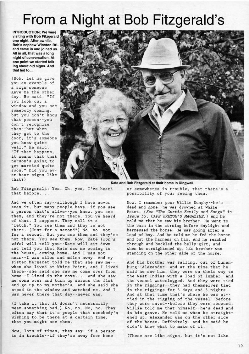 Published by Ronald Caplan on 1992/8/1 (582 reads)From a Night at Bob Fitzgerald's INTRODUCTION: We were visiting with Bob Fitzgerald one nighit. After awhile, Bob's nephew Winston Bri? and came in and joined us. All in all, that was a long night of conversation. At one point we started talk? ing about old signs. And that led to.... (Bob, let me give you an example of a sign someone gave me the other day. He said. "If you look out a window and you see somebody coming, but you don't know that person--you don't recognize them--but when they get to the door, it's someone you know quite well." He said, "If that happens, it means that that person's going to get married quite soon." Did you ev? er hear signs like that?) Bob Fitzgerald: Yes that before.... Kate and Bob Fitzgerald at their home in Dingwall . Oh, yes. I've heard or somewheres in trouble, that there's possibility of your seeing them. And we often say--although I have never seen it, but many people have--if you see a person that's alive--you know, you see them, and they're not there. You've heard of that, I suppose. They call it a "fetch." You see them and they're not there. (Just for a second?) No, no. not for a second. But you see them and they're not there. You see them. Now. Kate (Bob's wife) will tell you--Kate will sit down and tell you that Kate saw me coming to the house, coming home. And I was not near--I was miles and miles away. And my sister Margaret told me that she saw me-- when she lived at White Point, and I lived there--she said she saw me come over from home--I lived in the cove.... And she saw me come over and turn up across the flat and go up to my mother's. And she said she stood in the window and watched me. And I was never there that day--never was. (I take it that it doesn't necessarily mean something bad.) No. no. No. no. They often say that it's people that somebody's wishing to be there at a certain time, that you might see them. Now, lots of times, they say--if a person is in trouble--if they're away from home Now. I remember poor Willie Dunphy--he's dead and gone--he was drowned at White Point. (5ee "The Curtis Family and Songs" in Issue 55, CAPE BRETON'S MAGAZINE.) And he told me that he saw his brother. He went to the barn in the morning before daylight and harnessed the horse. He was going after a load of hay. And he told me he fed the horse and put the harness on him. And he reached through and buckled the belly-girt, and when he straightened up, his brother was standing on the other side of the horse. And his brother was sailing, out of Lunen? burg- -Alexander . And at the time that he said he saw him, they were on their way to the West Indies with a load of lumber. And the vessel waterlogged. And they were tied in the riggings--they had themselves tied in the riggings for 3 days and 3 nights. And at that time that's where he was at-- tied in the rigging of the vessel--before they were saved--before they were rescued. Willie told me that himself--he's dead and in his grave. He told me when he straight? ened up, Alexander was on the other side of the horse. Definitely. And he said he didn't know what to make of it. (These are like signs, but it's not like