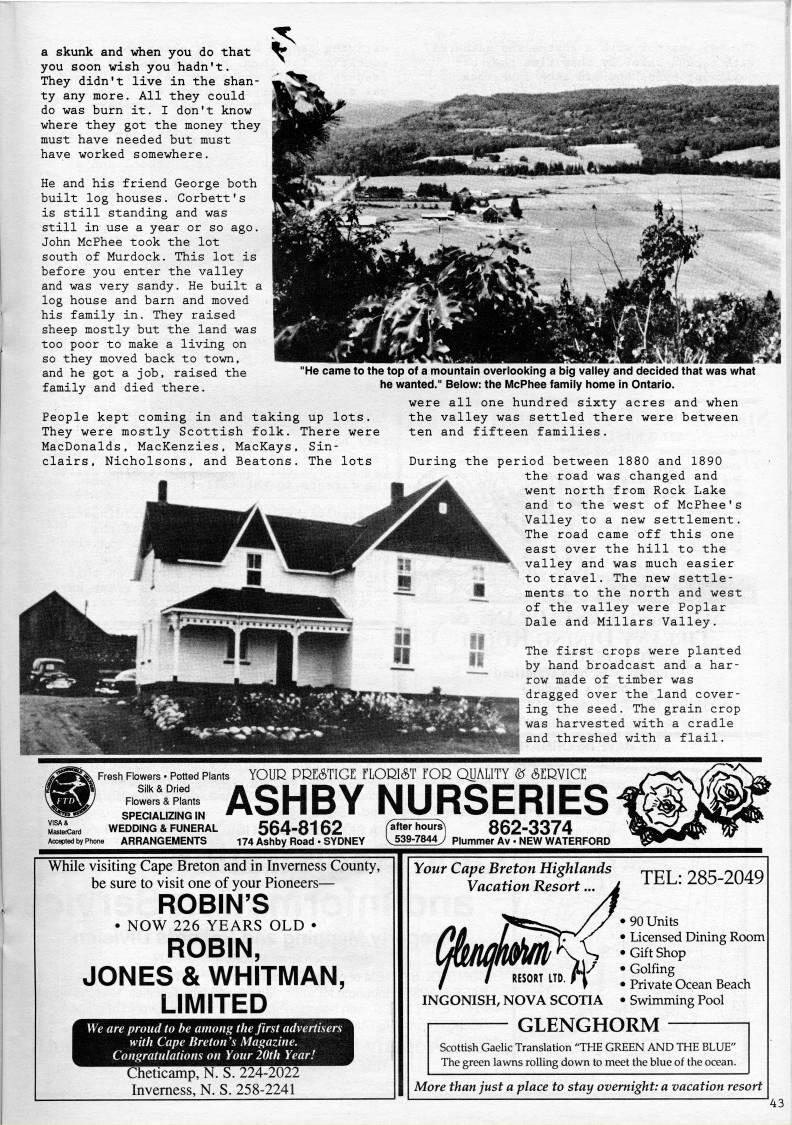 a skunk and when you do that you soon wish you hadn't. They didn't live in the shan? ty any more. All they could do was burn it. I don't know where they got the money they must have needed but must have worked somewhere. He and his friend George both built log houses. Corbett's is still standing and was still in use a year or so ago. John McPhee took the lot south of Murdock. This lot is before you enter the valley and was very sandy. He built a log house and barn and moved his family in. They raised sheep mostly but the land was too poor to make a living on so they moved back to town, and he got a job, raised the family and died there. People kept coming in and taking up lots They were mostly Scottish folk. There we MacDonalds, MacKenzies, MacKays, Sin- clairs, Nicholsons, and Beatons. The lot the top of a mountain overlooking a big valley and decided that was what he wanted." Below: the McPhee family home in Ontario. were all one hundred sixty acres and when the valley was settled there were between re ten and fifteen families. s During the period between 1880 and 1890 the road was changed and went north from Rock Lake and to the west of McPhee's Valley to a new settlement. The road came off this one east over the hill to the valley and was much easier to travel. The new settle? ments to the north and west of the valley were Poplar Dale and Millars Valley. The first crops were planted by hand broadcast and a har? row made of timber was dragged over the land cover? ing the seed. The grain crop was harvested with a cradle and threshed with a flail. Fresh Flowers • Potted Plants YOUK PDE'TIGE FLODI6T FOD QUALITY & 6EDVICE Silk & Dried Flowers & Plants SPECIALIZING IN toteKJard WEDDING & FUNERAL Accepted by Phone ARRANGEMENTS ASHBY NURSERIES 564-8162 174 Ashby Road • SYDNEY rafter hour' 862-3374 V 539-7844 J piummer Av • NEW WATERFORD While visiting Cape Breton and in Invemess County, be sure to visit one of your Pioneers • ROBIN'S • NOW 226 YEARS OLD • ROBIN, JONES & WHITMAN, LIMITED We are proud to be among the first advei with Cape Breton's Magazine. Congratulations on Your 20th Year! cneticamp, in. o. zz'-zvzz Invemess, N. S. 258-2241 Your Cape Breton Highlands Vacation Resort ... RESORT LTD. INGONISH, NOVA SCOTIA TEL: 285-2049 • 90 Units • Licensed Dining Room • Gift Shop • Golfing • Private Ocean Beach • Swimming Pool GLENGHORM Scottish Gaelic Translation "THE GREEN AND THE BLUE" The green lawns rolling down to meet the blue of the ocean. JMore than just a place to stay overnight: a vacation resort