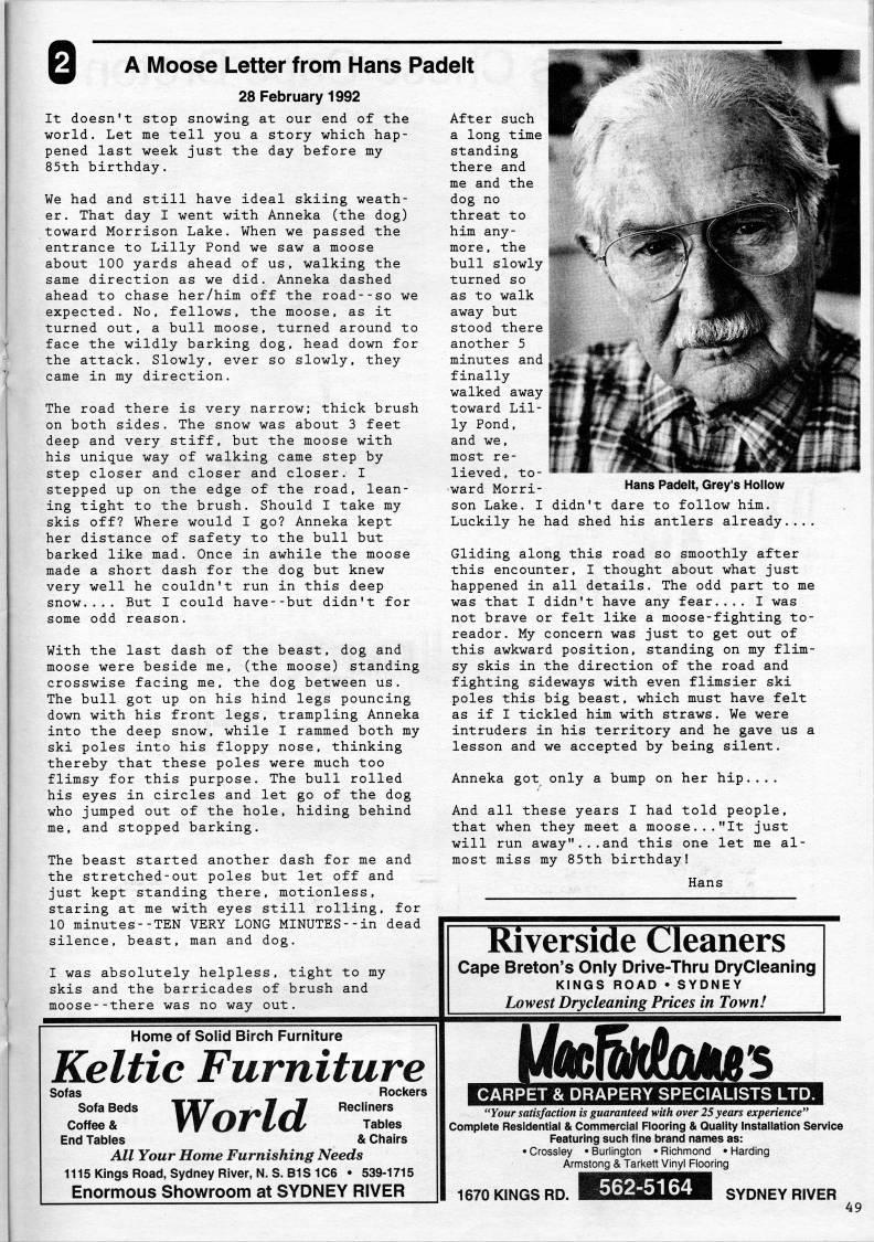 A Moose Letter from Hans Padelt 28 February 1992 It doesn't stop snowing at our end of the world. Let me tell you a story which hap? pened last week just the day before my 85th birthday. We had and still have ideal skiing weath? er. That day I went with Anneka (the dog) toward Morrison Lake. When we passed the entrance to Lilly Pond we saw a moose about 100 yards ahead of us, walking the same direction as we did. Anneka dashed ahead to chase her/him off the road--so we expected. No, fellows, the moose, as it turned out, a bull moose, turned around to face the wildly barking dog, head down for the attack. Slowly, ever so slowly, they came in my direction. The road there is very narrow; thick brush on both sides. The snow was about 3 feet deep and very stiff, but the moose with his unique way of walking came step by step closer and closer and closer. I stepped up on the edge of the road, lean? ing tight to the brush. Should I take my skis off? Where would I go? Anneka kept her distance of safety to the bull but barked like mad. Once in awhile the moose made a short dash for the dog but knew very well he couldn't run in this deep snow.... But I could have--but didn't for some odd reason. With the last dash of the beast, dog and moose were beside me, (the moose) standing crosswise facing me, the dog between us. The bull got up on his hind legs pouncing down with his front legs, trampling Anneka into the deep snow, while I rammed both my ski poles into his floppy nose, thinking thereby that these poles were much too flimsy for this purpose. The bull rolled his eyes in circles and let go of the dog who jumped out of the hole, hiding behind me, and stopped barking. The beast started another dash for me and the stretched-out poles but let off and just kept standing there, motionless, staring at me with eyes still rolling, for 10 minutes--TEN VERY LONG MINUTES--in dead silence, beast, man and dog. I was absolutely helpless, tight to my skis and the barricades of brush and moose--there was no way out. After such a long time standing there and me and the dog no threat to him any? more, the bull slowly turned so as to walk away but stood there another 5 minutes and finally walked away toward Lil? ly Pond, and we, most re? lieved, to? ward Morri? son Lake. I Hans Padelt, Grey's Hollow didn't dare to follow him. Luckily he had shed his antlers already.... Gliding along this road so smoothly after this encounter, I thought about what just happened in all details. The odd part to me was that I didn't have any fear.... I was not brave or felt like a moose-fighting to? reador. My concern was just to get out of this awkward position, standing on my flim? sy skis in the direction of the road and fighting sideways with even flimsier ski poles this big beast, which must have felt as if I tickled him with straws. We were intruders in his territory and he gave us a lesson and we accepted by being silent. Anneka got only a bump on her hip.... And all these years I had told people, that when they meet a moose..."It just will run away"...and this one let me al? most miss my 85th birthday! Hans Riverside Cleaners Cape Breton's Only Drive-Thru DryCleaning KINGS ROAD • SYDNEY Lowest Drycleaning Prices in Town! Home of Solid Birch Furniture Keltic Furniture Sofas Sofa Beds Coffee & End Tables World Rockers Recliners Tables & Chairs All Your Home Furnishing Needs mSKIngsRoad, Sydney River, N.S. BIS 1C6 • 539-1715 Enormous Showroom at SYDNEY RIVER Uui'kkju's CARPET & DRAPERY SPECIALISTS LTD. Your satisfaction is guaranteed with over 25 years experience" Complete Residential & Commercial Flooring & Quality Installation Service Featuring sucii fine brand names as: • Crossley • Burlington • Richmond • Harding Armstong & Tarkett Vinyl Flooring 1670 KINGS RD. 562-5164 SYDNEY RIVER
