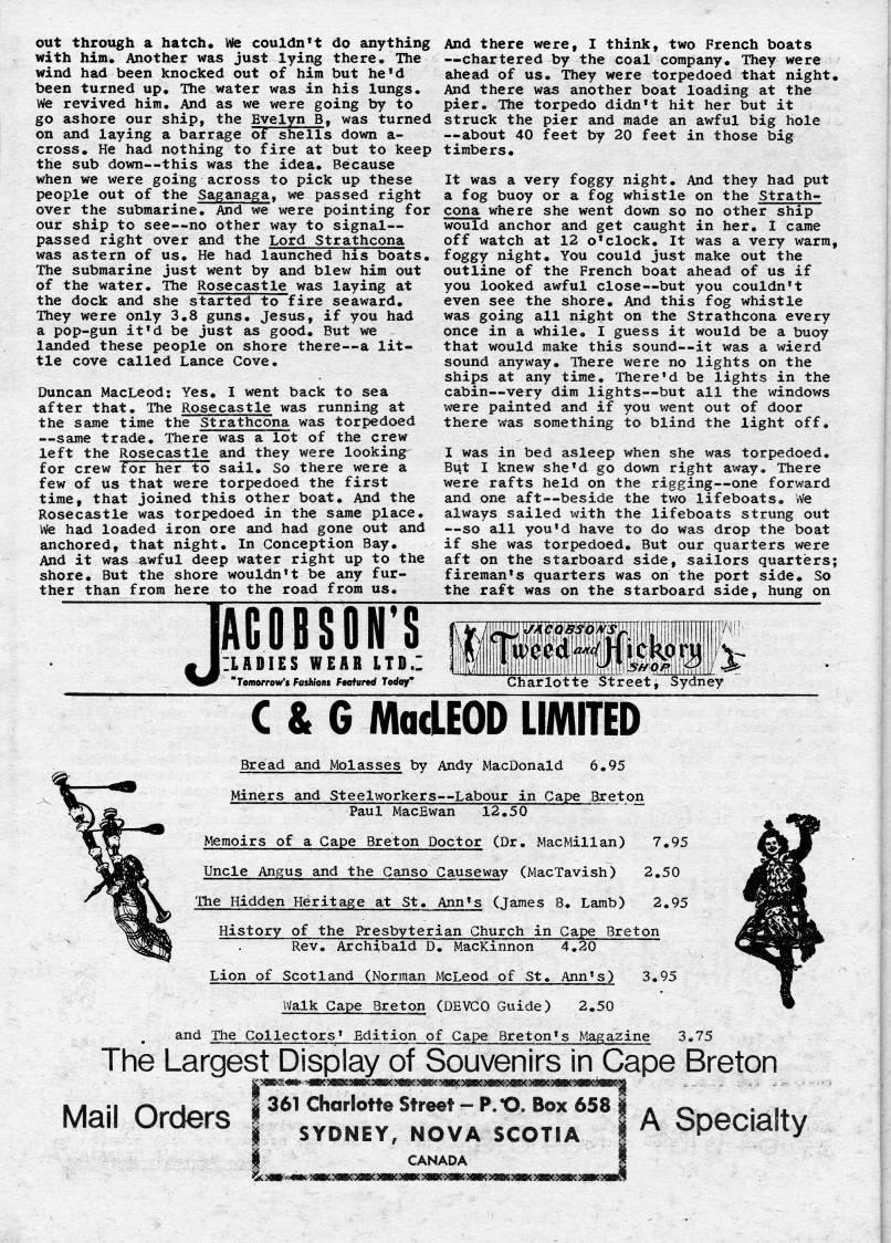 Published by Ronald Caplan on 1976/6/1 (467 reads)out through a hatch, we couldn't do anything with him. Another was just lying there. The wind had been knocked out of him but he'd been turned up. The water was in his lungs. We revived him. And as we were going by to go ashore our ship, the Evelyn B, was turned on and laying a barrage of shells down a- cross. He had nothing to fire at but to keep the sub down • this was the idea. Because when we were going across to pick up these people out of the Saganaga, we passed right over the submarine. And we were pointing for our ship to see • no other way to signal • passed right over and the Lord Strathcona was astern of us. He had launched his boats. The submarine just went by and blew him out of the water. The Rosecastle was laying at the dock and she started to fire seaward. They were only 3.8 guns. Jesus, if you had a pop-gun it'd be just as good. But we landed these people on shore there • a lit? tle cove called Lance Cove. Duncan MacLeod: Yes. I went back to sea after that. The Rosecastle was running at the same time the Strathcona was torpedoed • same trade. There was a lot of the crew left the Rosecastle and they were looking for crew for her to sail. So there were a few of us that were torpedoed the first time, that joined this other boat. And the Rosecastle was torpedoed in the same place. We had loaded iron ore and had gone out and anchored, that night. In Conception Bay. And it was awful deep water right up to the shore. But the shore wouldn't be any fur? ther than from here to the road from us. And there were, I think, two French boats • chartered by the coal company. They were ahead of us. They were torpedoed that night. And there was another boat loading at the pier. The torpedo didn't hit her but it struck the pier and made an awful big hole • about 40 feet by 20 feet in those big timbers. It was a very foggy night. And they had put a fog buoy or a fog whistle on the Strath? cona where she went down so no other ship would anchor and get caught in her. I came off watch at 12 o'clock. It was a very warm, foggy night. You could just make out the outline of the French boat ahead of us if you looked awful close • but you couldn't even see the shore. And this fog whistle was going all night on the Strathcona every once in a while. I guess it would be a buoy that would raake this sound • it was a wierd sound anyway. There were no lights on the ships at any time. There'd be lights in the cabin • very dim lights • but all the windows were painted and if you went out of door there was something to blind the light off. I was in bed asleep when she was torpedoed. But I knew she'd go down right away. There were rafts held on the rigging • one forward and one aft • beside the two lifeboats. We always sailed with the lifeboats strung out • so all you'd have to do was drop the boat if she was torpedoed. But our quarters were aft on the starboard side, sailors quarters; fireman's quarters was on the port side. So the raft was on the starboard side, hung on ACOBSON'S ILADIES WEAR LTD.! "Tomof row's Fashions Feofured Todoy" Charlotte Street, Sydney C & G MadEOD LIMITED Bread and Molasses by Andy MacDonald 6.95 Miners and Steelworkers • Labour in Cape Breton Paul MacEwan 12.50 Memoirs of a Cape Breton Doctor (Dr. MacMillan) 7.95 Uncle Angus and the Canso Causeway (MacTavish) 2.50 The Hidden Heritage at St. Ann's (James B. Lamb) 2.95 History of the Presbyterian Church in Cape Breton Rev. Archibald D. MacKinnon 4.20 Lion of Scotland (Norman McLeod of St. Ann's) 3.95 Walk Cape Breton (DEVCO Guide) 2.50 and The Collectors' Edition of Gape Breton's Magazine 3.75 The Largest Display of Souvenirs in Cape Breton Mail Orders 361 Charlotte Street - P.t>. Box 658 SYDNEY, NOVA SCOTIA CANADA A Specialty