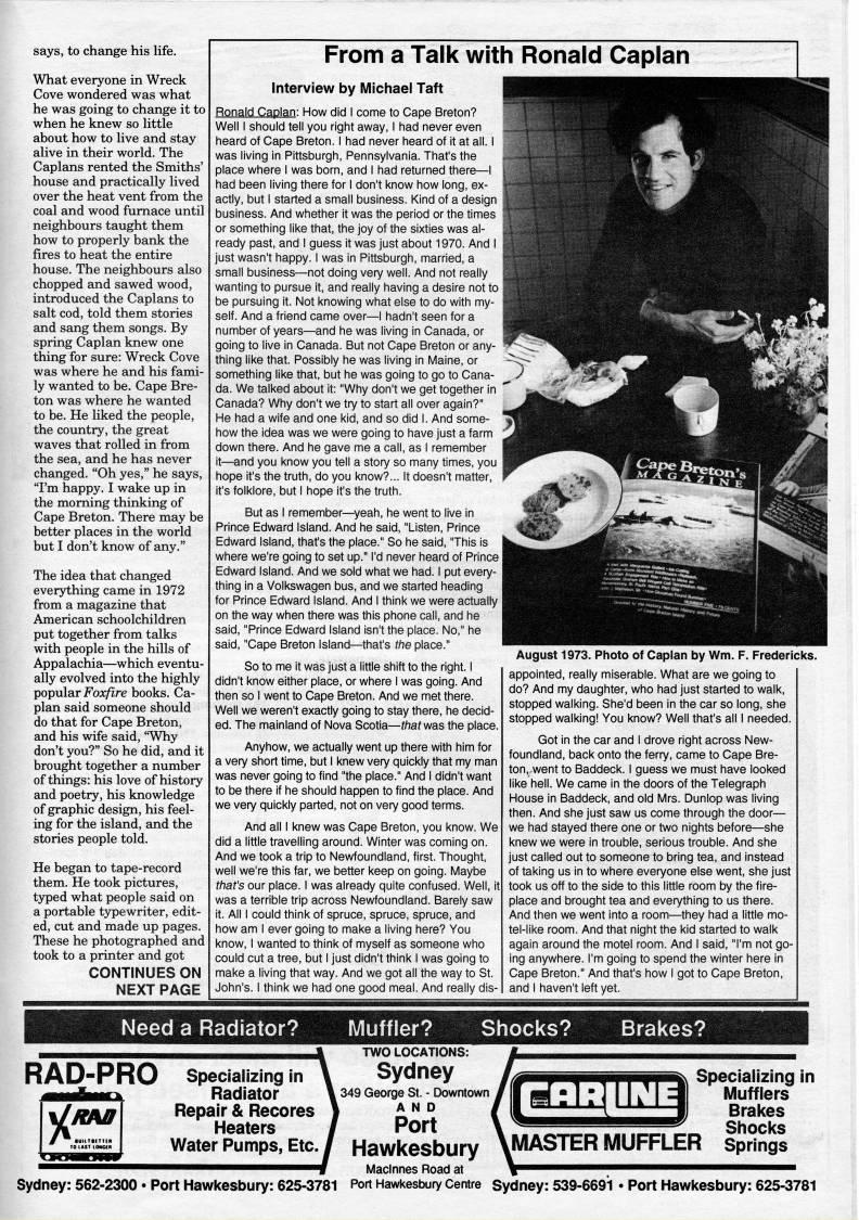 says, to change his life. What everyone in Wreck Cove wondered was what he was going to change it to when he knew so little about how to live and stay alive in their world. The Caplans rented the Smiths' house and practically lived over the heat vent from the coal and wood fumace until neighbours taught them how to properly bank the fires to heat the entire house. The neighbours also chopped and sawed wood, introduced the Caplans to salt cod, told them stories and sang them songs. By spring Caplan knew one thing for sure: Wreck Cove was where he and his fami? ly wanted to be. Cape Bre? ton was where he wanted to be. He liked the people, the country, the great waves that rolled in from the sea, and he has never changed. "Oh yes," he says, "I'm happy. I wake up in the moming thinking of Cape Breton. There may be better places in the world but I don't know of any." The idea that changed everything came in 1972 from a magazine that American schoolchildren put together from talks with people in the hills of Appalachia • which eventu? ally evolved into the highly popular Fox/ire books. Ca? plan said someone should do that for Cape Breton, and his wife said, "Why don't you?" So he did, and it brought together a number of things: his love of history and poetry, his knowledge of graphic design, his feel? ing for the island, and the stories people told. He began to tape-record them. He took pictures, typed what people said on a portable typewriter, edit? ed, cut and made up pages. These he photographed and took to a printer and got CONTINUES ON NEXT PAGE From a Talk with Ronald Caplan Interview by Michael Taft Ronald Caplan: How did I come to Cape Breton? Well I should tell you right away, I had never even heard of Cape Breton. I had never heard of it at all. I was living in Pittsburgh, Pennsylvania. That's the place where I was born, and I had returned there • I had been living there for I don't know how long, ex? actly, but I started a small business. Kind of a design business. And whether it was the period or the times or something like that, the joy of the sixties was al? ready past, and I guess it was just about 1970. And I just wasn't happy. I was in Pittsburgh, married, a small business • not doing very well. And not really wanting to pursue it, and really having a desire not to be pursuing it. Not knowing what else to do with my? self. And a friend came over • I hadn't seen for a number of years • and he was living in Canada, or going to live in Canada. But not Cape Breton or any? thing like that. Possibly he was living in Maine, or something like that, but he was going to go to Cana? da. We talked about it: "Why don't we get together in Canada? Why don't we try to start all over again?" He had a wife and one kid, and so did I. And some? how the idea was we were going to have just a farm down there. And he gave me a call, as I remember it • and you know you tell a story so many times, you hope it's the truth, do you know?... It doesn't matter, it's folklore, but I hope it's the truth. But as I remember • yeah, he went to live in Prince Edward Island. And he said, "Listen, Prince Edward Island, that's the place." So he said, "This is where we're going to set up." I'd never heard of Prince Edward Island. And we sold what we had. I put every? thing in a Volkswagen bus, and we started heading for Prince Edward Island. And I think we were actually on the way when there was this phone call, and he said, "Prince Edward Island isn't the place. No," he said, "Cape Breton Island • that's ttie place." So to me it was just a little shift to the right. I didn't know either place, or where I was going. And then so I went to Cape Breton. And we met there. Well we weren't exactly going to stay there, he decid? ed. The mainland of Nova Scotia • that was the place. Anyhow, we actually went up there with him for a very short time, but I knew very quickly that my man was never going to find "the place." And I didn't want to be there if he should happen to find the place. And we very quickly parted, not on very good terms. And all I knew was Cape Breton, you know. We did a little travelling around. Winter was coming on. And we took a trip to Newfoundland, first. Thought, well we're this far, we better keep on going. Maybe that's our place. I was already quite confused. Well, it was a terrible trip across Newfoundland. Barely saw it. All I could think of spruce, spruce, spruce, and how am I ever going to make a living here? You know, I wanted to think of myself as someone who could cut a tree, but I just didn't think I was going to make a living that way. And we got all the way to St. John's. I think we had one good meal. And really dis- August 1973. Photo of Caplan by Wm. F. Fredericks. appointed, really miserable. What are we going to do? And my daughter, who had just started to walk, stopped walking. She'd been in the car so long, she stopped walking! You know? Well that's all I needed. Got in the car and I drove right across New? foundland, back onto the ferry, came to Cape Bre- ton,,went to Baddeck. I guess we must have looked like hell. We came in the doors of the Telegraph House in Baddeck, and old Mrs. Dunlop was living then. And she just saw us come through the door • we had stayed there one or two nights before • she knew we were in trouble, serious trouble. And she just called out to someone to bring tea, and instead of taking us in to where everyone else went, she just took us off to the side to this little room by the fire? place and brought tea and everything to us there. And then we went into a room • they had a little mo? tel-like room. And that night the kid started to walk again around the motel room. And I said, "I'm not go? ing anywhere. I'm going to spend the winter here in Cape Breton." And that's how I got to Cape Breton, and I haven't left yet. Need a Radiator? Muffler? Shocks? Brakes? RAD-PRO Specializing in Radiator Repair & Recores Heaters Water Pumps, Etc. TWO