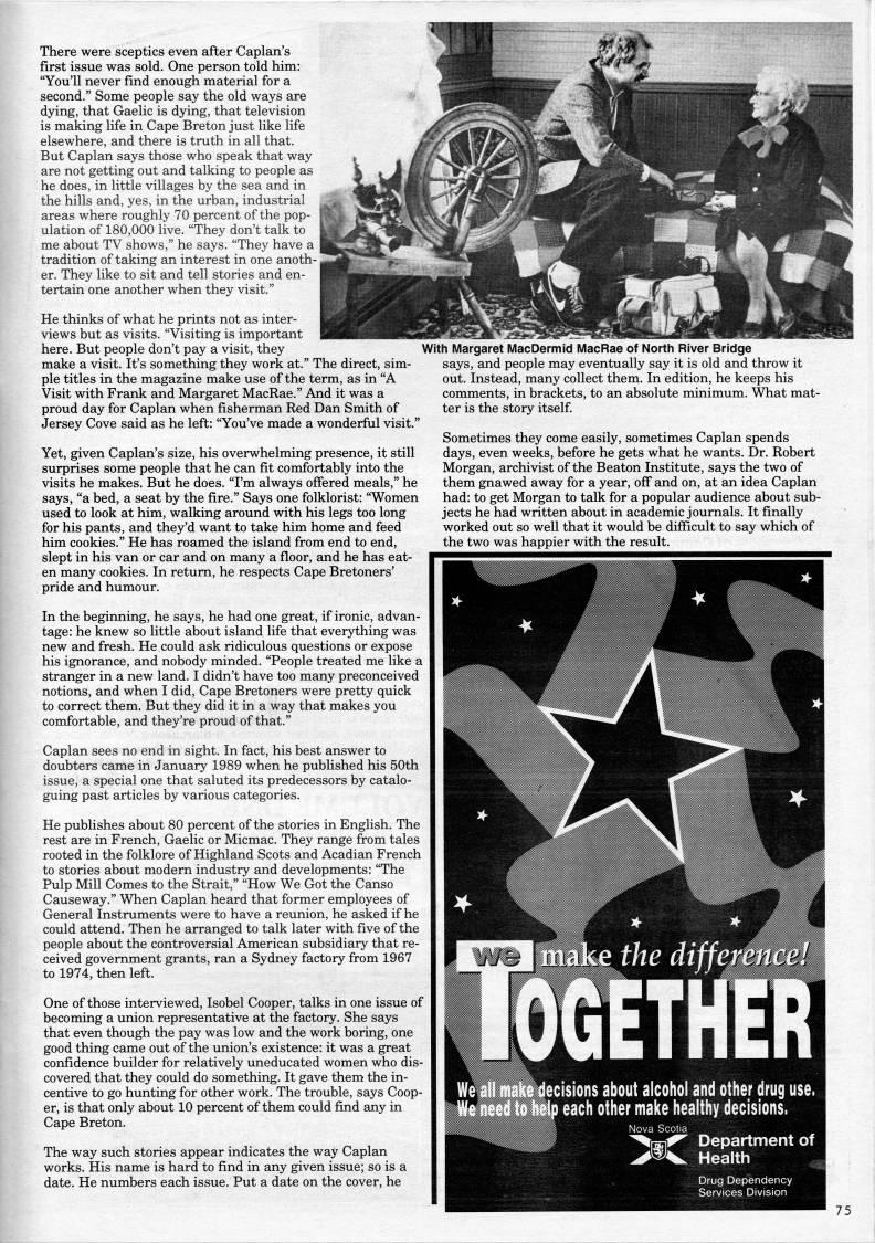 There were sceptics even after Caplan's first issue was sold. One person told him: "You'll never find enough material for a second." Some people say the old ways are dying, that Gaelic is dying, that television is making life in Cape Breton just like life elsewhere, and there is truth in all that. But Caplan says those who speak that way are not getting out and talking to people as he does, in little villages by the sea and in the hills and, yes, in the urban, industrial areas where roughly 70 percent of the pop? ulation of 180,000 live. "They don't talk to me about TV shows," he says. "They have a tradition of taking an interest in one anoth? er. They like to sit and tell stories and en? tertain one another when they visit." He thinks of what he prints not as inter? views but as visits. "Visiting is important here. But people don't pay a visit, they make a visit. It's something they work at." The direct, sim? ple titles in the magazine make use of the term, as in "A Visit with Frank and Margaret MacRae." And it was a proud day for Caplan when fisherman Red Dan Smith of Jersey Cove said as he left: "You've made a wonderful visit." Yet, given Caplan's size, his overwhelming presence, it still surprises some people that he can fit comfortably into the visits he makes. But he does. "I'm always offered meals," he says, "a bed, a seat by the fire." Says one folklorist: "Women used to look at him, walking around with his legs too long for his pants, and they'd want to take him home and feed him cookies." He has roamed the island from end to end, slept in his van or car and on many a floor, and he has eat? en many cookies. In retum, he respects Cape Bretoners' pride and humour. In the beginning, he says, he had one great, if ironic, advan? tage: he knew so little about island life that everything was new and fresh. He could ask ridiculous questions or expose his ignorance, and nobody minded. "People treated me like a stranger in a new land. I didn't have too many preconceived notions, and when I did, Cape Bretoners were pretty quick to correct them. But they did it in a way that makes you comfortable, and they're proud of that." Caplan sees no end in sight. In fact, his best answer to doubters came in January 1989 when he published his 50th issue, a special one that saluted its predecessors by catalo? guing past articles by various categories. He publishes about 80 percent of the stories in English. The rest are in French, Gaelic or Micmac. They range from tales rooted in the folklore of Highland Scots and Acadian French to stories about modem industry and developments: "The Pulp Mill Comes to the Strait," "How We Got the Canso Causeway." When Caplan heard that former employees of General Instruments were to have a reunion, he asked if he could attend. Then he arranged to talk later with five of the people about the controversial American subsidiary that re? ceived government grants, ran a Sydney factory from 1967 to 1974, then left. One of those interviewed, Isobel Cooper, talks in one issue of becoming a union representative at the factory. She says that even though the pay was low and the work boring, one good thing came out of the union's existence: it was a great confidence builder for relatively uneducated women who dis? covered that they could do something. It gave them the in? centive to go hunting for other work. The trouble, says Coop? er, is that only about 10 percent of them could find any in Cape Breton. The way such stories appear indicates the way Caplan works. His name is hard to find in any given issue; so is a date. He numbers each issue. Put a date on the cover, he With Margaret MacDermid MacRae of North River Bridge says, and people may eventually say it is old and throw it out. Instead, many collect them. In edition, he keeps his comments, in brackets, to an absolute minimum. What mat? ter is the story itself Sometimes they come easily, sometimes Caplan spends days, even weeks, before he gets what he wants. Dr. Robert Morgan, archivist of the Beaton Institute, says the two of them gnawed away for a year, off and on, at an idea Caplan had: to get Morgan to talk for a popular audience about sub? jects he had written about in academic journals. It finally worked out so well that it would be difficult to say which of the two was happier with the result. WJ'