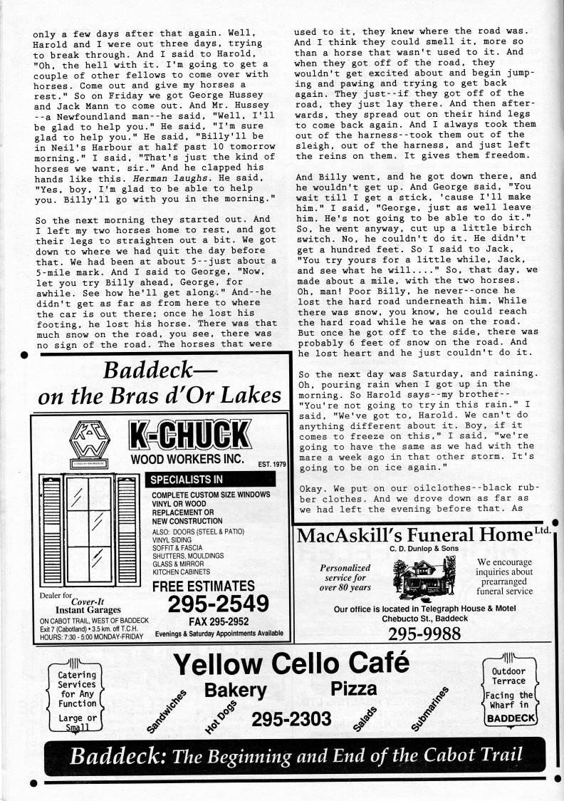 Published by Ronald Caplan on 1993/1/1 (224 reads)only a few days after that again. Well, Harold and I were out three days, trying to break through. And I said to Harold, "Oh, the hell with it. I'm going to get a couple of other fellows to come over with horses. Come out and give my horses a rest." So on Friday we got George Hussey and Jack Mann to come out. And Mr. Hussey --a Newfoundland man--he said, "Well, I'll be glad to help you." He said, "I'm sure glad to help you." He said, "Billy'11 be in Neil's Harbour at half past 10 tomorrow morning." I said, "That's just the kind of horses we want, sir." And he clapped his hands like this. Herman laughs. He said, "Yes, boy, I'm glad to be able to help you. Billy'11 go with you in the morning." So the next morning they started out. And I left my two horses home to rest, and got their legs to straighten out a bit. We got down to where we had quit the day before that. We had been at about 5--just about a 5-mile mark. And I said to George, "Now, let you try Billy ahead, George, for awhile. See how he'll get along." And--he didn't get as far as from here to where the car is out there; once he lost his footing, he lost his horse. There was that much snow on the road, you see, there was no sign of the road. The horses that were Baddeck • on the Bras d'Or Lakes iii::iii3:. 1/ / A MnuM'} Dealer for Cover-It Instant Garages ON CABOT TRAIL. WEST OF BADDECK Exit 7 (Cabotland) • 3.5 km. off T.C.H. HOURS: 7;30 - 5:00 MONDAY-FRIDAY WOOD WORKERS INC. SPECIALISTS IN COMPLETE CUSTOM SIZE WINDOWS VINYL OR WOOD REPLACEMENT OR NEW CONSTRUCTION ALSO: DOORS (STEEL & PATIO) VINYL SIDING SOFFIT & FASCIA SHUTTERS, MOULDINGS GLASS & MIRROR KITCHEN CABINETS FREE ESTIMATES 295-2549 FAX 295-2952 Evenings & Saturday Appointments Available used to it, they knew where the road was. And I think they could smell it, more so than a horse that wasn't used to it. And when they got off of the road, they wouldn't get excited about and begin jump? ing and pawing and trying to get back again. They just--if they got off of the road, they just lay there. And then after? wards, they spread out on their hind legs to come back again. And I always took them out of the harness--took them out of the sleigh, out of the harness, and just left the reins on them. It gives them freedom. And Billy went, and he got down there, and he wouldn't get up. And George said, "You wait till I get a stick, 'cause I'll make him." I said, "George, just as well leave him. He's not going to be able to do it." So, he went anyway, cut up a little birch switch. No, he couldn't do it. He didn't get a hundred feet. So I said to Jack, "You try yours for a little while. Jack, and see what he will...." So, that day, we made about a mile, with the two horses. Oh, man! Poor Billy, he never--once he lost the hard road underneath him. While there was snow, you know, he could reach the hard road while he was on the road. But once he got off to the side, there was probably 6 feet of snow on the road. And he lost heart and he just couldn't do it. So the next day was Saturday, and raining. Oh, pouring rain when I got up in the morning. So Harold says--my brother-- "You're not going to try in this rain." I said, "We've got to, Harold. We can't do anything different about it. Boy, if it comes to freeze on this," I said, "we're going to have the same as we had with the mare a week ago in that other storm. It's going to be on ice again." Okay. We put on our oilclothes--black rub? ber clothes. And we drove down as far as we had left the evening before that. As MacAskilFs Funeral Home Ltd., C. D. Duniop & Sons Personalized service for over 80 years We encourage inquiries about prearranged funeral service Our office is located in Telegraph House & Motel Chebucto St., Baddeck 295-9988 Catering Services I for Any Functioni Large or I Yellow Cello Cafe Bakery Pizza 295-2303 ' ' Outdoor J Terrace l jFacing the( < Wharf in > [baddeck] Baddeck: The Beginning and End of the Cabot Trail